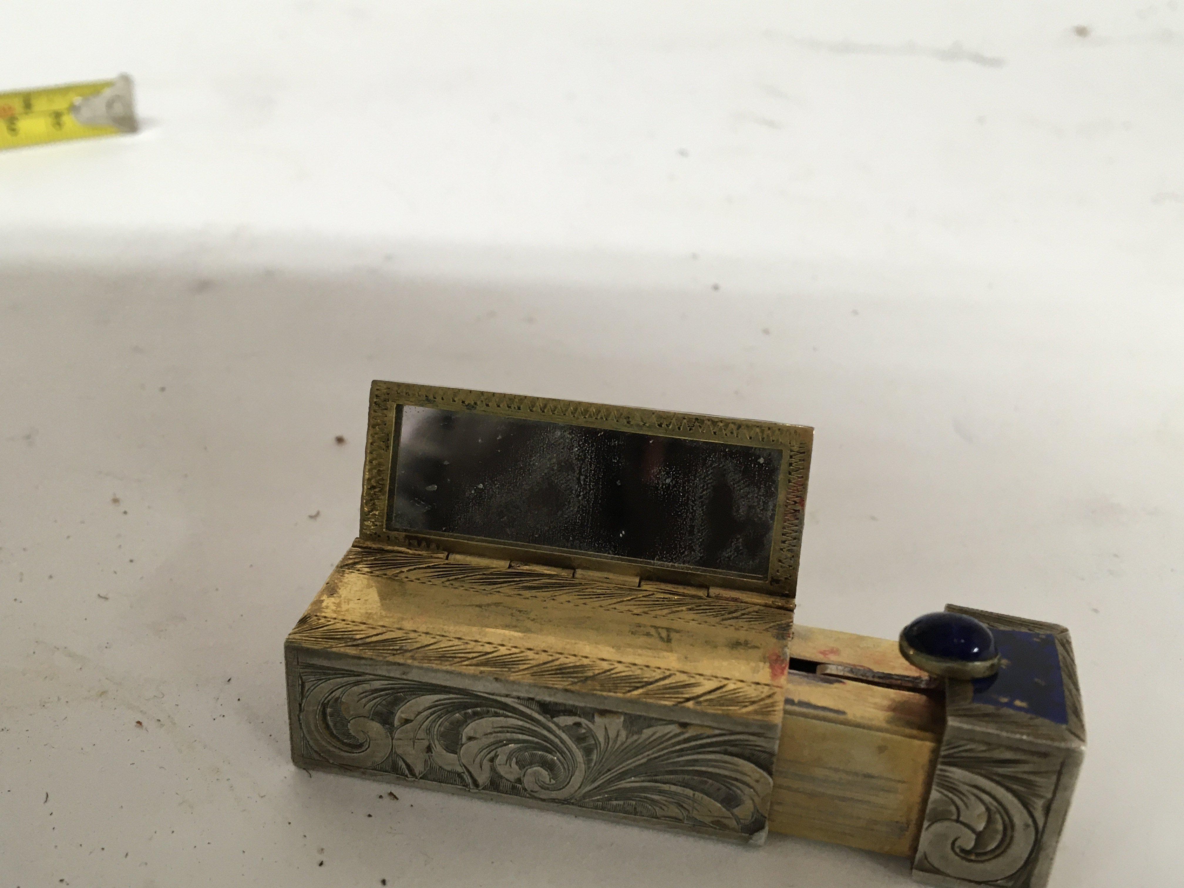 A Quality Continental silver (800) lipstick holder decorated with an enamel oval with figures and engraved silver parcel gilt interior with a spring loaded mirror. Length 6cm