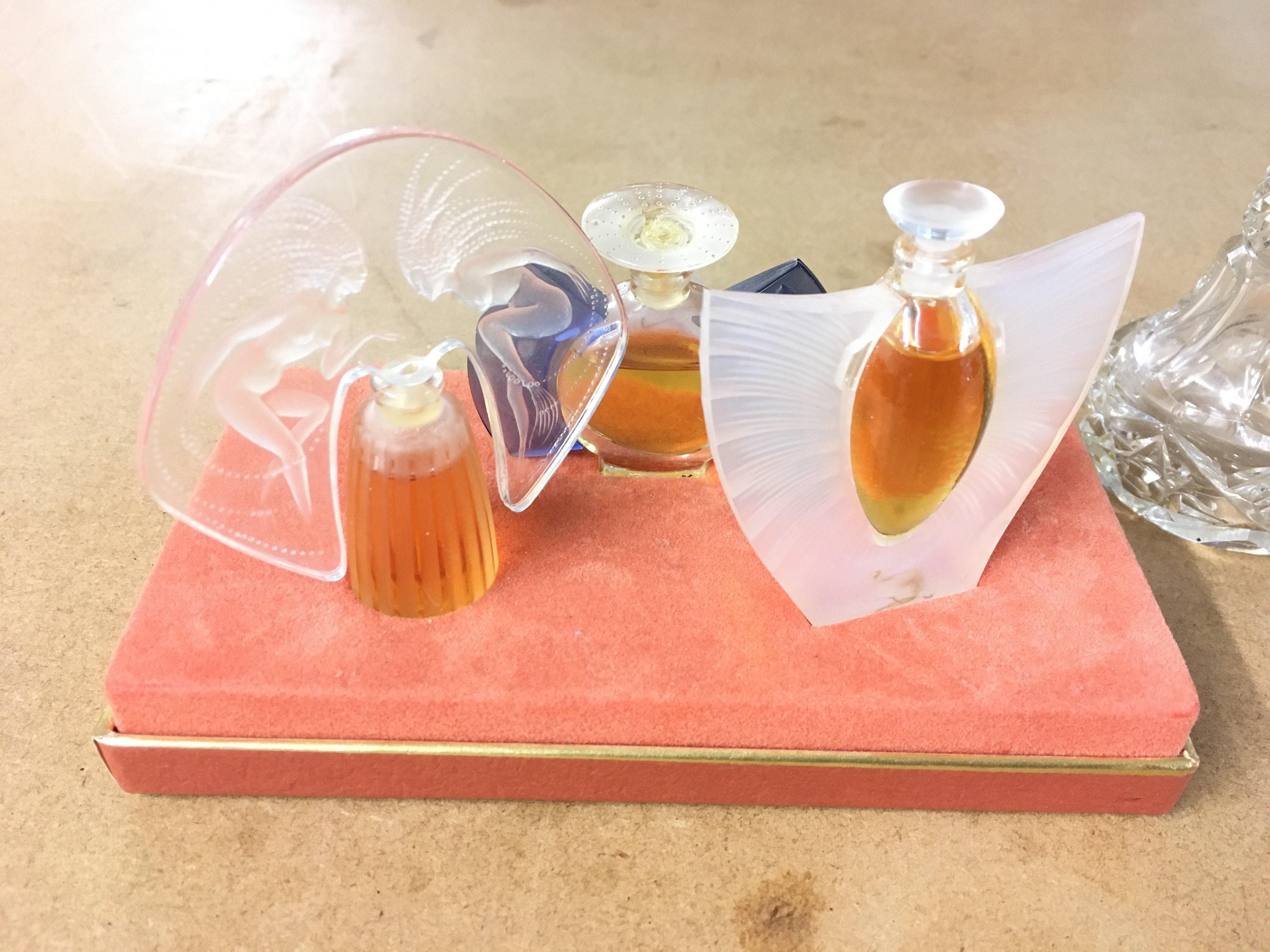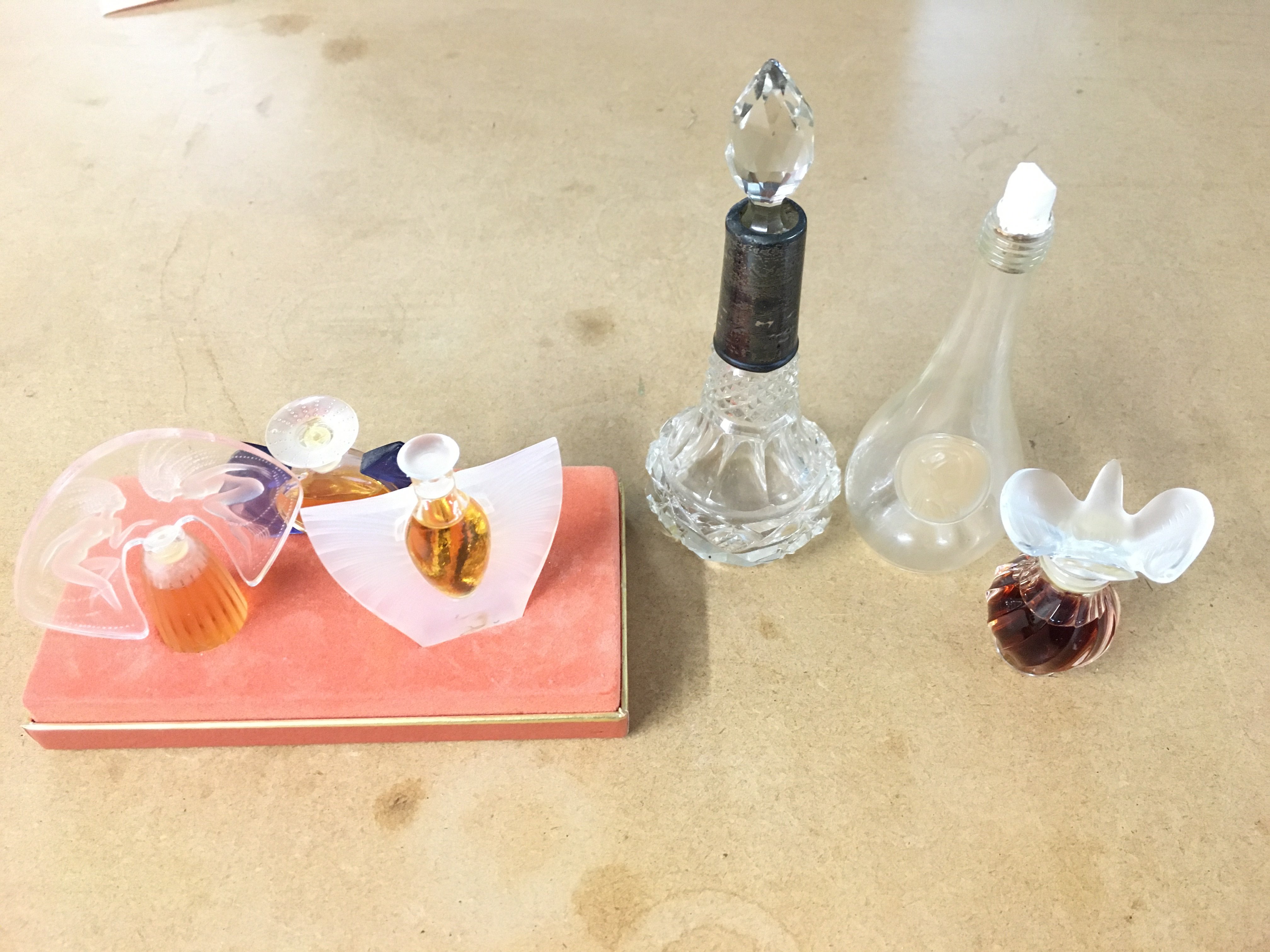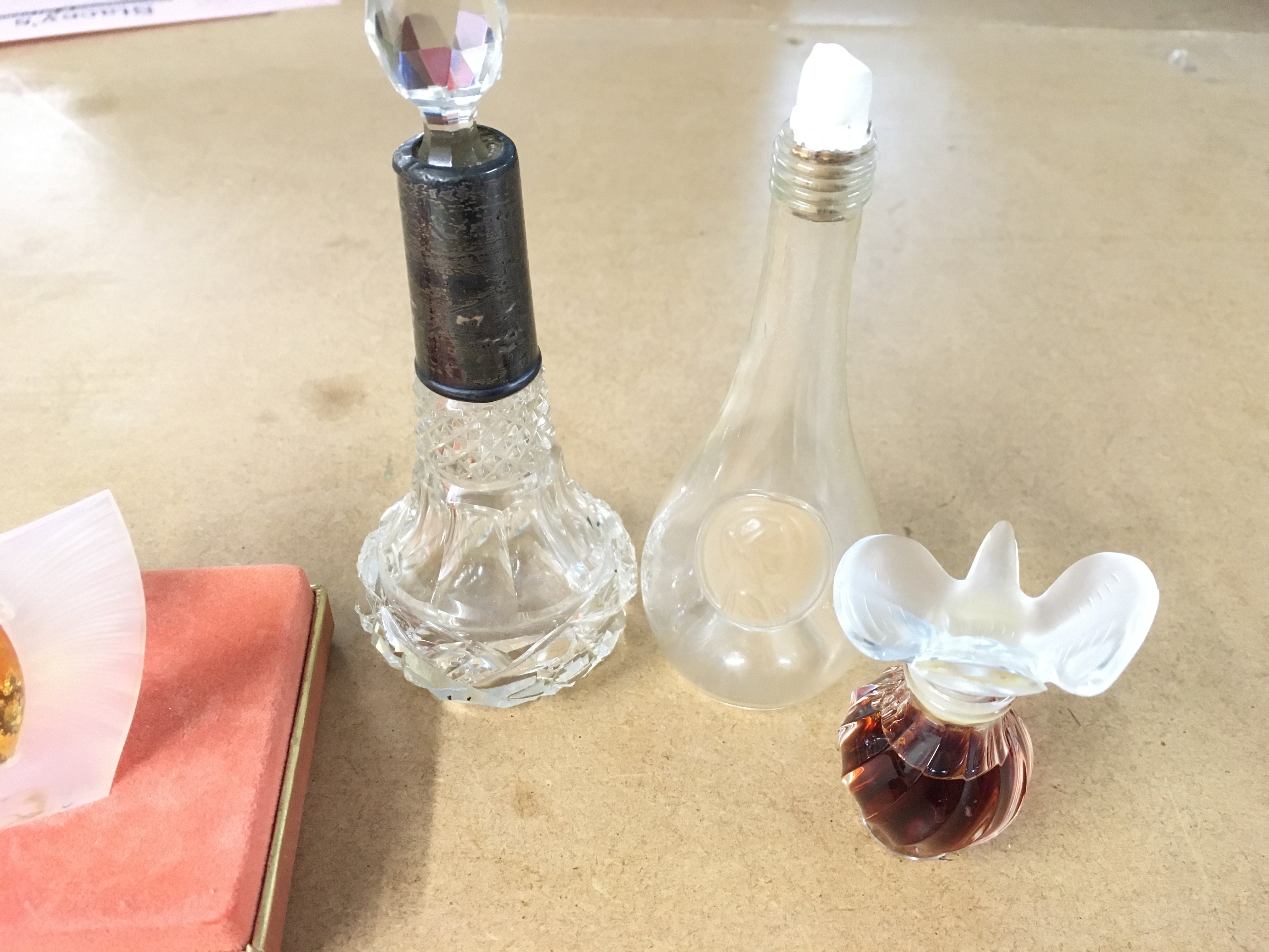 A Rene Lalique St Odile fruit liqueur bottle miniature early 1920s together with Lalique miniatures perfume bottles and early 20th century cut glass silver collared scent bottle.