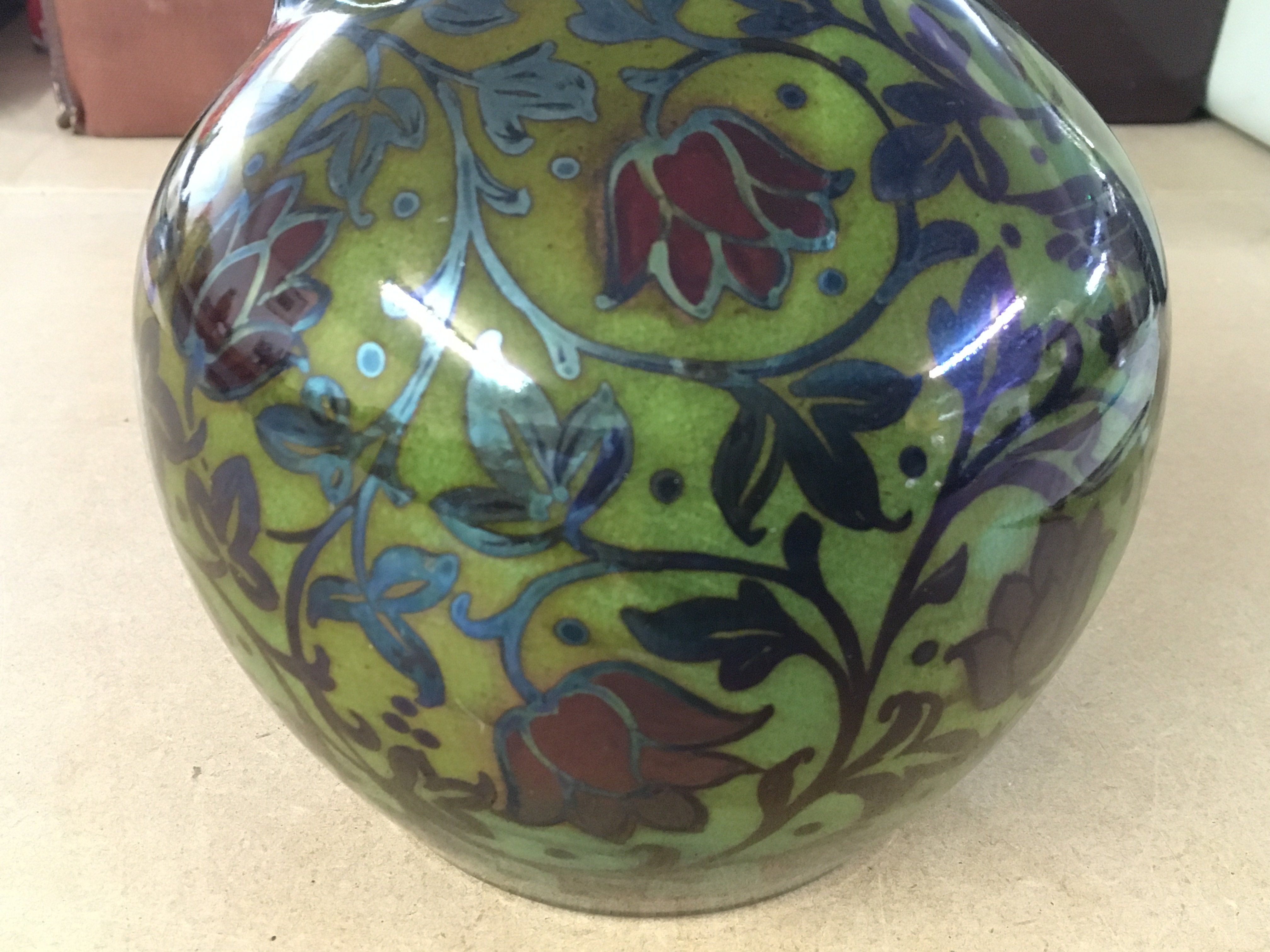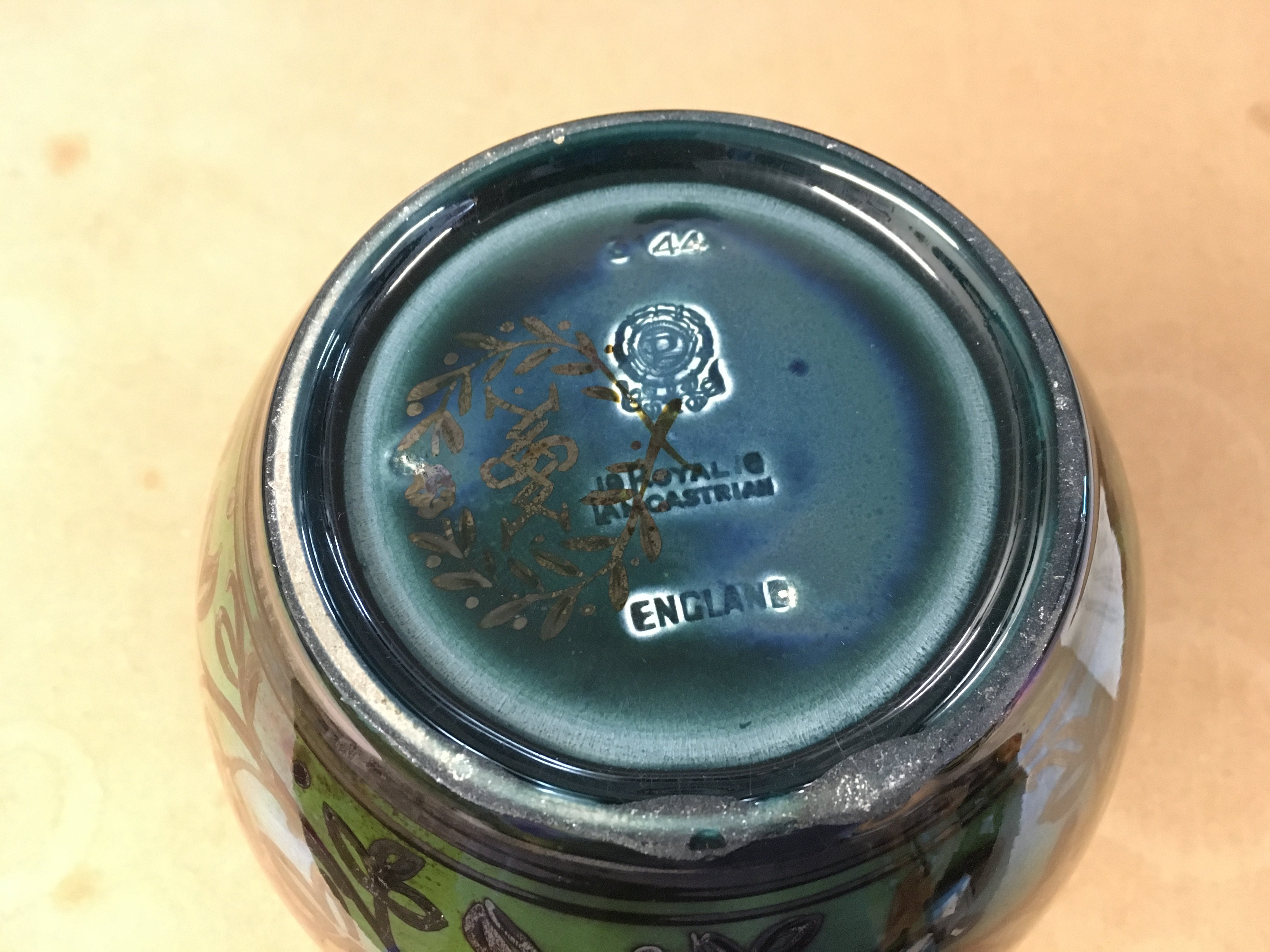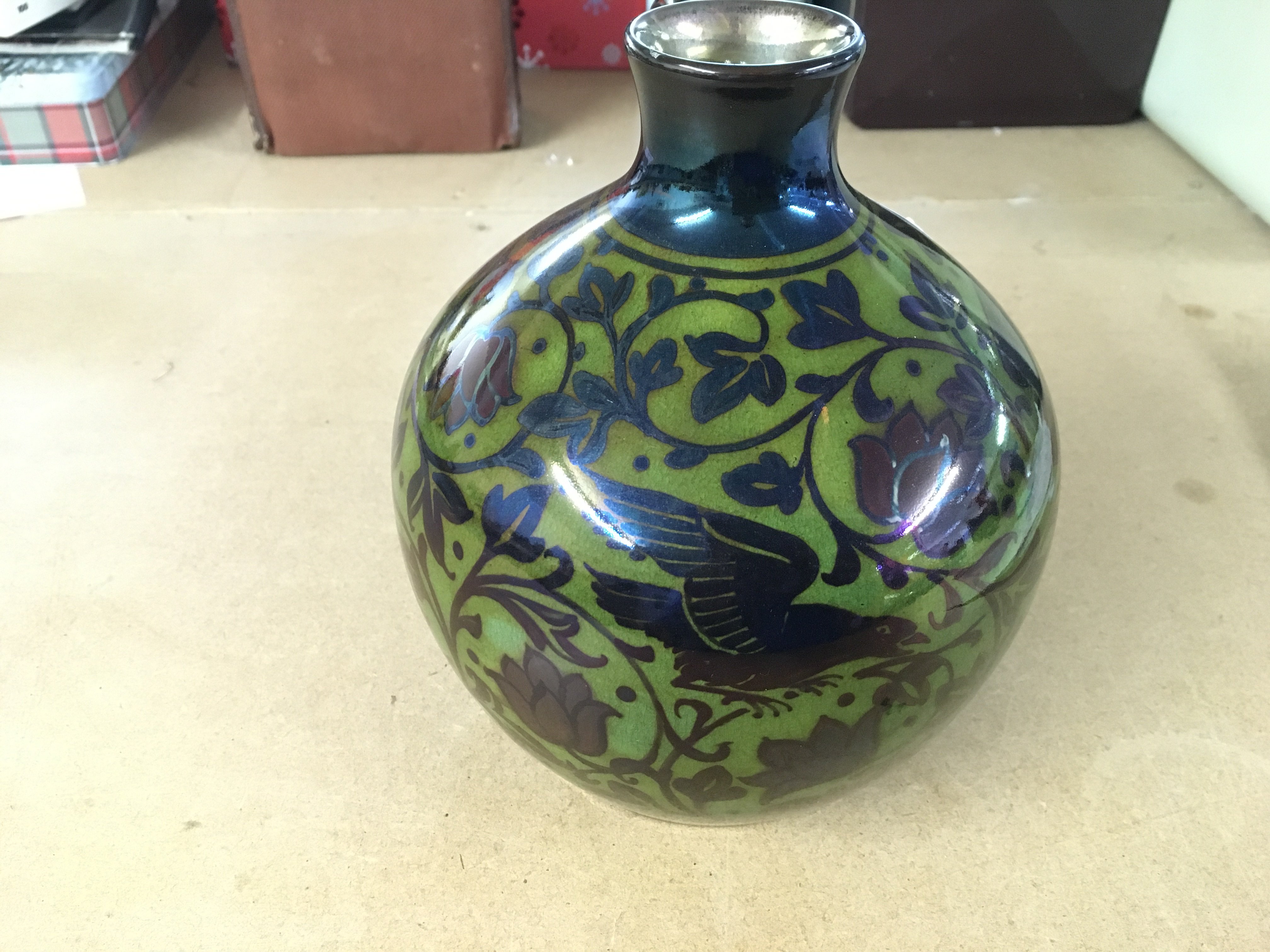 William S Mycock Pilkington Royal Lancastrian lustre base with 2 birds amongst foliage is silver luster with red flowers against a yellow Green ground. On closer inspection there is a small chip and hairline approximately 2 inches from the top rim to the bottom