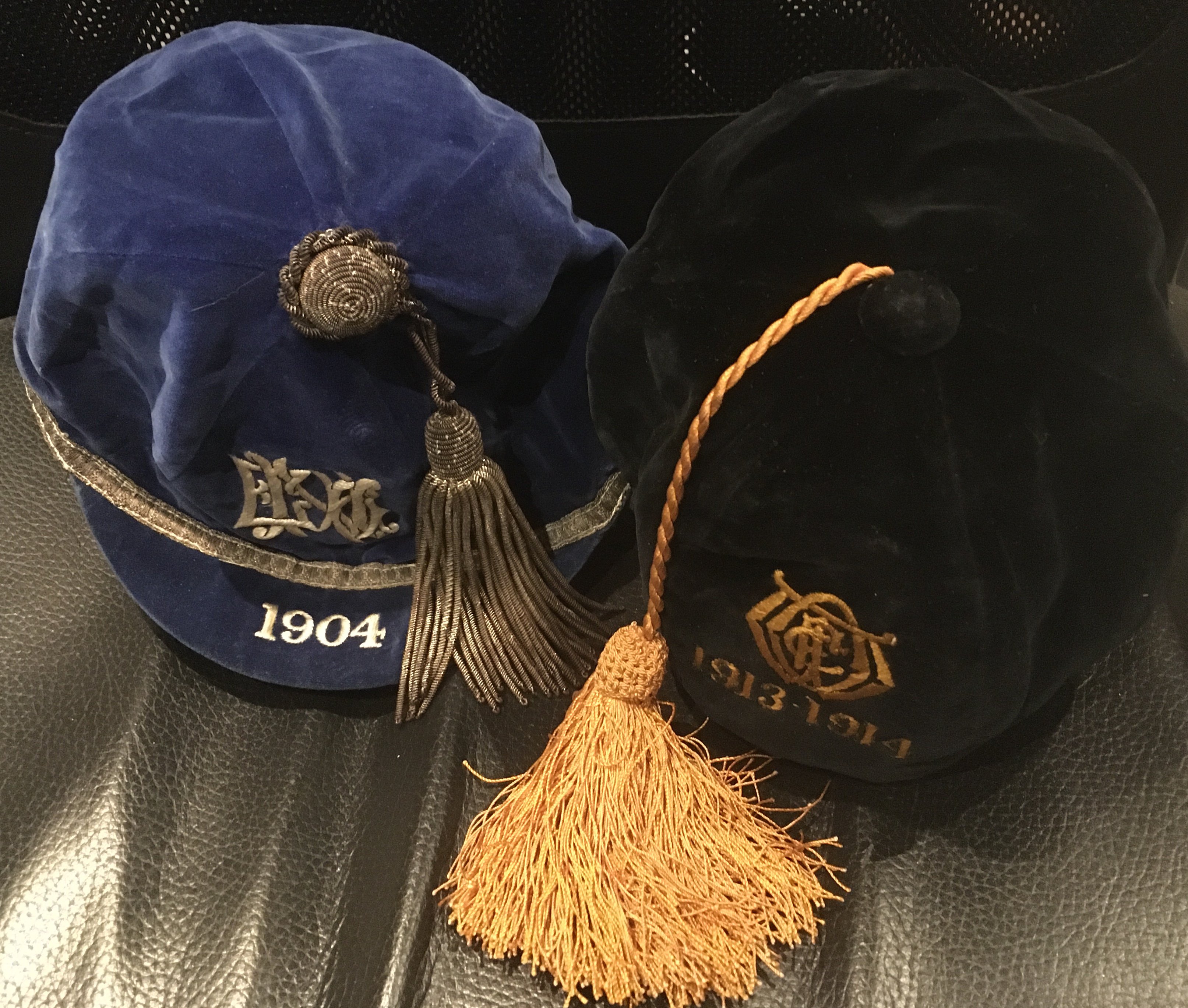 Pre 1st World War Sporting Caps: Two different tasseled caps awarded to Ron Smith in 1904 and 1913/14. Very good. (2)