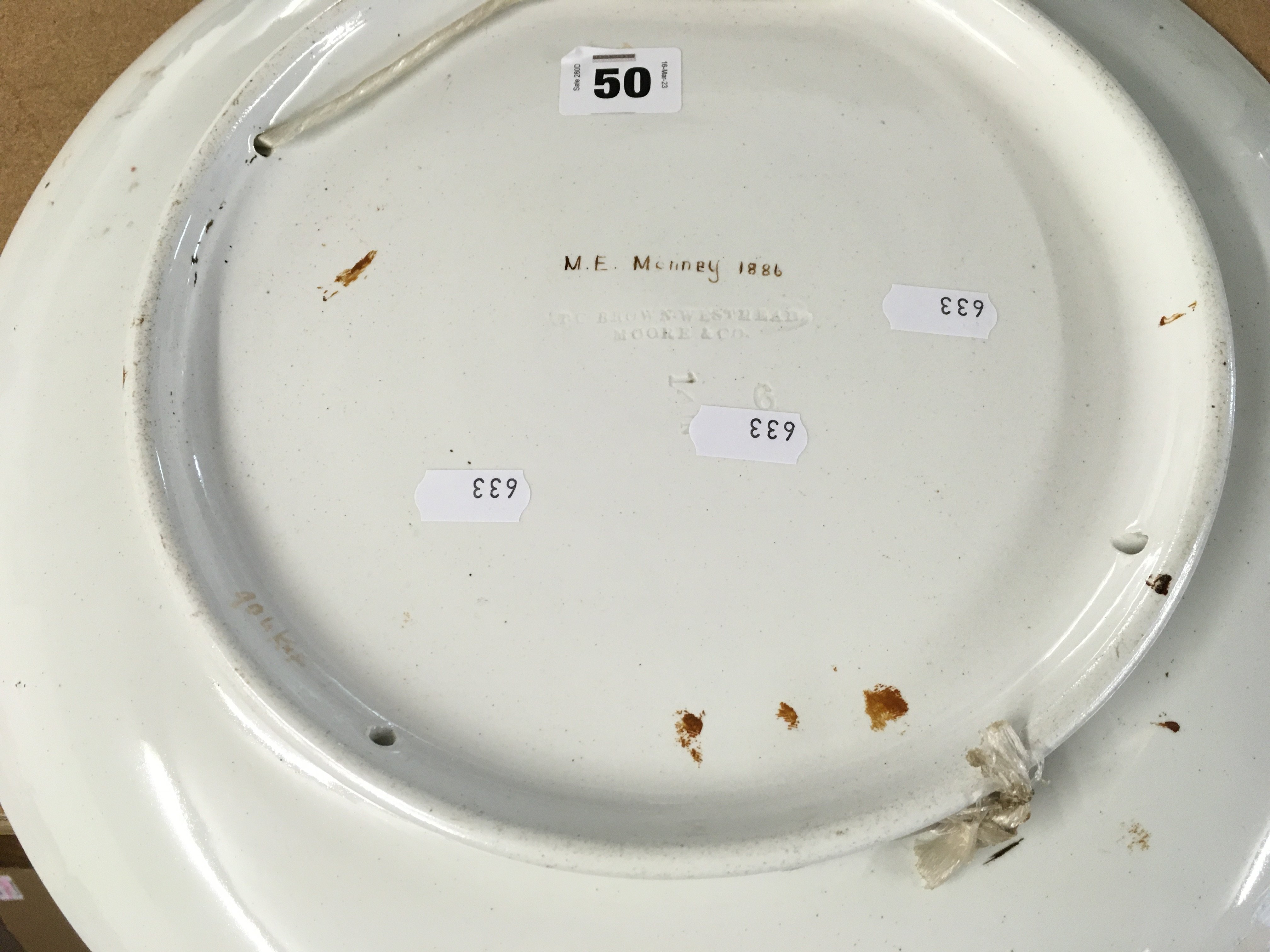 Moore & Co late 19th century charger in the arts and crafts style decorated with a hand painted portrait of a lady with a yellow flower in her hair. Impressed Brown westhead moore and co. Diameter 37cm.