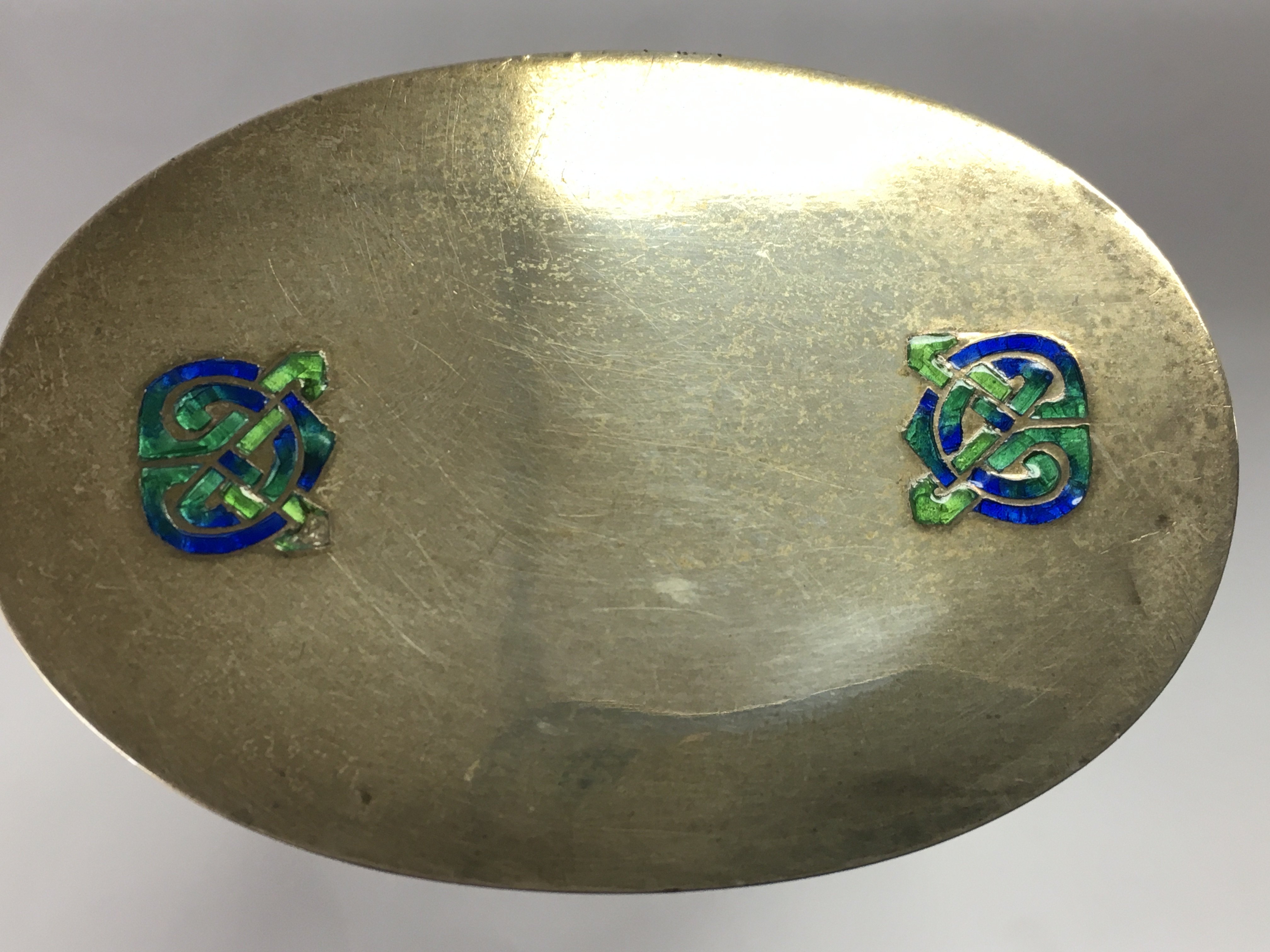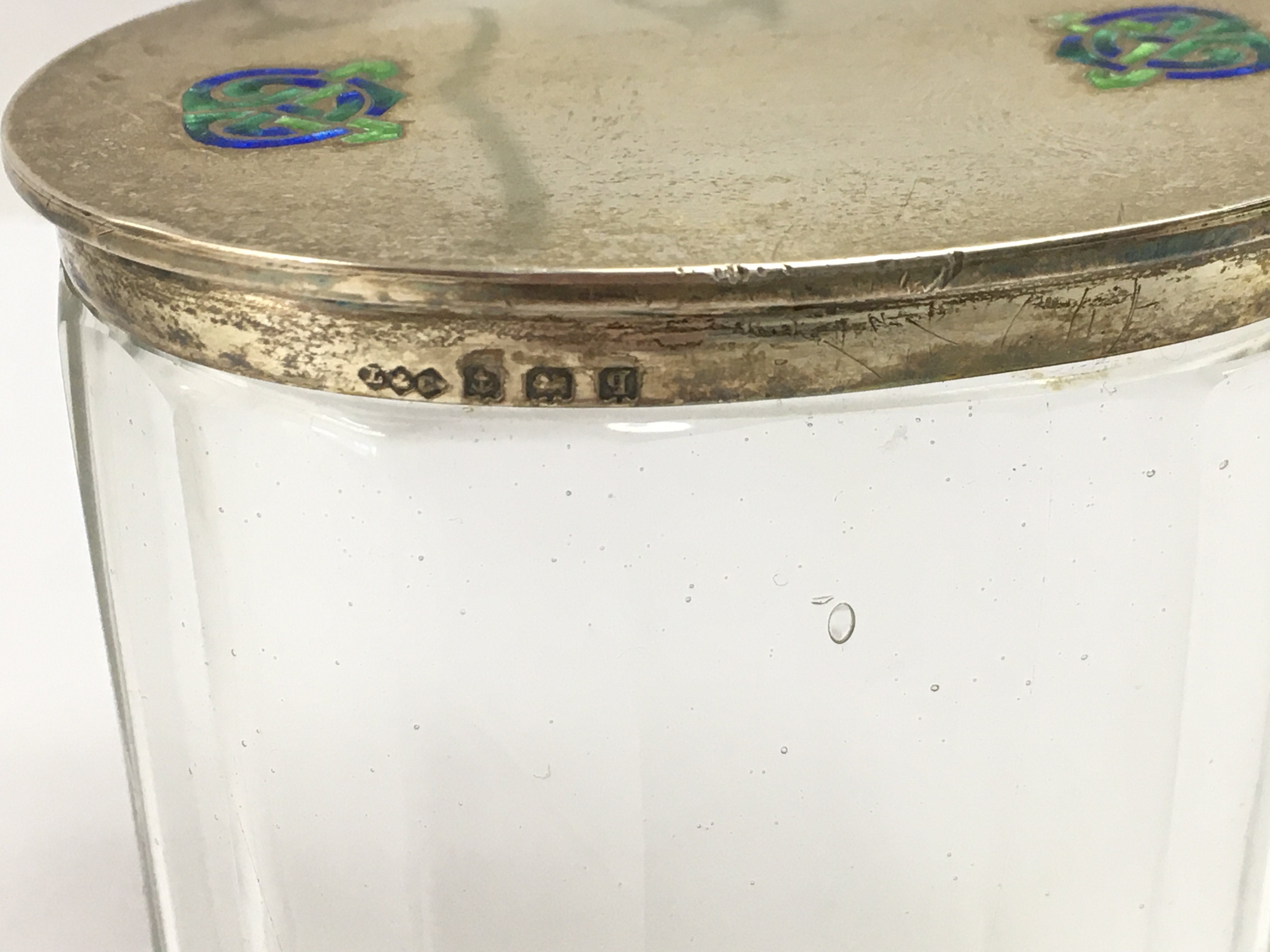 A Liberty and co Archibald knox silver lidded glass dressing table jar with celtic enamel circa 1915. Good condition but very small amount of enamel missing.