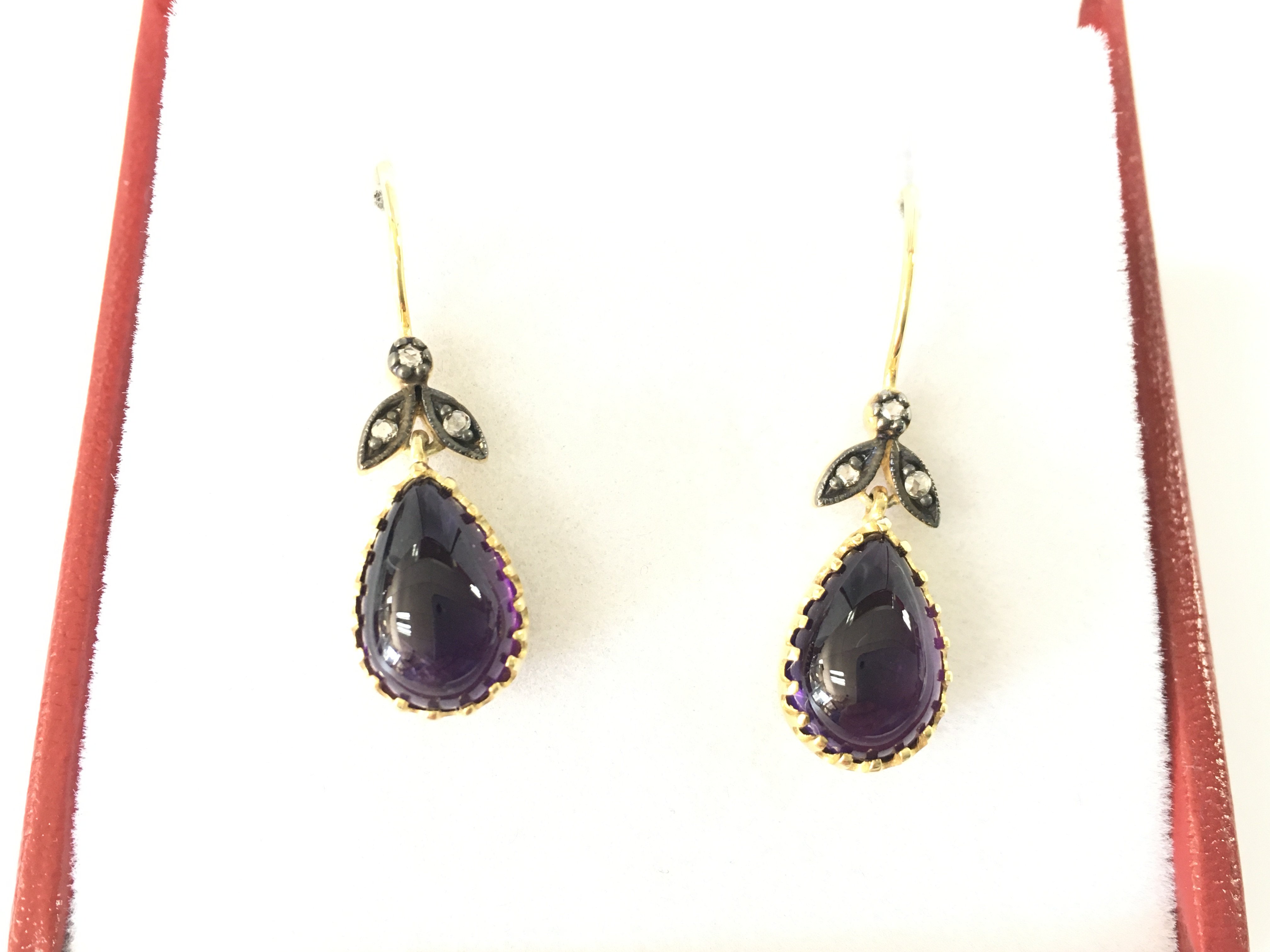 A pair of 9ct yellow gold and silver drop earrings set with oval cabochon amethyst with rose cut diamond set bales. Amethyst 2.80ct approx and 0.06ct diamond.