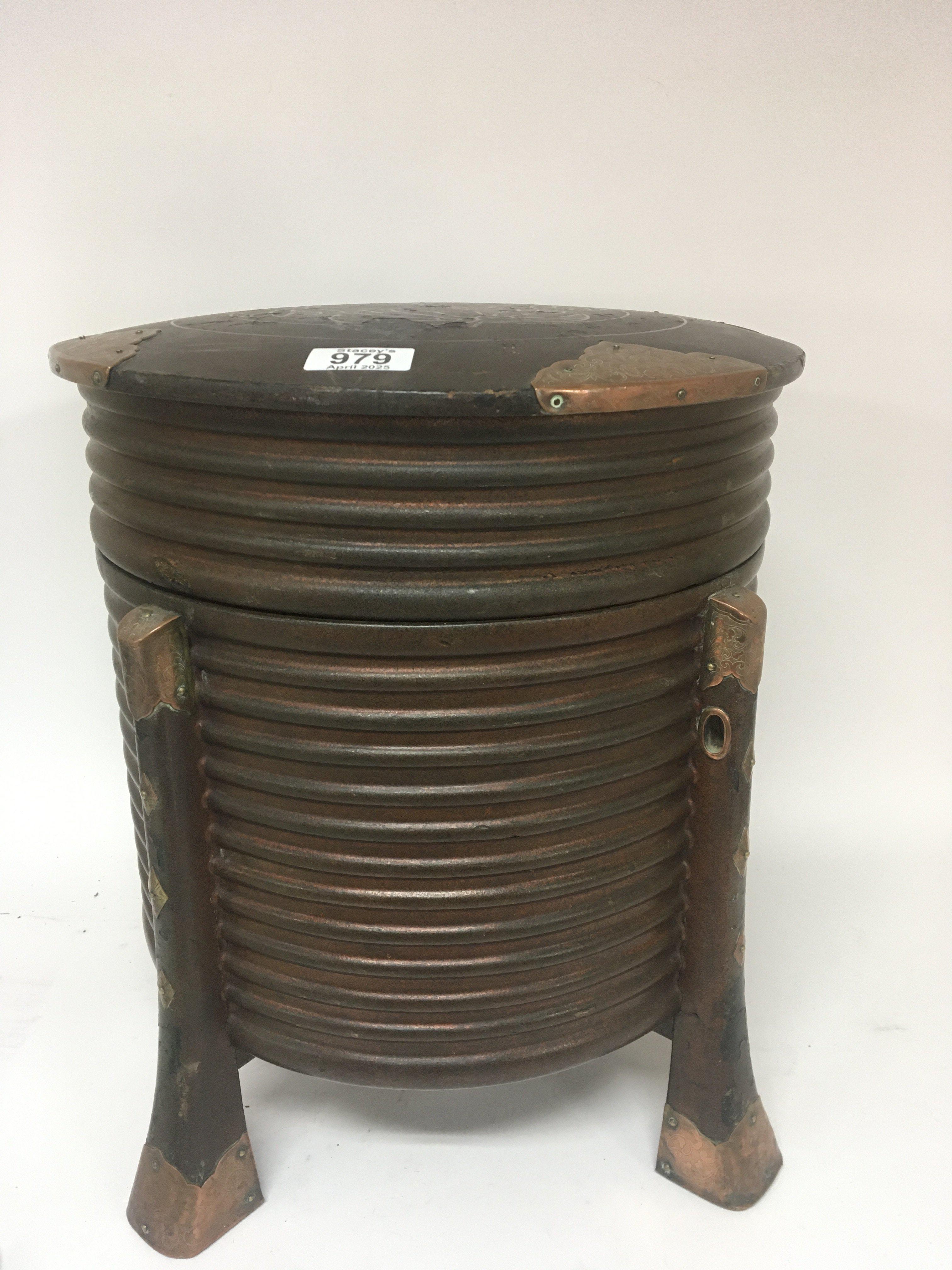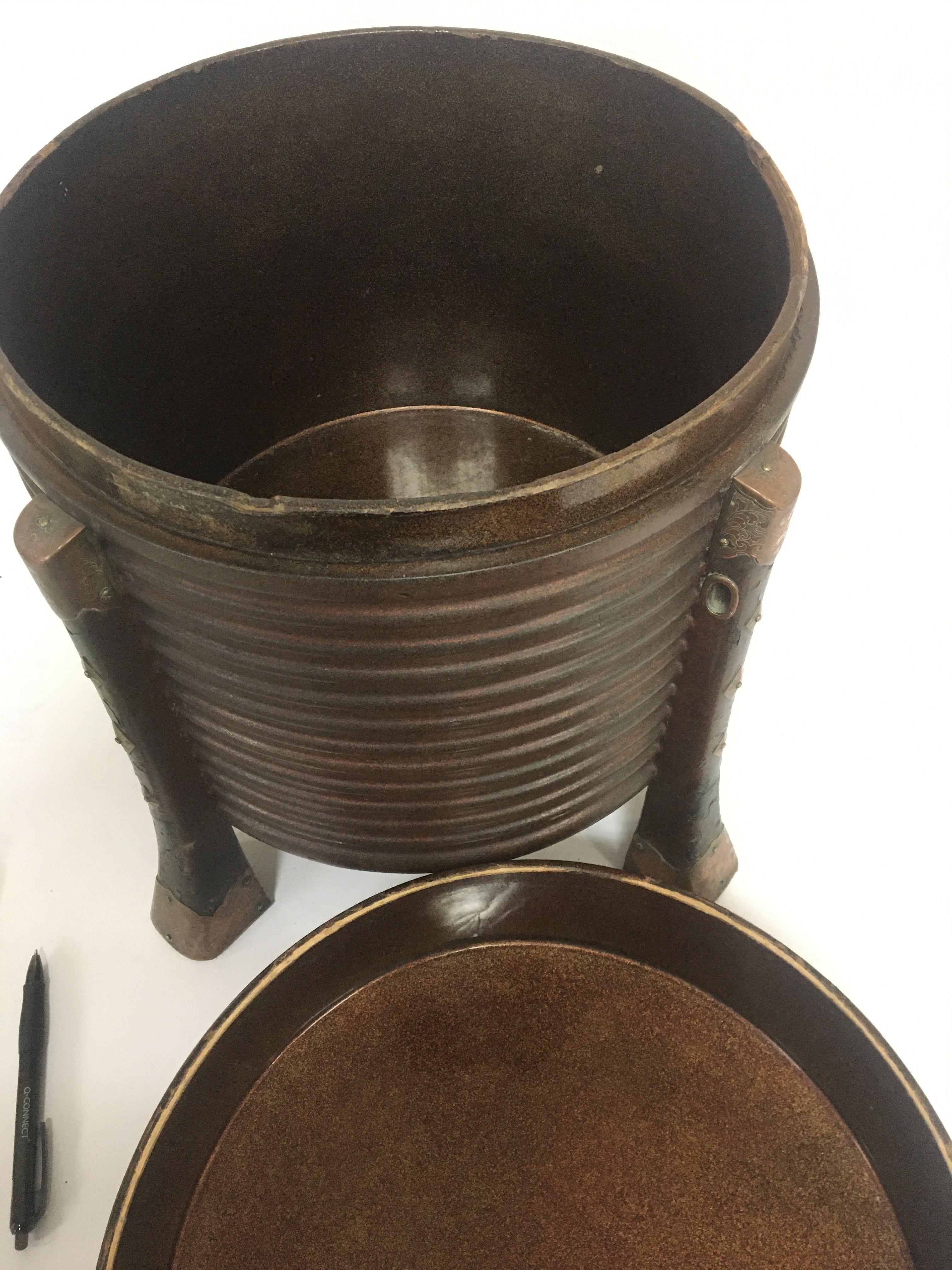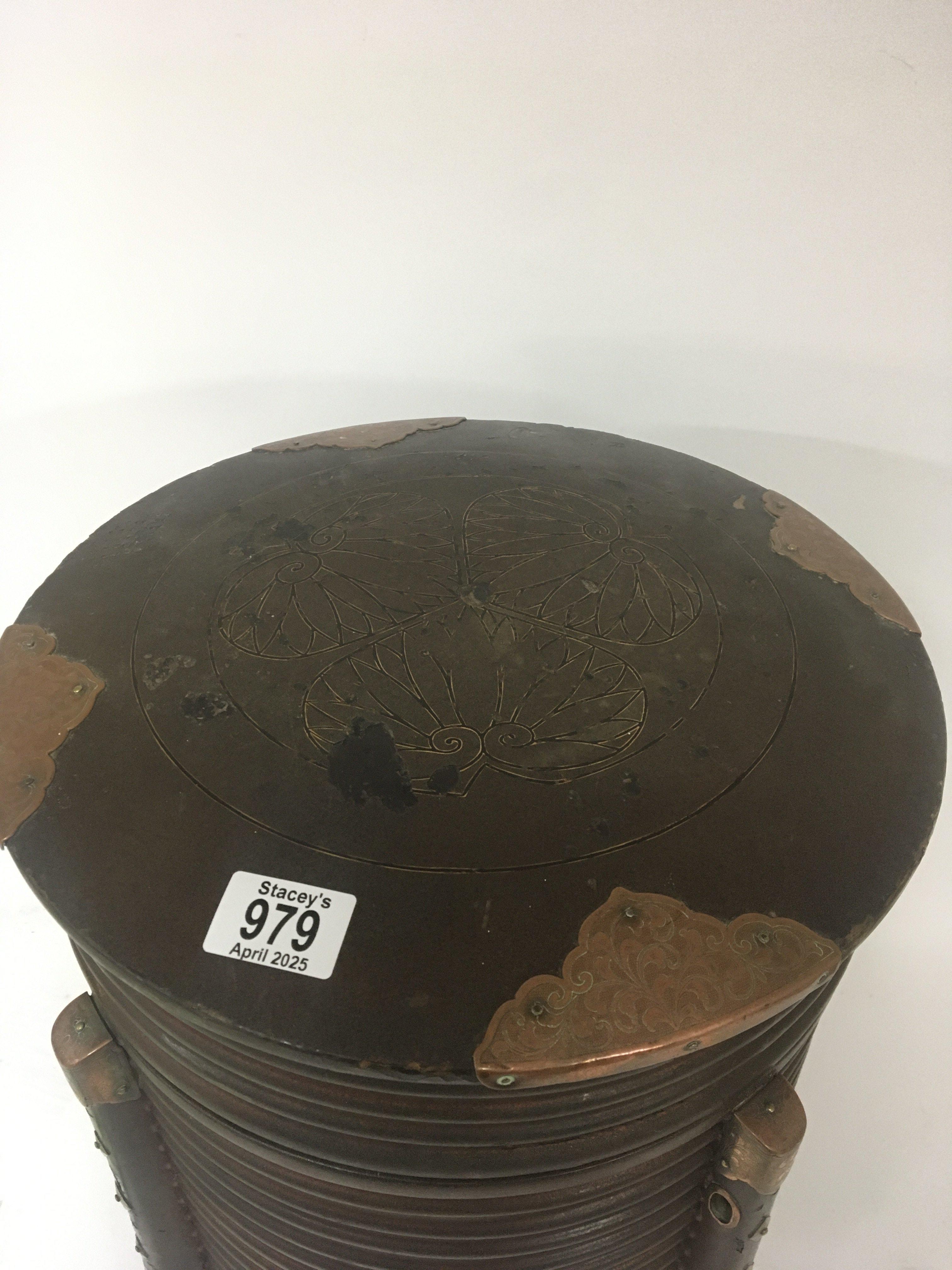 A large Oriental lacquer vessel of circular shape with ornate copper mounts. Height 43cm