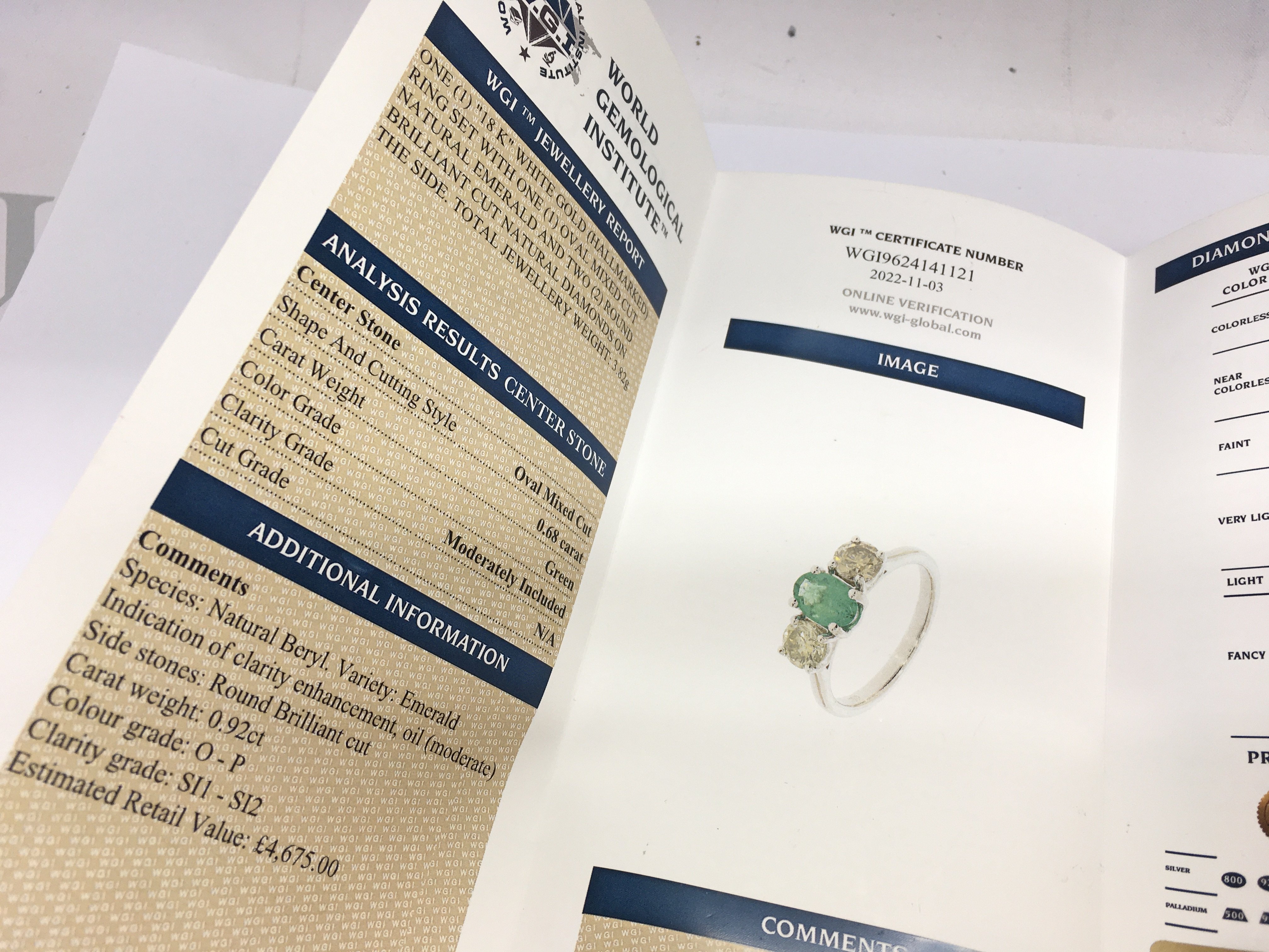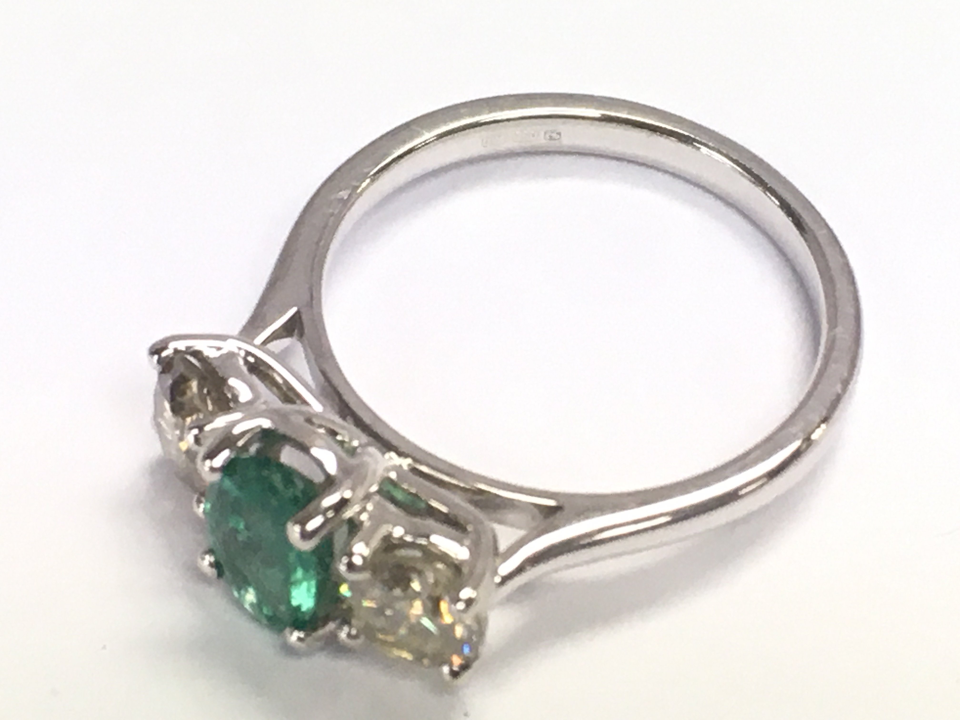 An 18ct white gold emerald and diamond trilogy ring. Emerald 0.66ct and diamonds 0.37ct size M. Comes with gem cert.