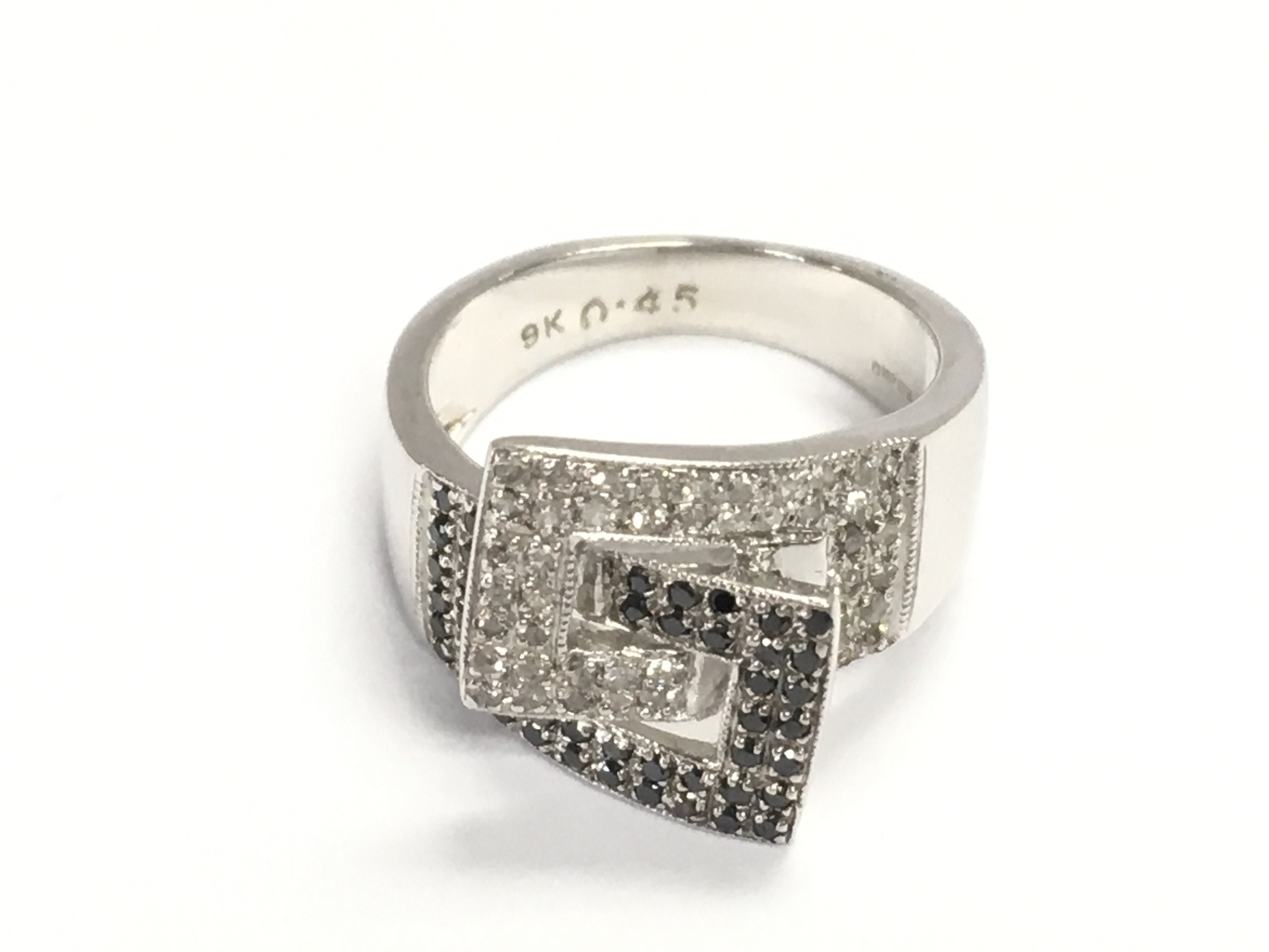 Mid century style 9ct white gold ring set with black and white diamonds approximately 0.45ct total size K