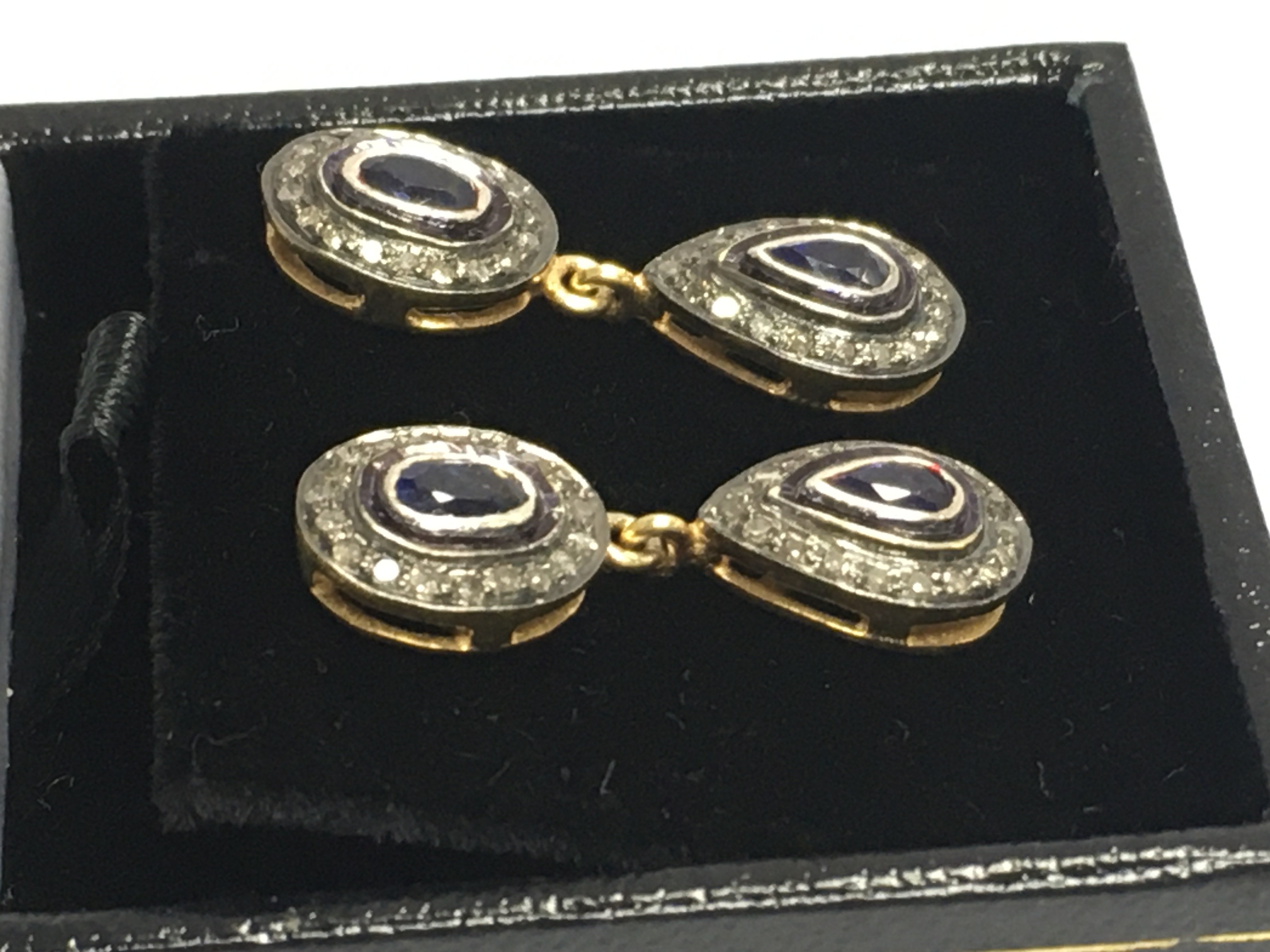 A pair of double drop earring set with pear shaped and oval sapphires each surrounded by RC diamond in gold plated silver. Approximately 0.75vt sapphire and 0.48ct diamonds. Postage B