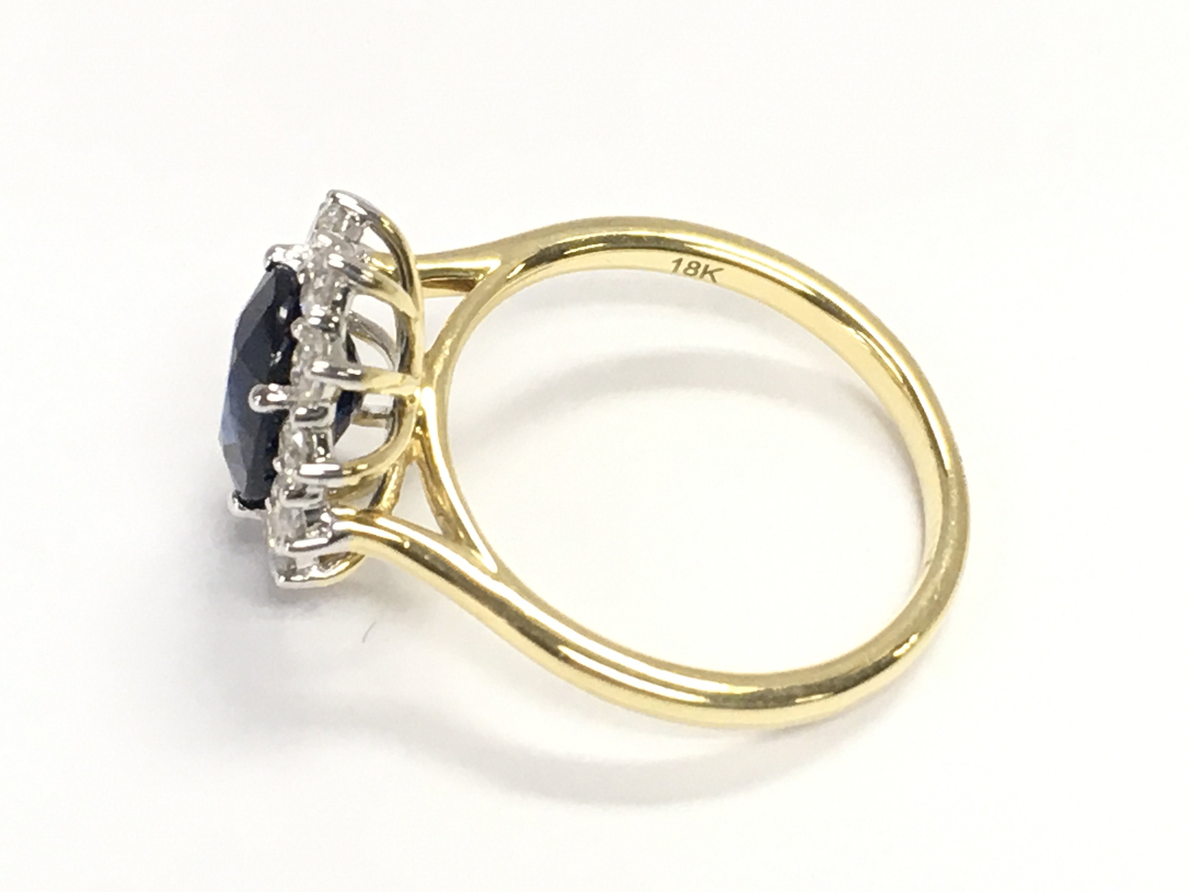 An 18ct yellow and white gold oval sapphire and RBC diamond cluster ring. Sapphire۪s 3.03ct and 0.84ct size N