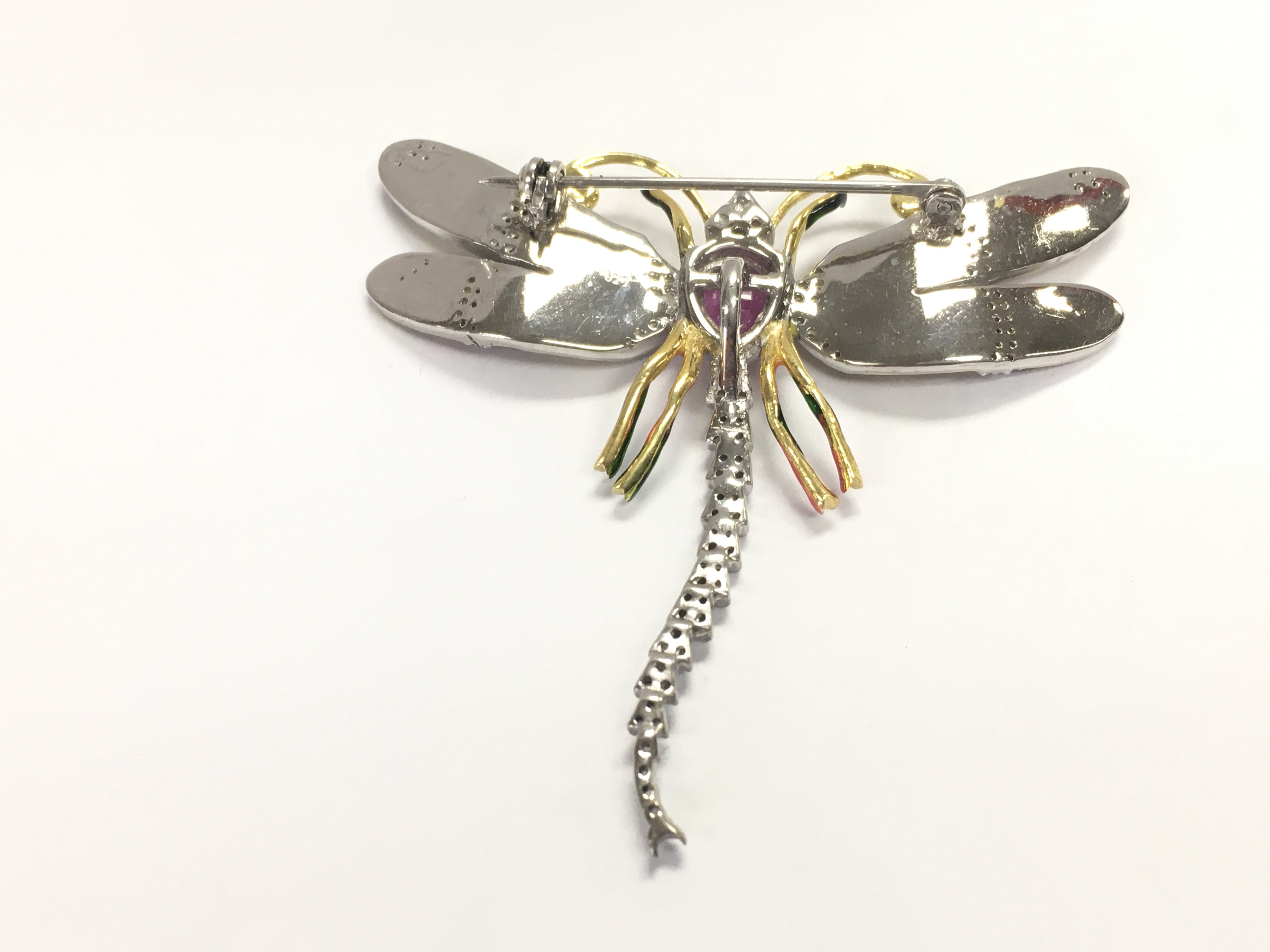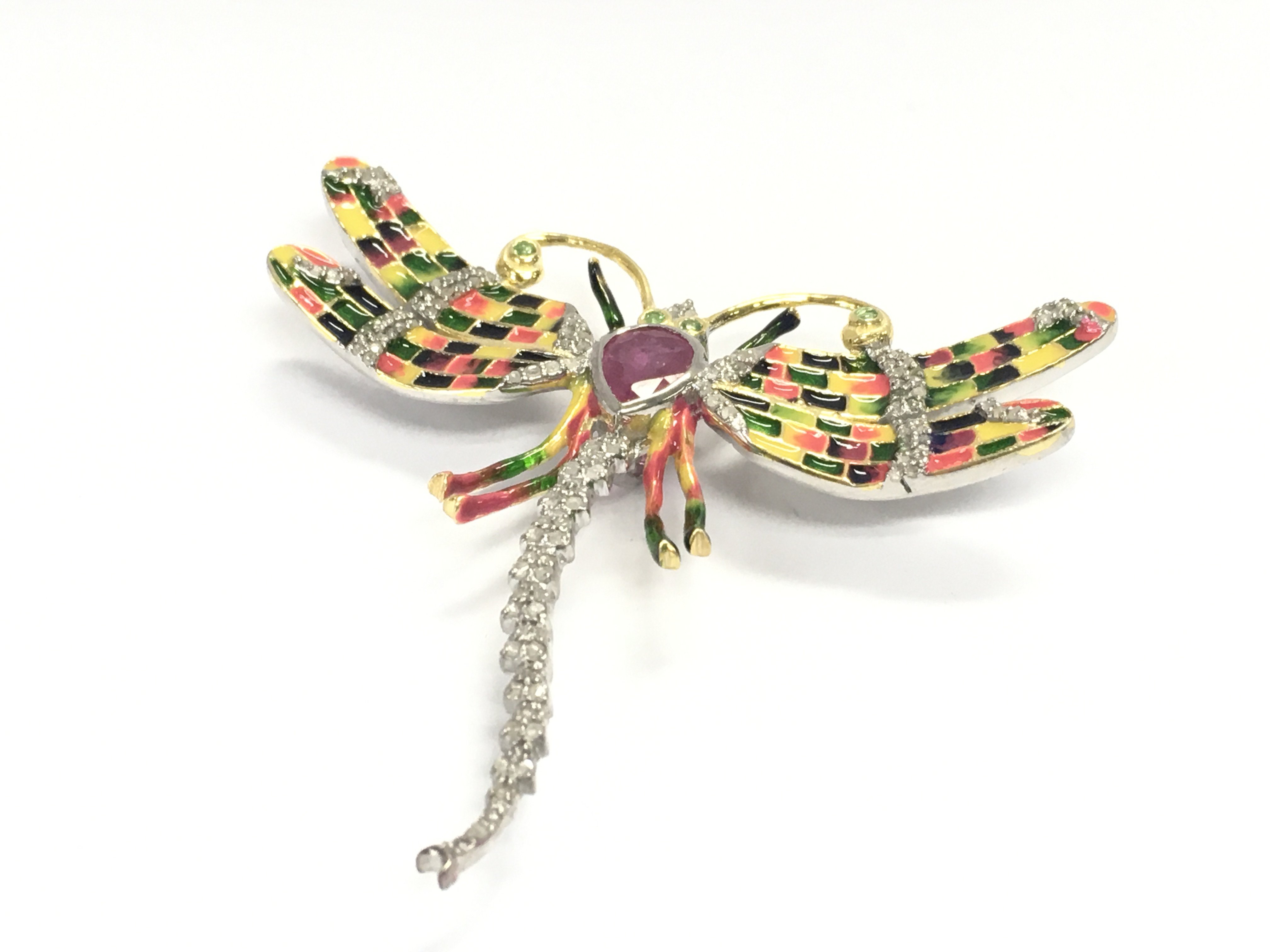 A silver dragonfly brooch / pendant set with a pear shaped ruby tsavorite garnet eyes and antennae and diamonds with enamel inlays on yellow pink blue orange and green. Ruby 1.19ct diamonds 0.52ct and 0.08ct garnets.