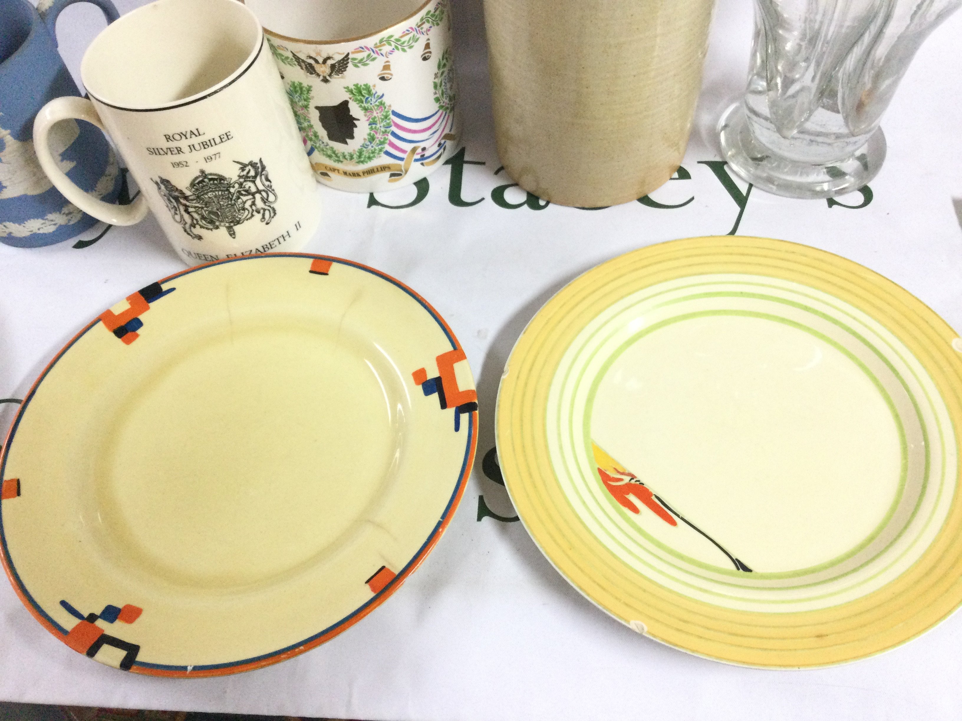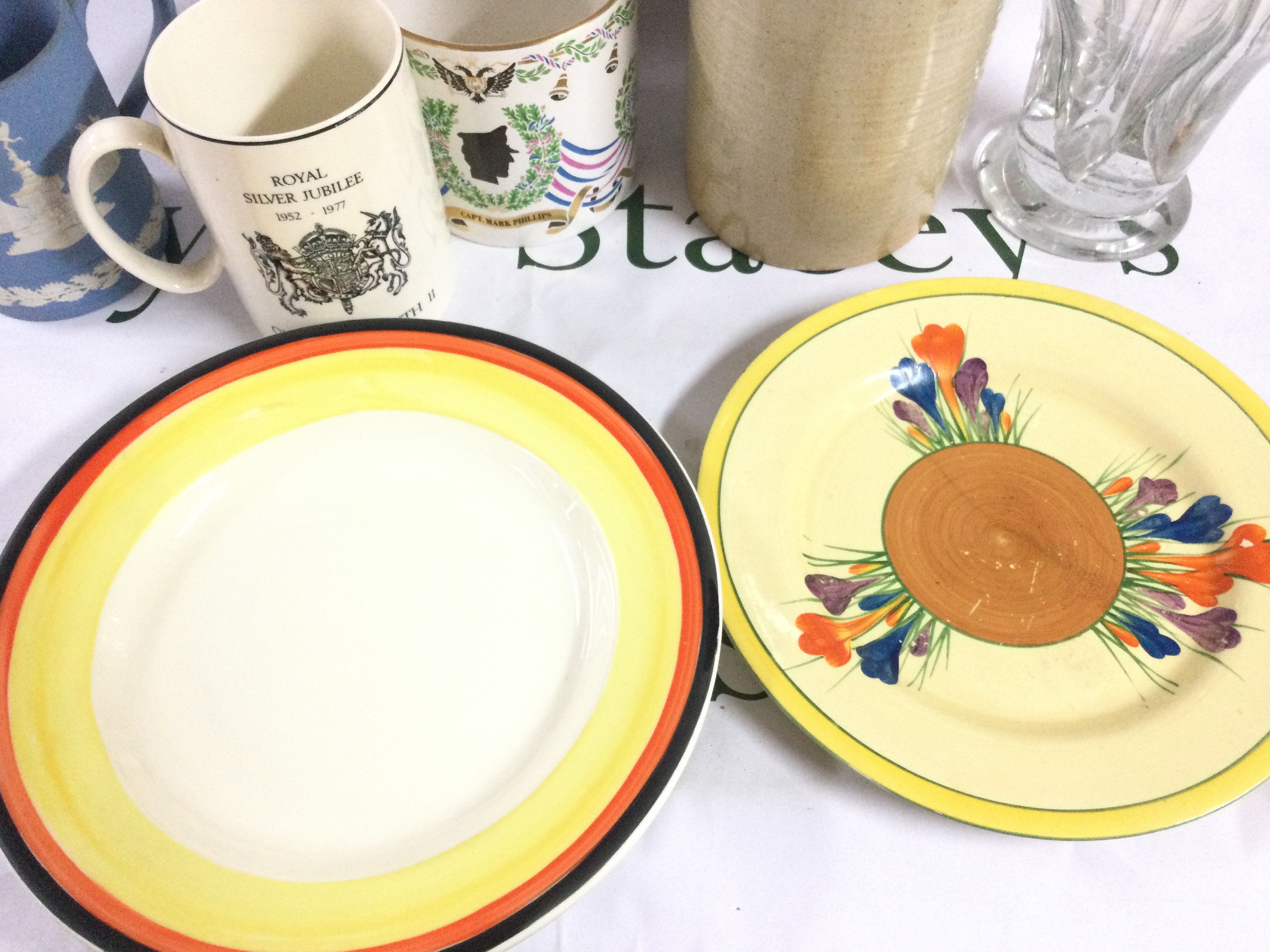 Collection of ceramics including Clarice Cliff plates, Celtic Harvest Clarice dish , Wedgwood mug etc. some damage. This lot cannot be posted