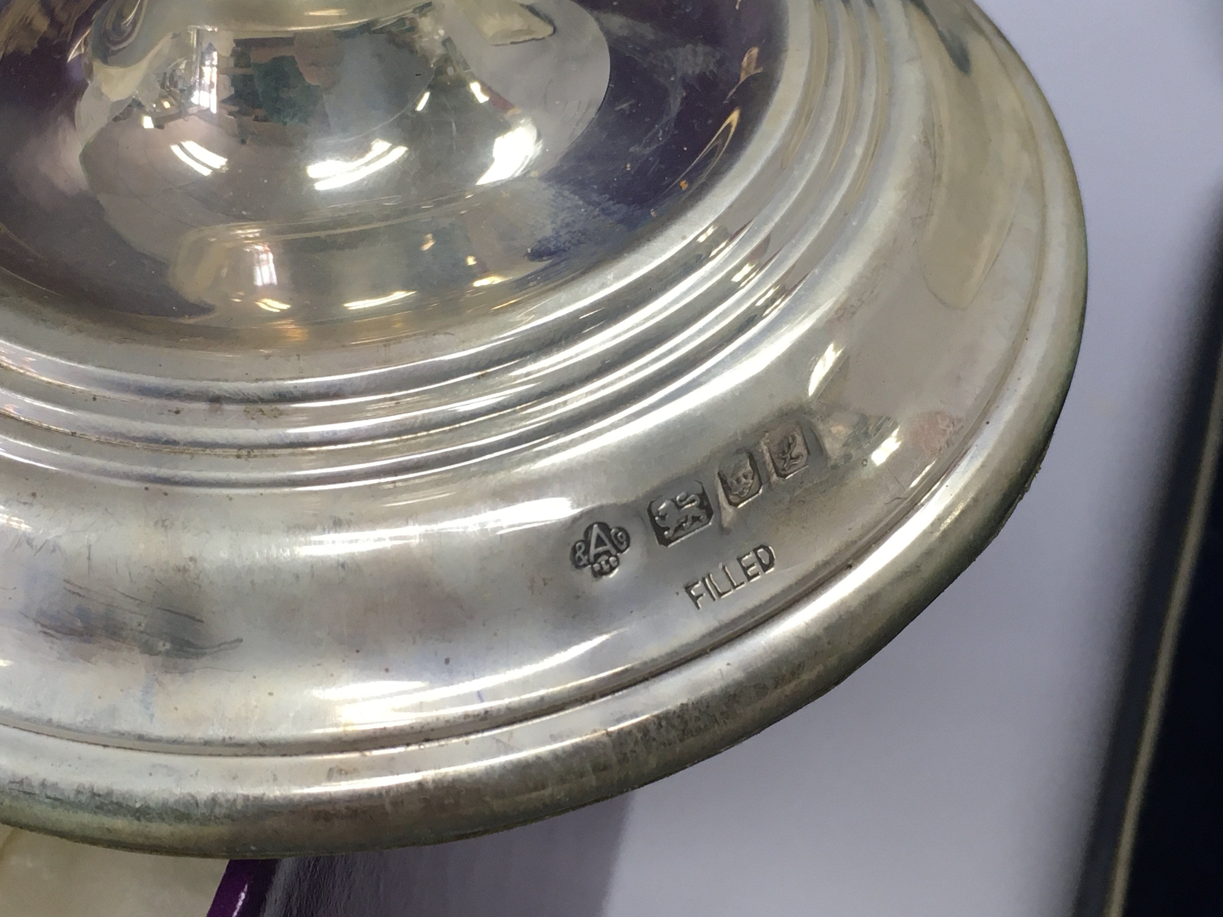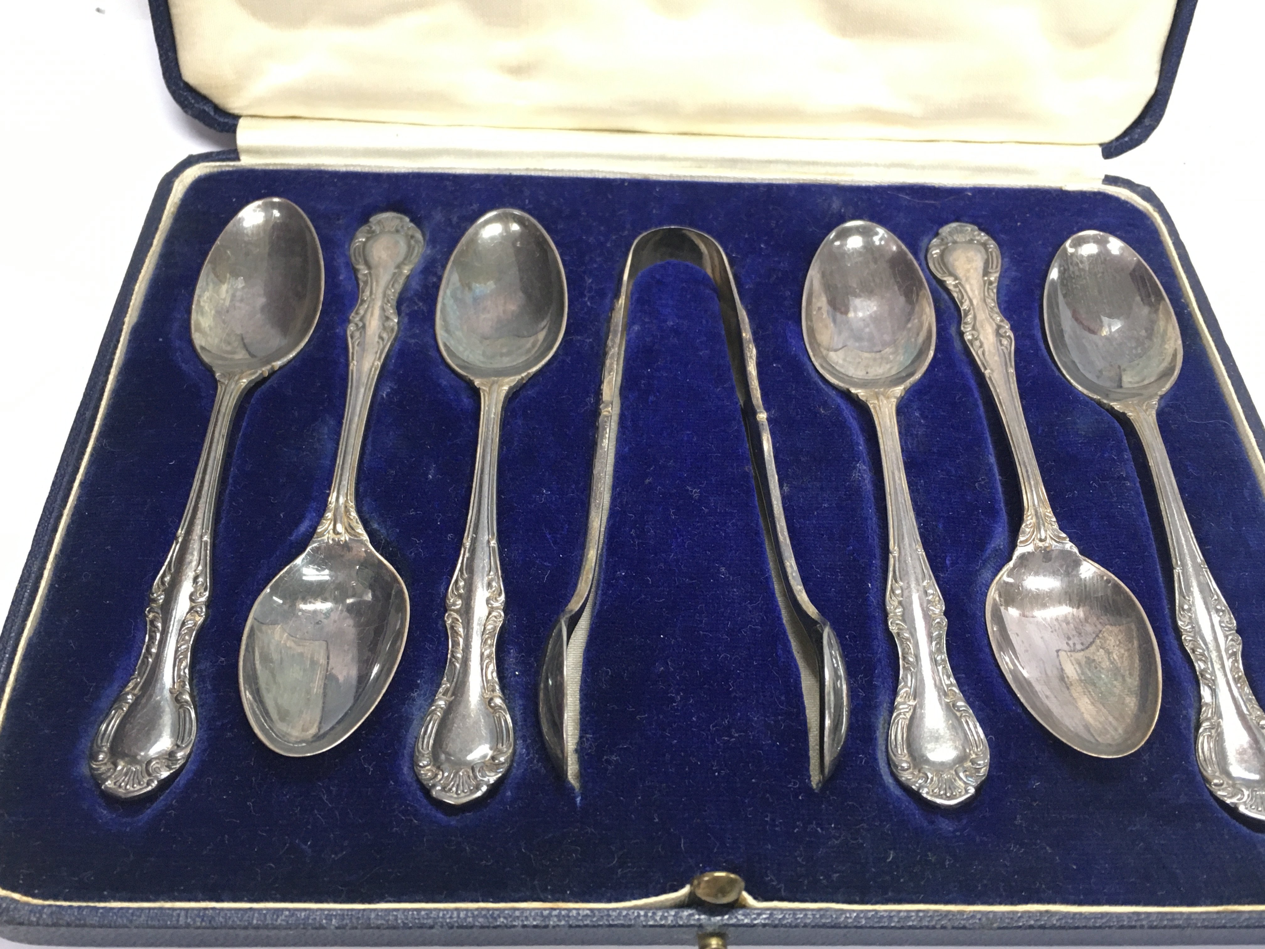 A pair of boxed Asprey hallmarked candlesticks and a cased set of Mappin and Webb silver spoons. Postage B