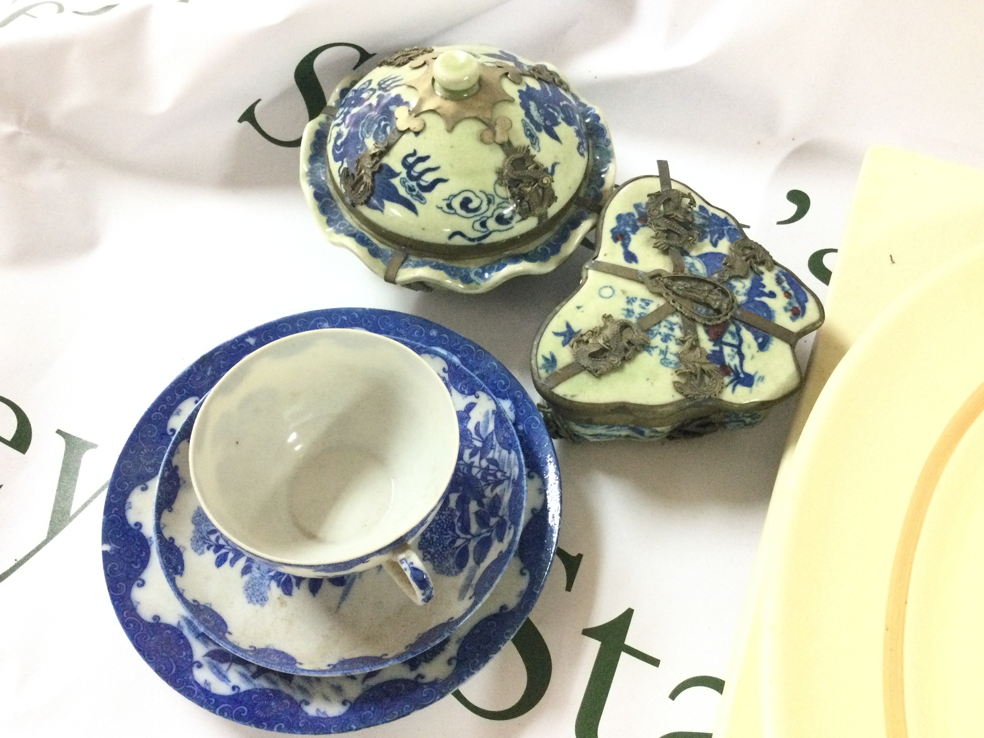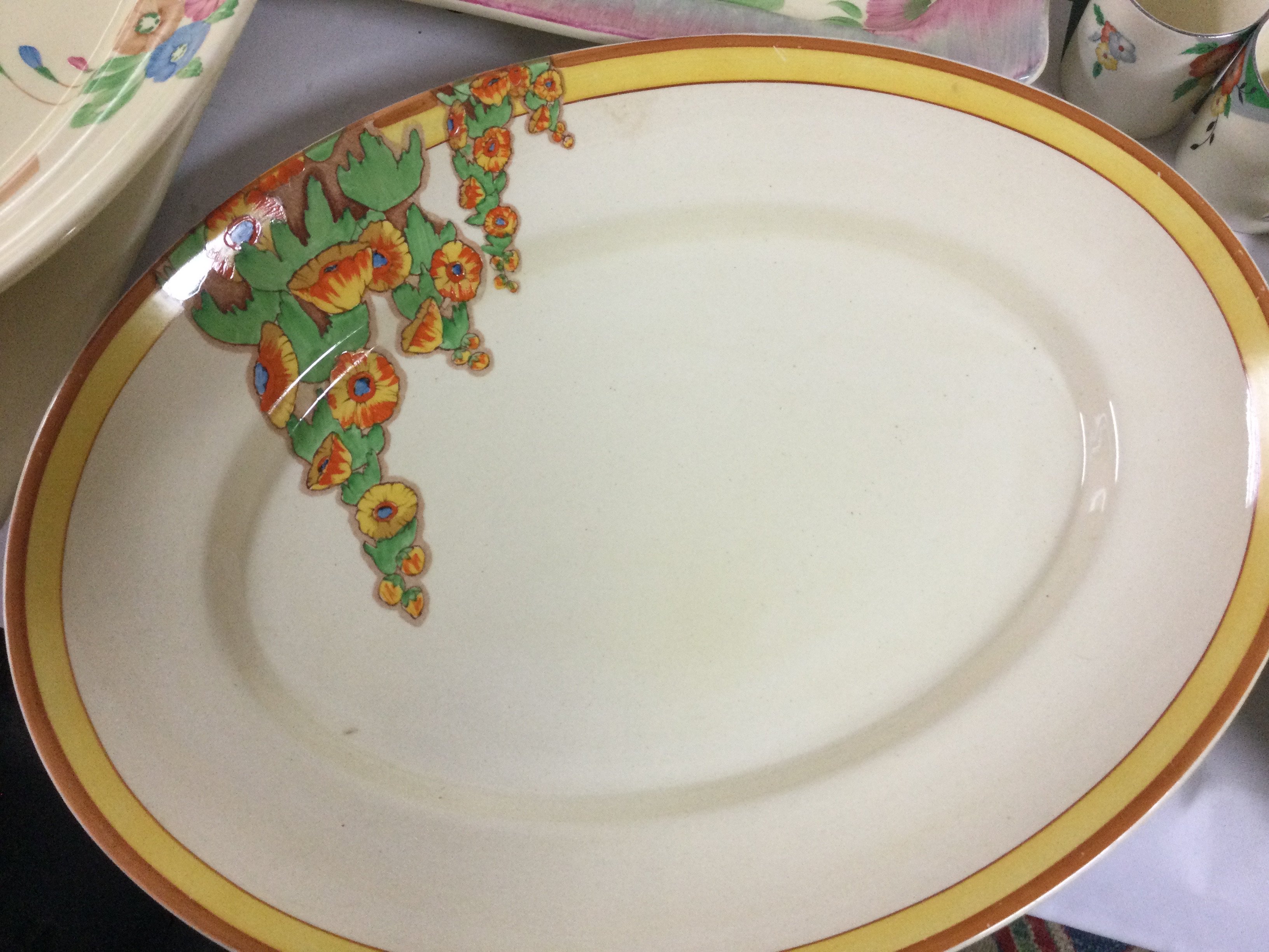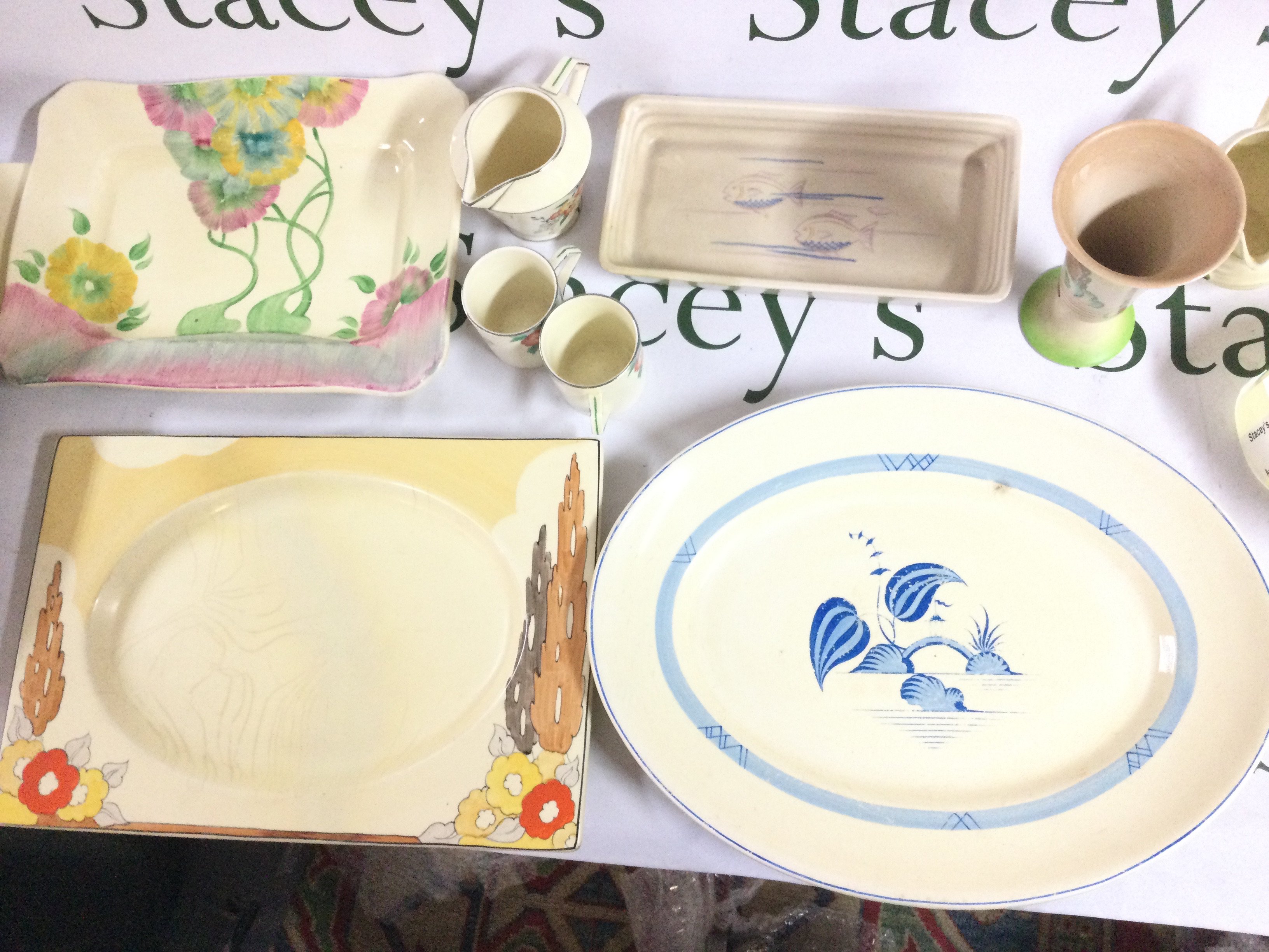 Clarice cliff ceramics including a vase , rectangular dish, oval islands dish, other dishes and Frinton cups , Japanese Blue and white ceramics , container and cup and saucers . This lot cannot be posted