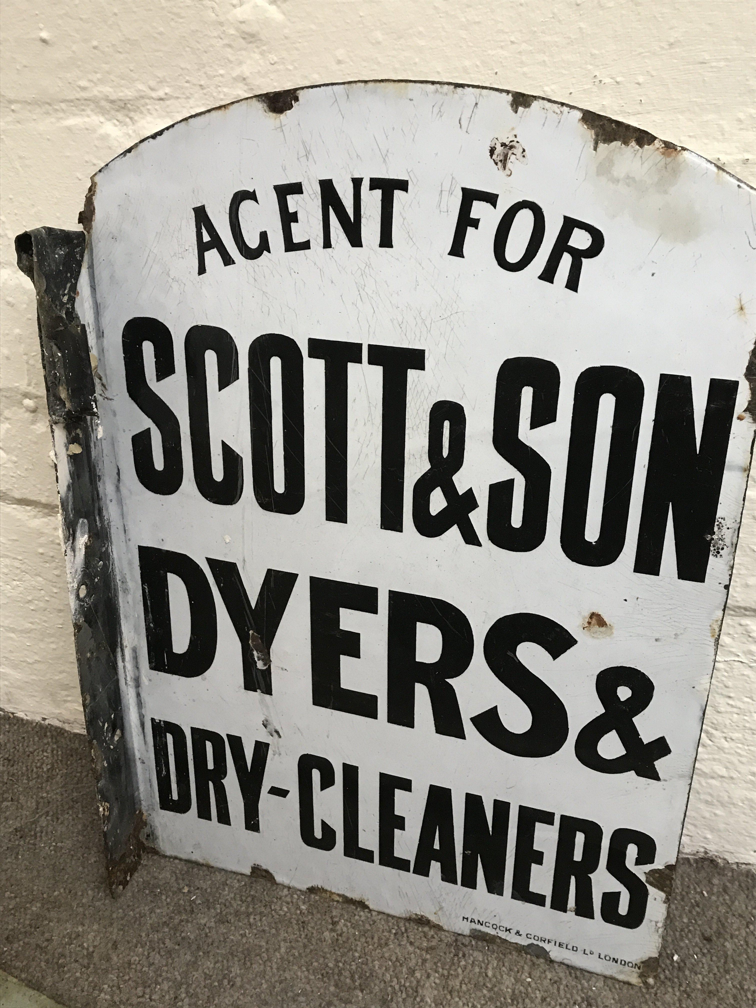 Vintage Scott & Son Dyers & Dry cleaners double sided enamel advertising sign , by Hancock & Corfield London. 32cm wide 46cm tall.