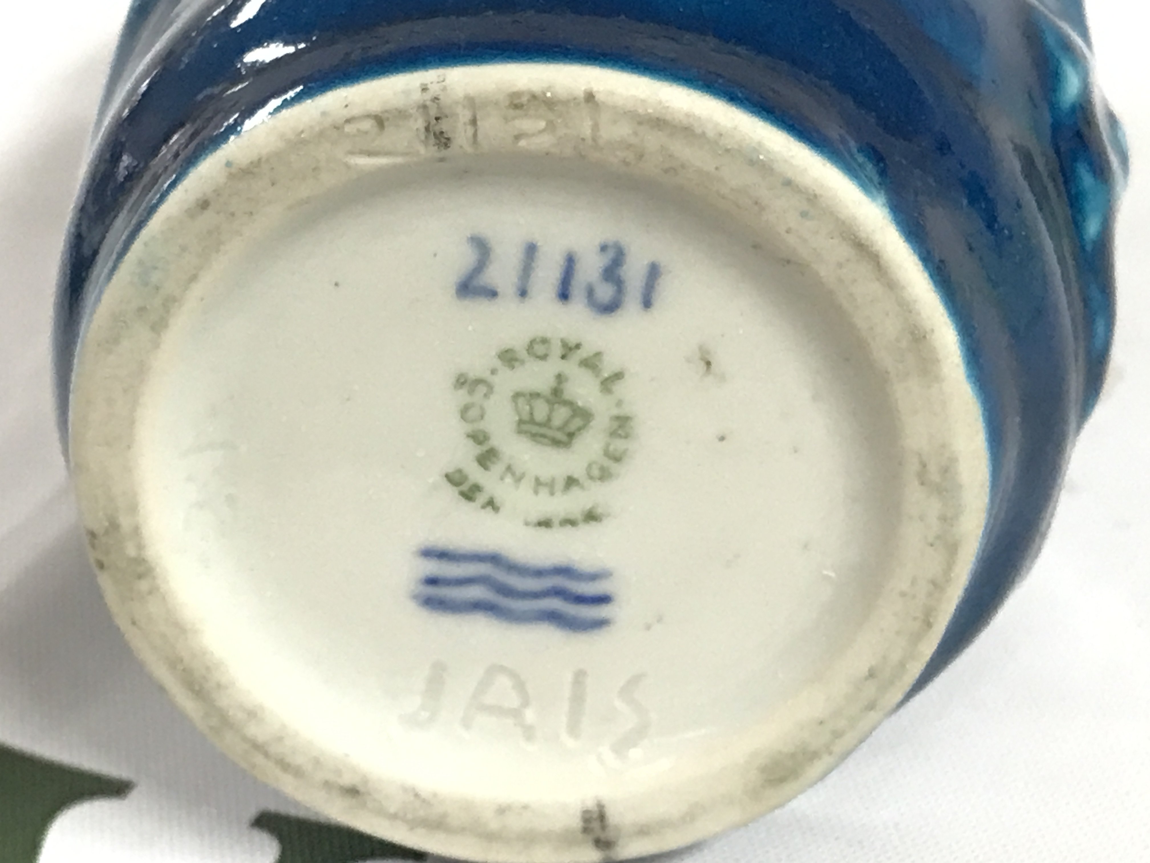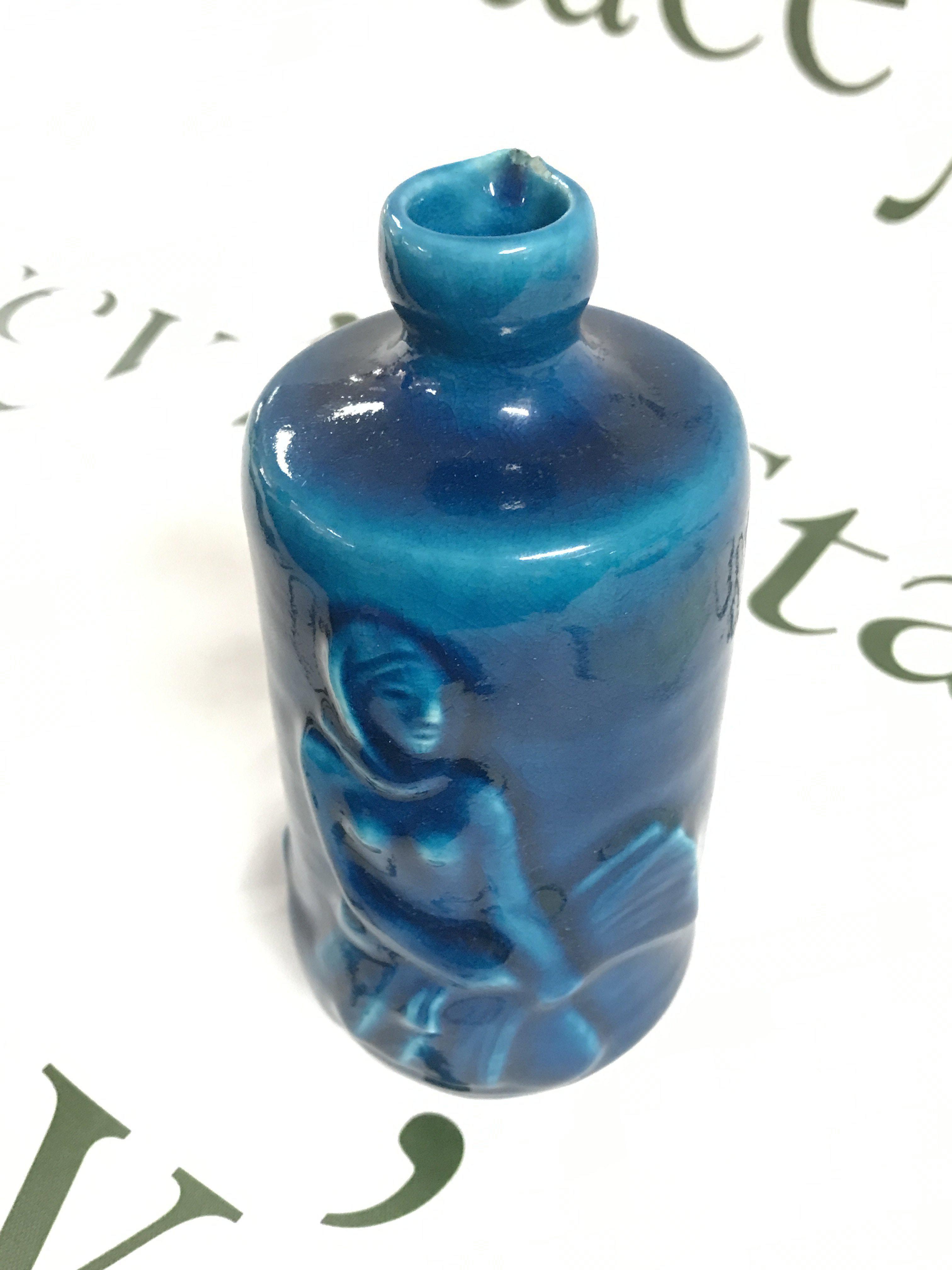 A Copenhagen blue glazed bottle with relief of harvesting people ,Signed Jais Royal . This lot cannot be posted