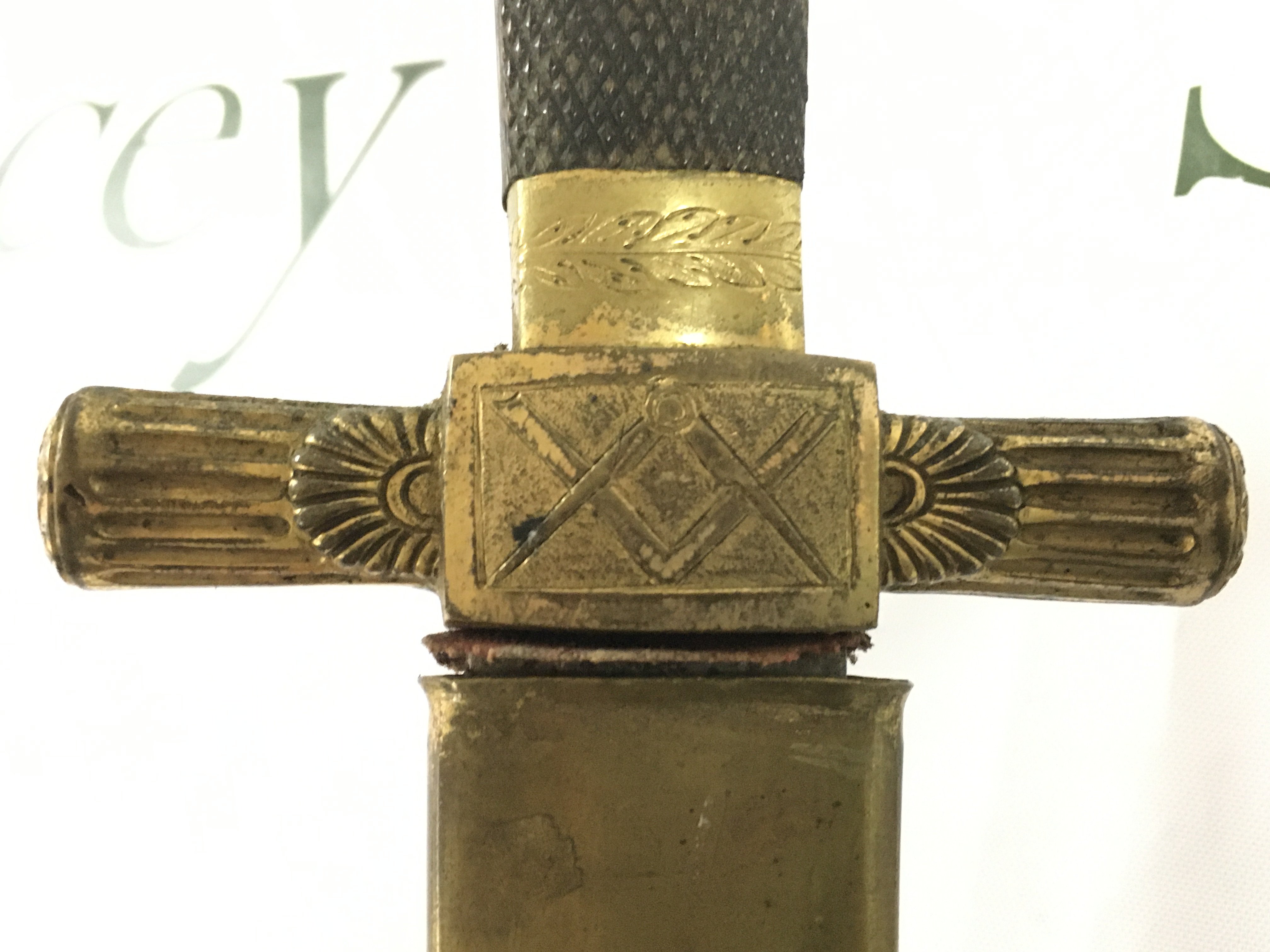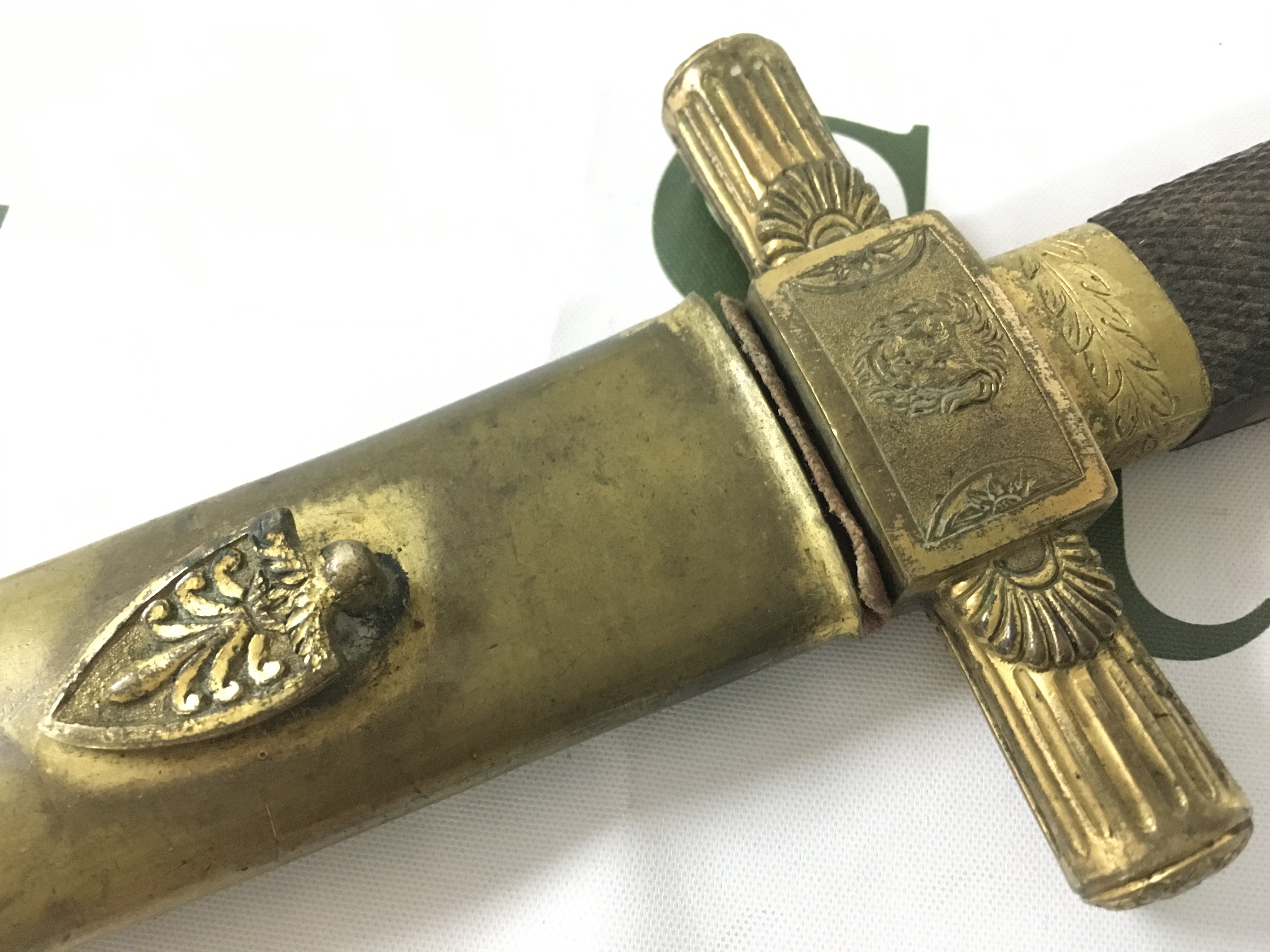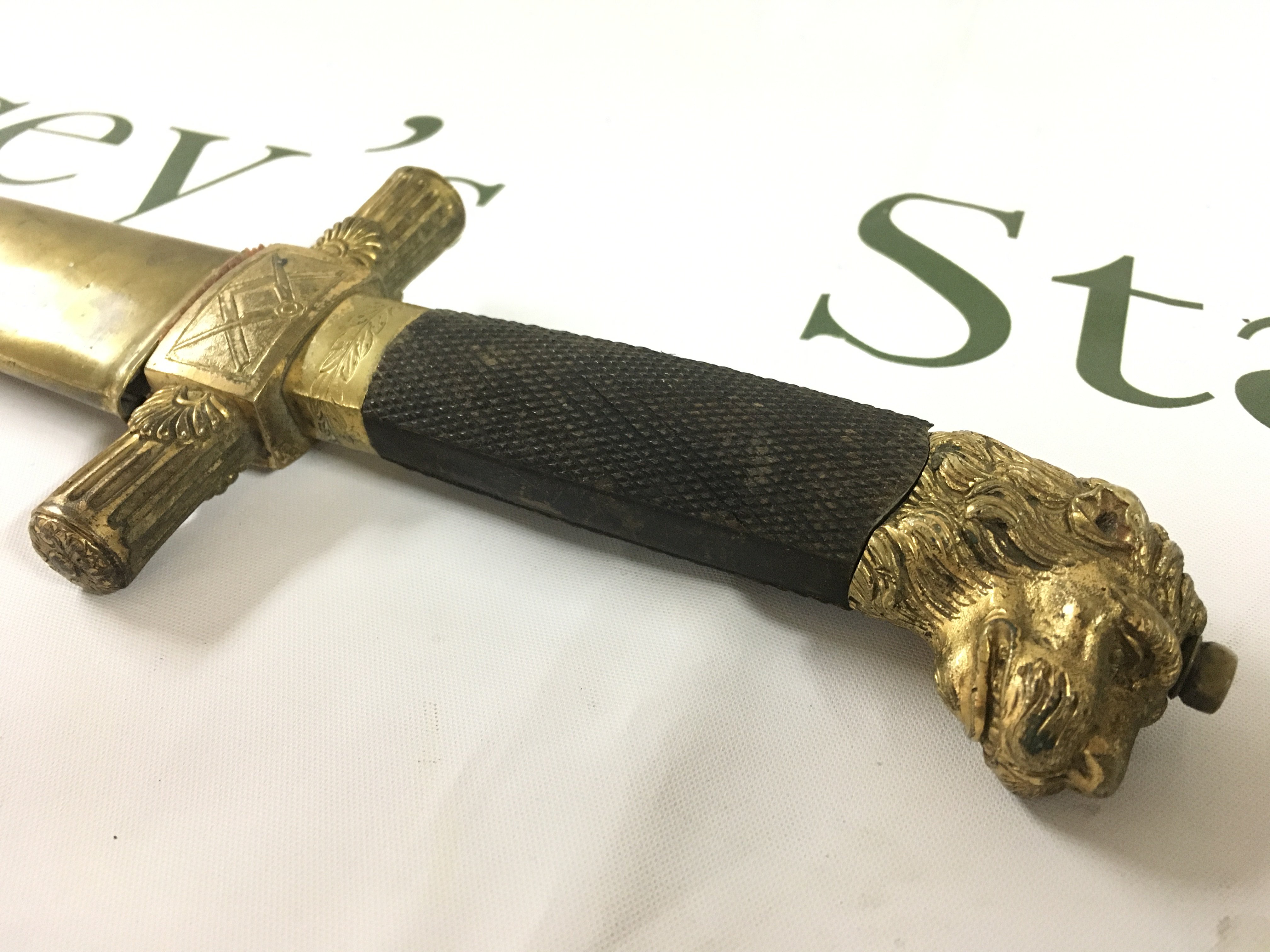 An unusual short sword with a gilt lions head pommel, leather and gilt scabbard. Scabbard is stuck to the blade . 75cm total length