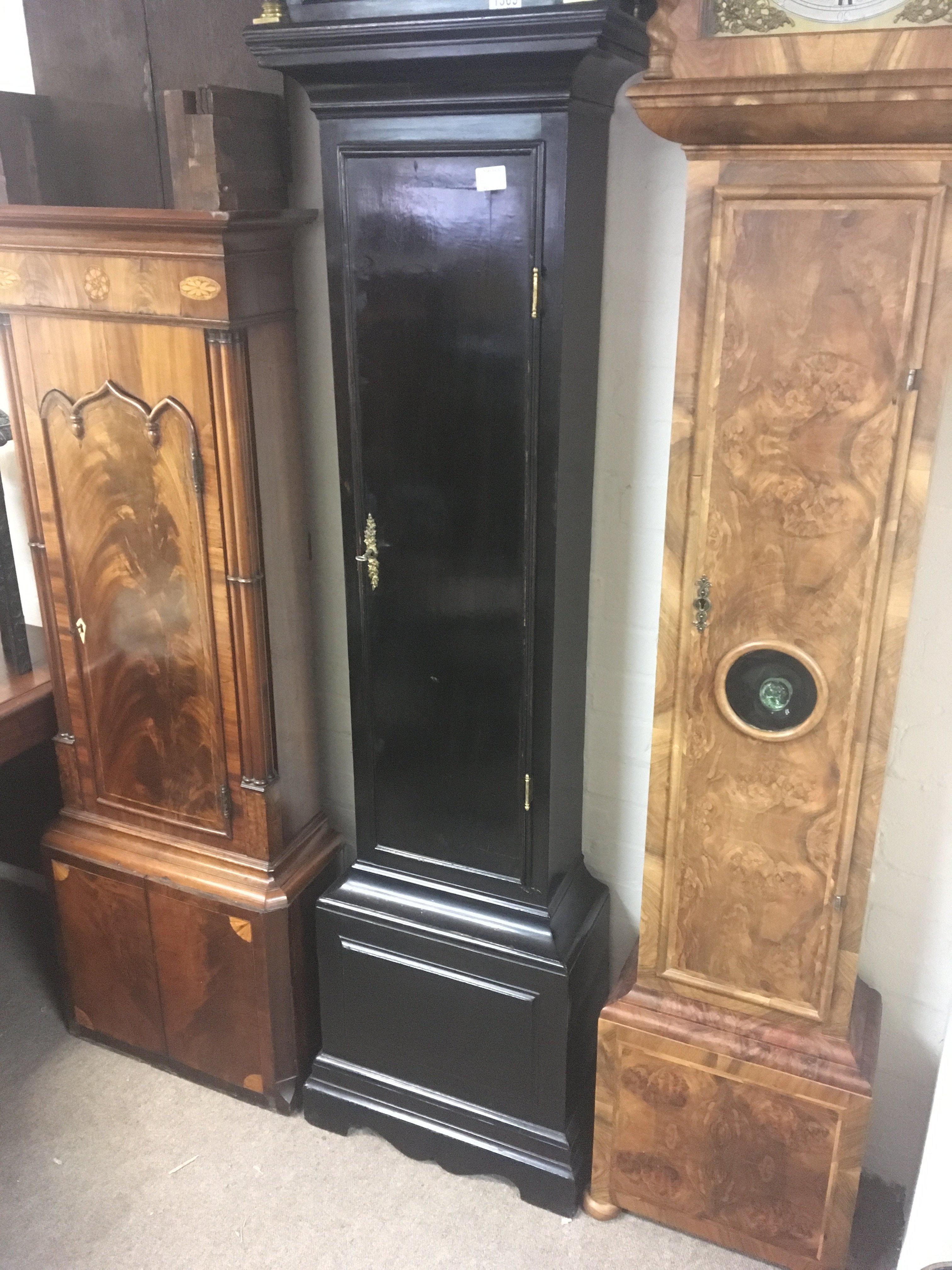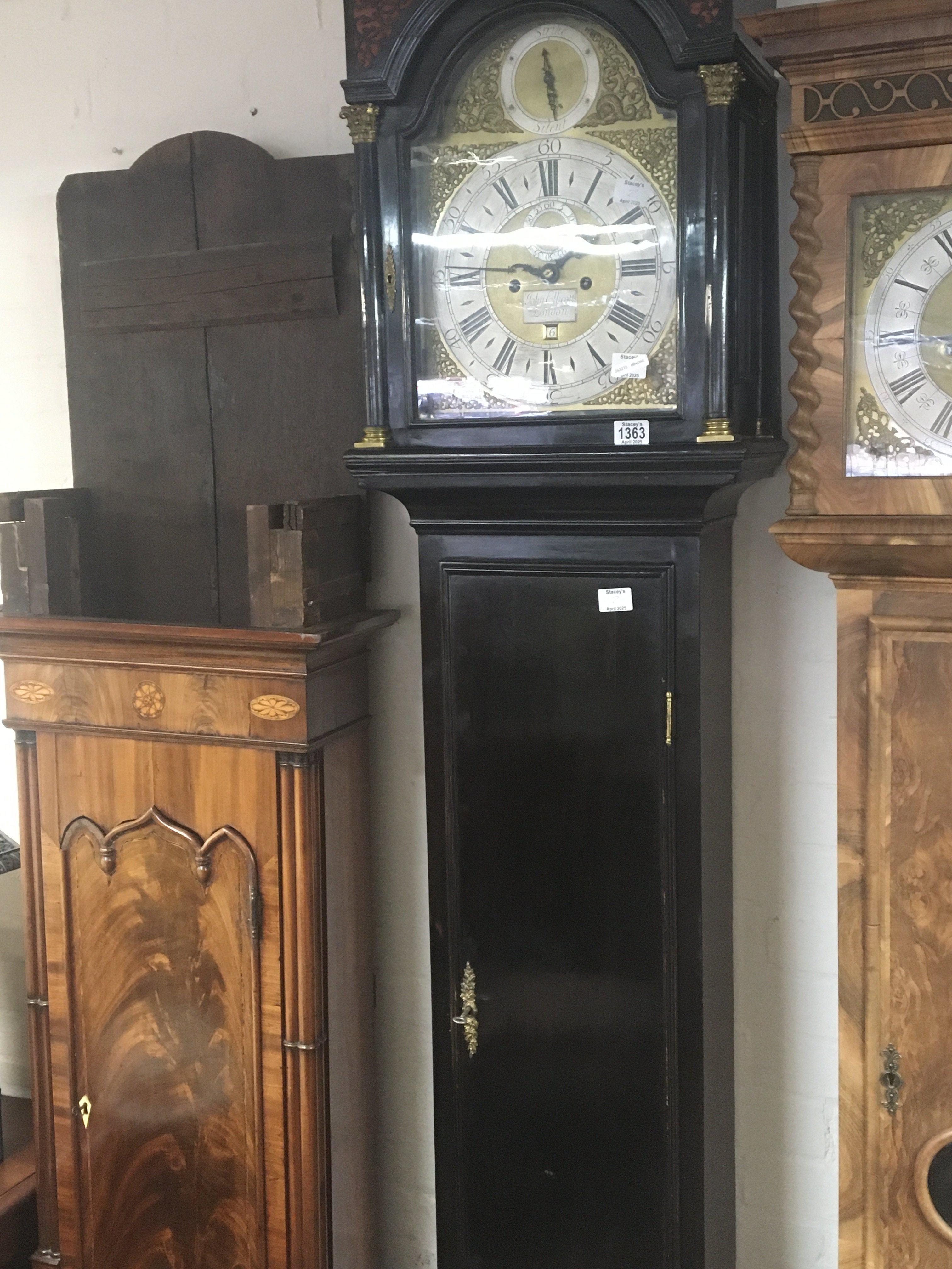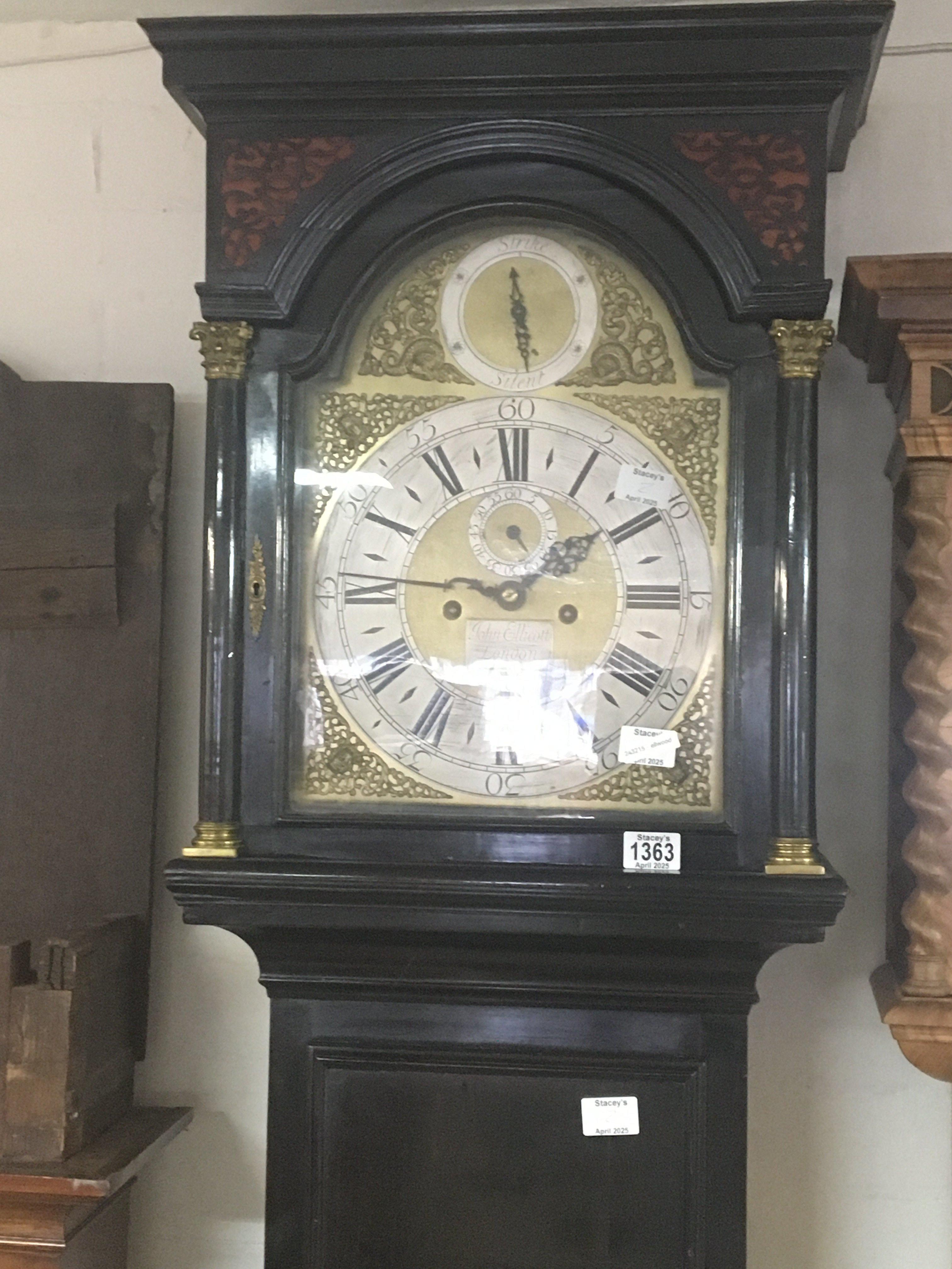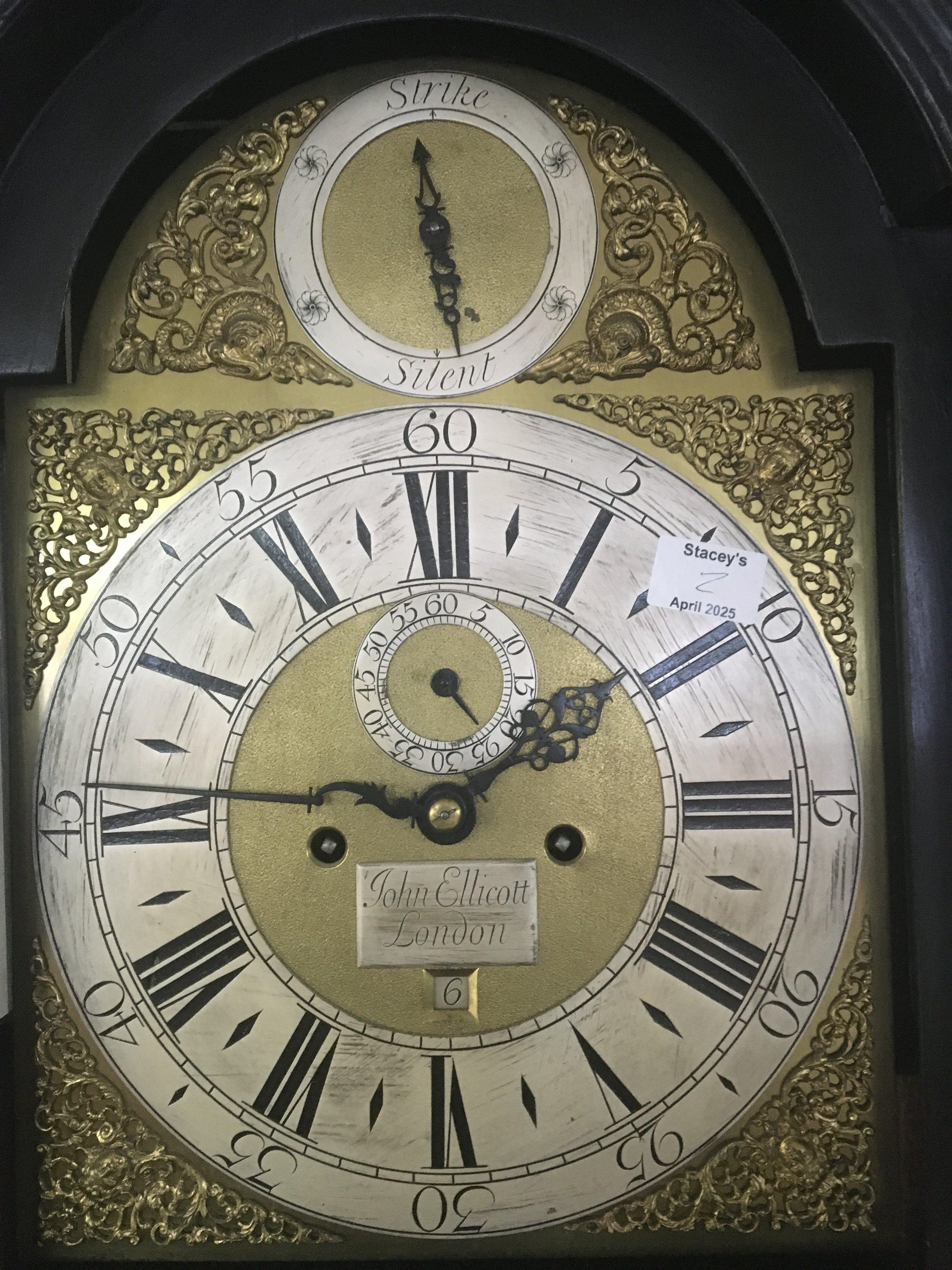 A mid 18th Century long case clock in a black finish case maker John Ellicott London (1706-1770) the brass dial with maker silvered plaque and conforming chapter ring strike and silent subsidiary dial with weights and pendulum eight day going movement the clock appears to be u. Good condition. Height 230cm