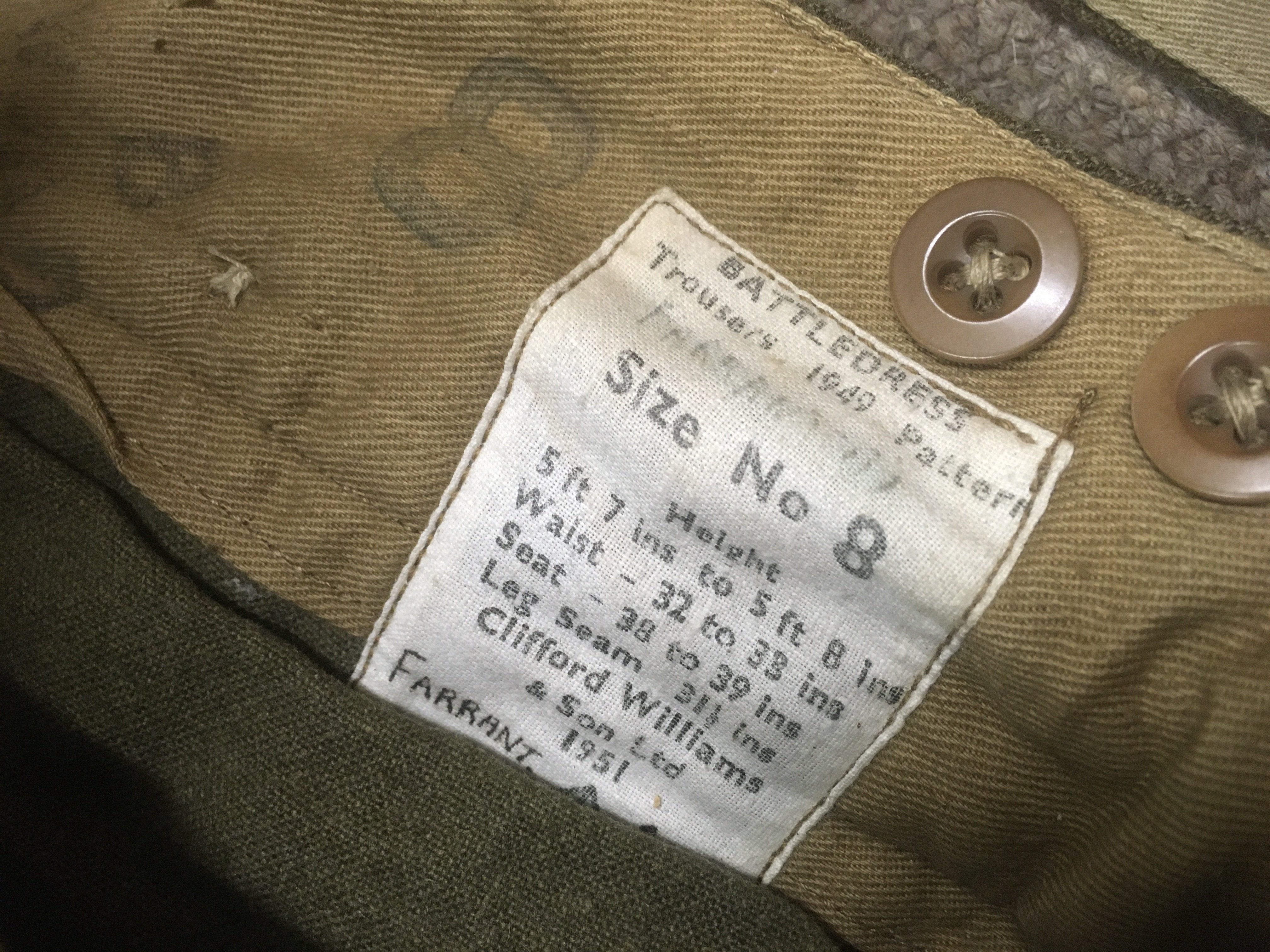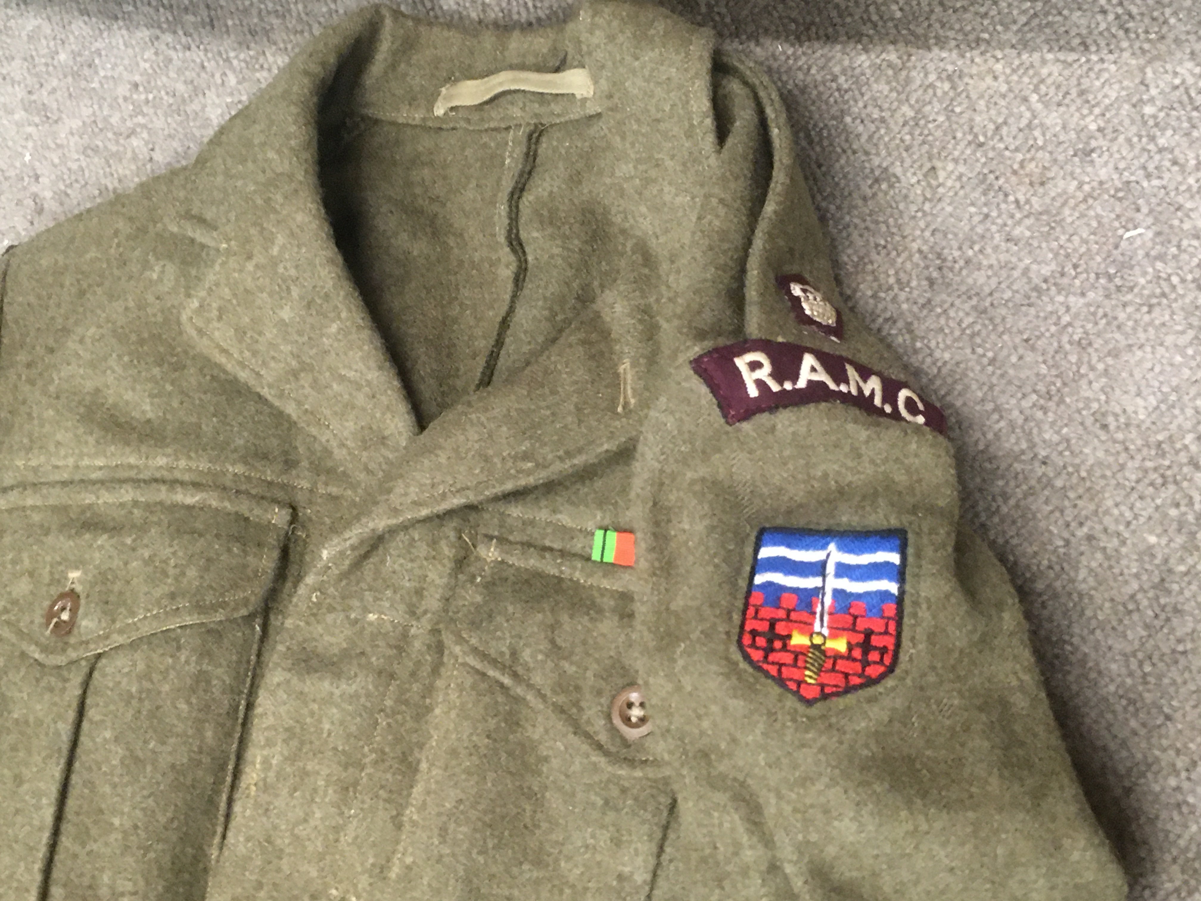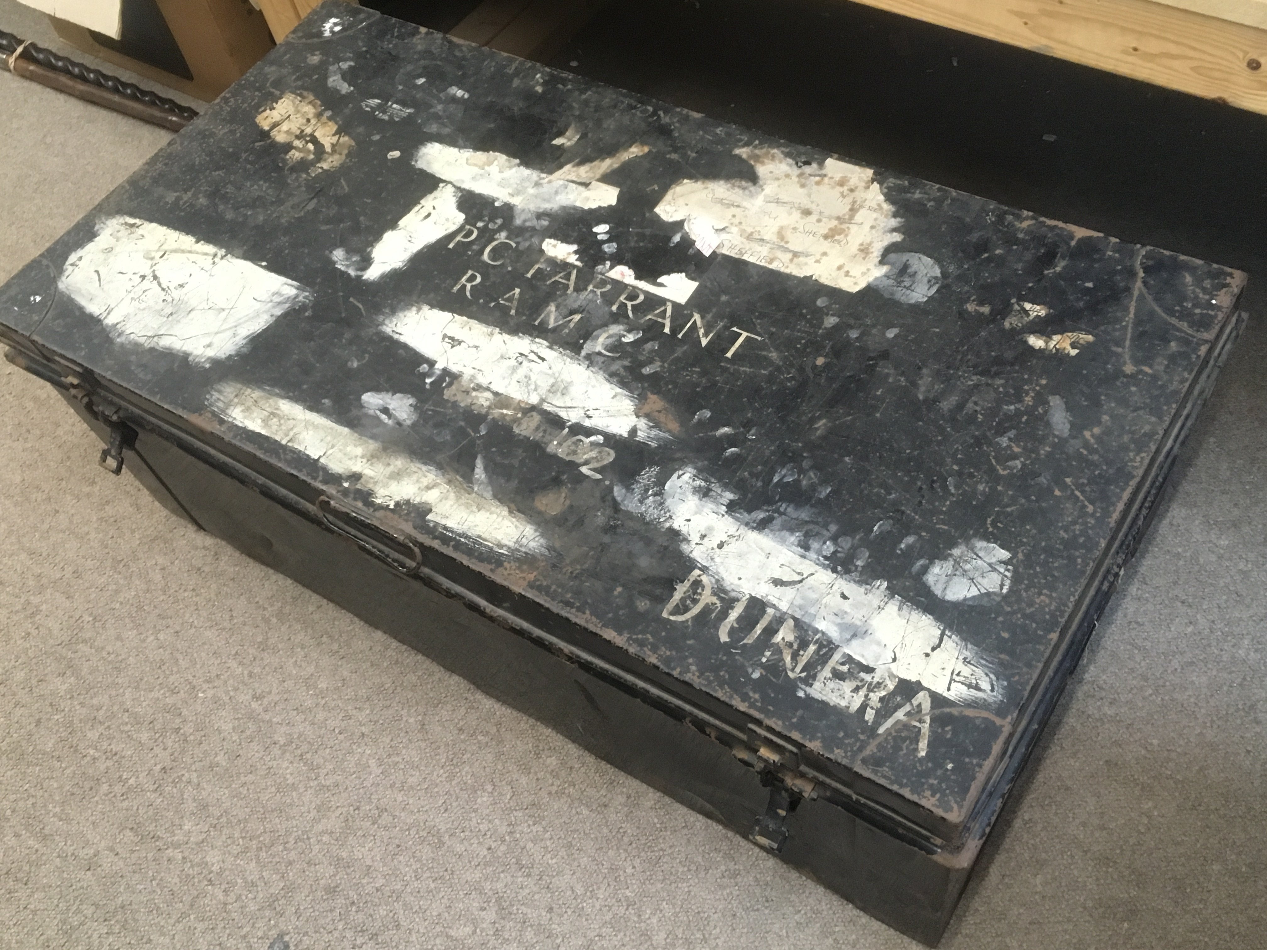 WITHDRAWN -P.C Farrant Trunk and uniform contents including battledress blouse and trousers 1949 pattern. This lot cannot be posted