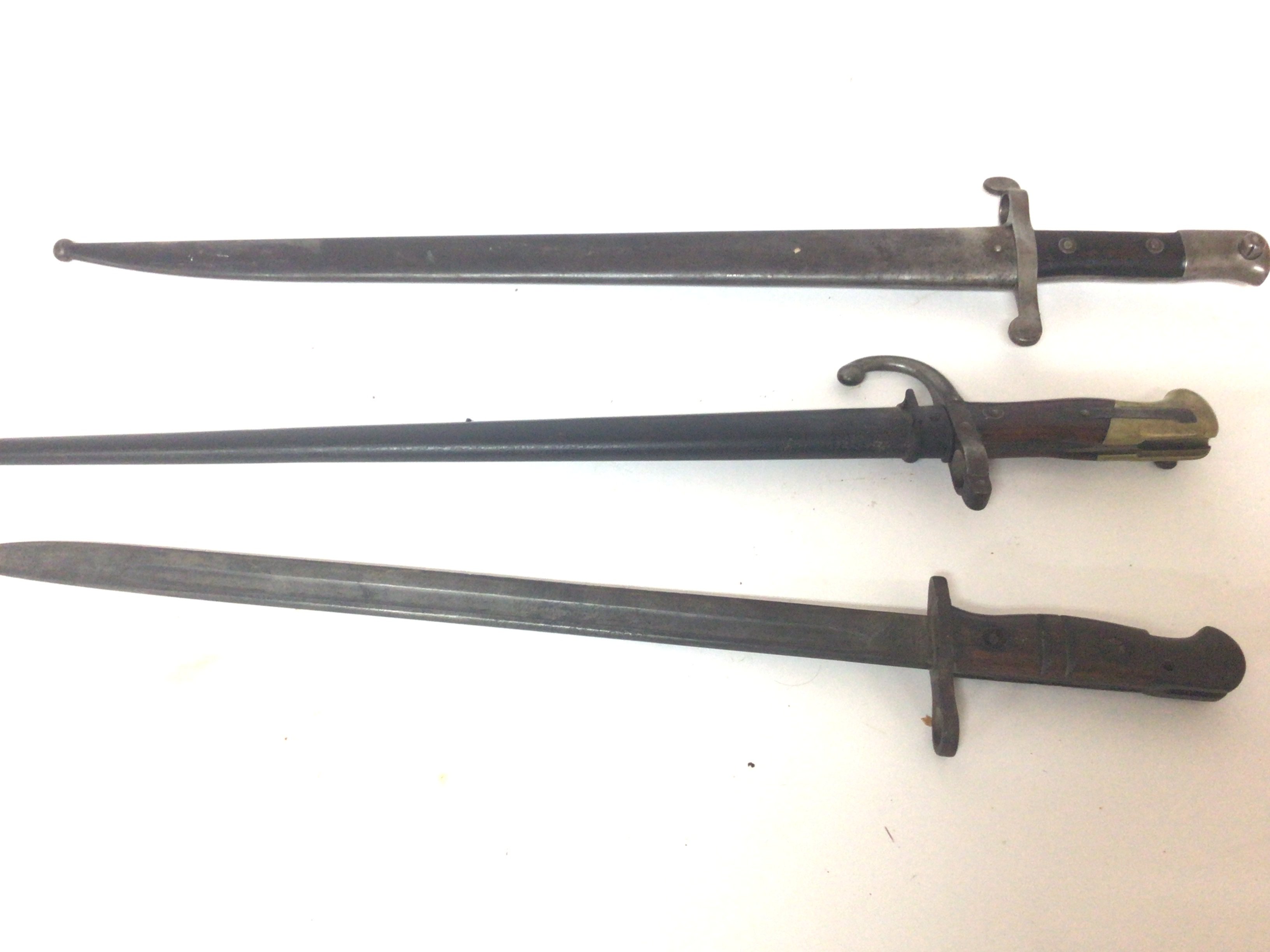 Three I world war or earlier bayonets an American military bayonet stamped US and date 1917 A French 1874 pattern bayonet and a German bayonet possible S98 pattern (3)