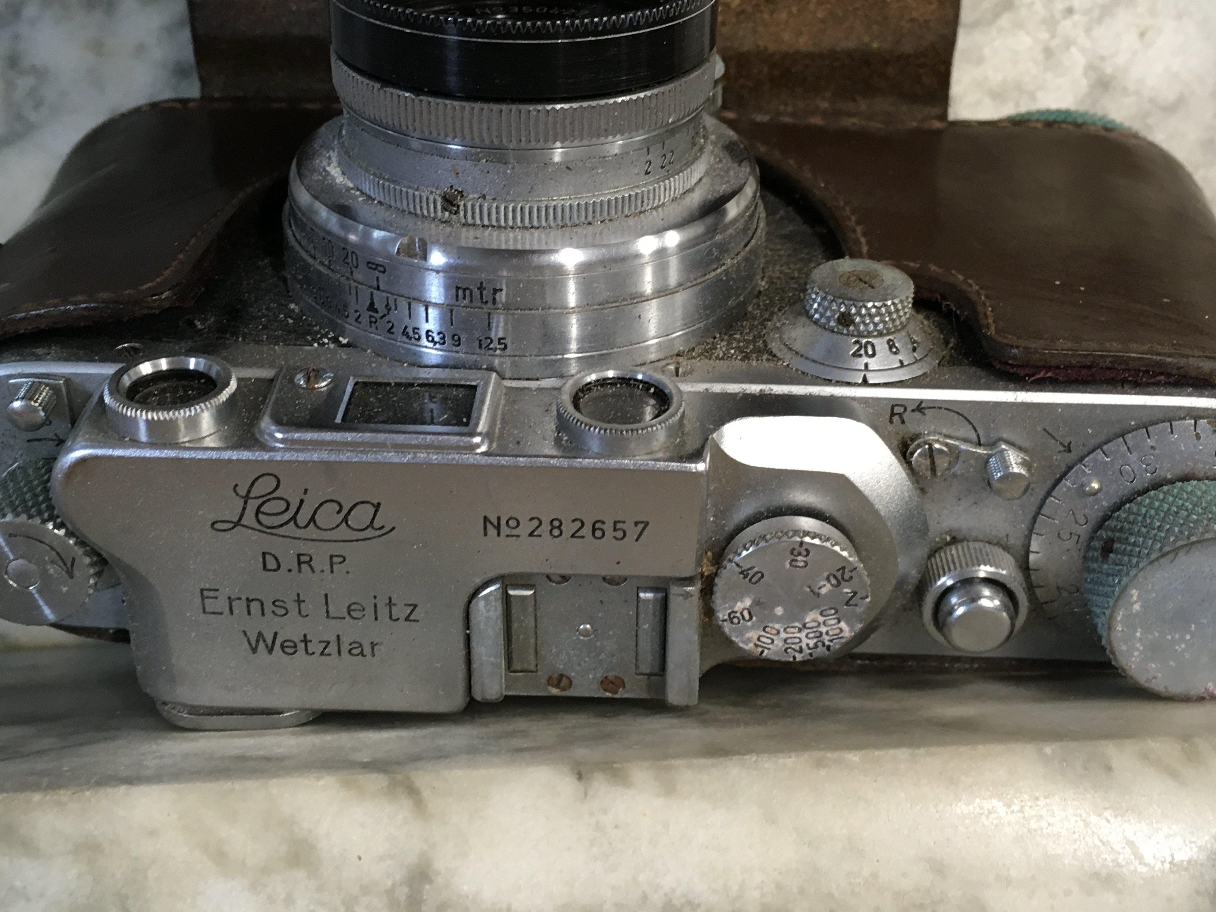 A Leica camera D.R .P No 282657 Summar lens 1.2 No 350427 .fitted in a leather case .