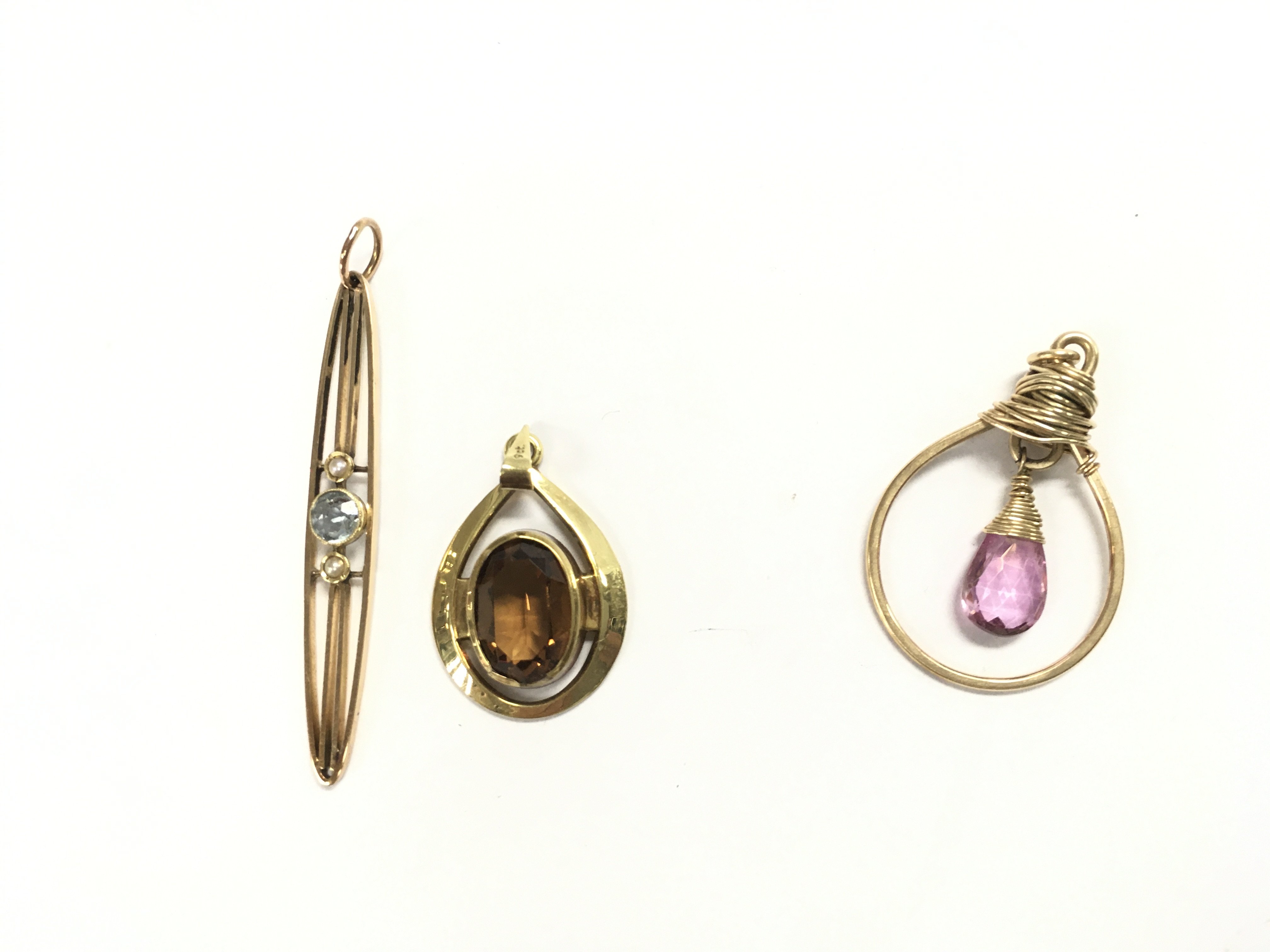 Two 9ct gold pendants 5g and one yellow metal pendant.