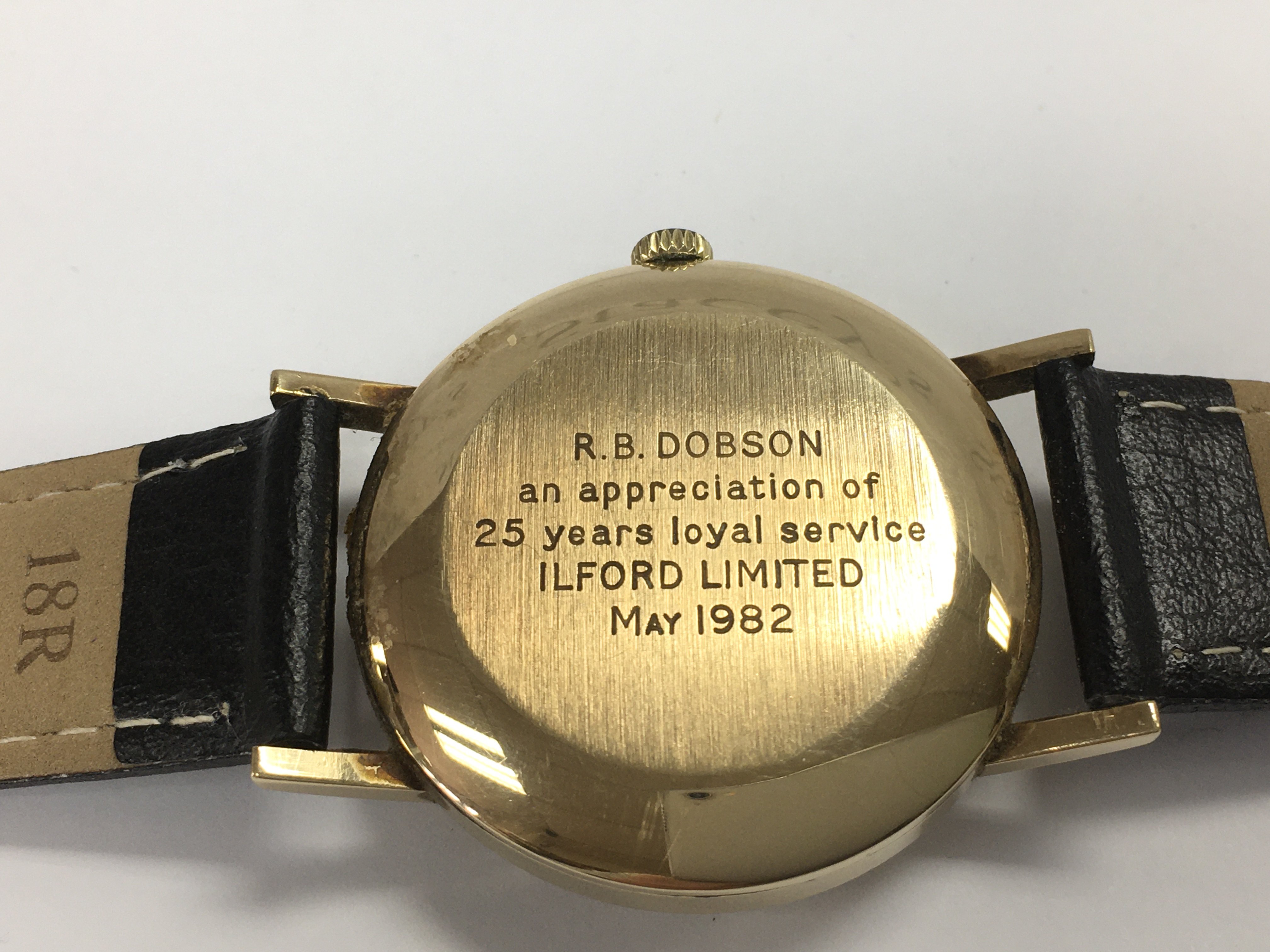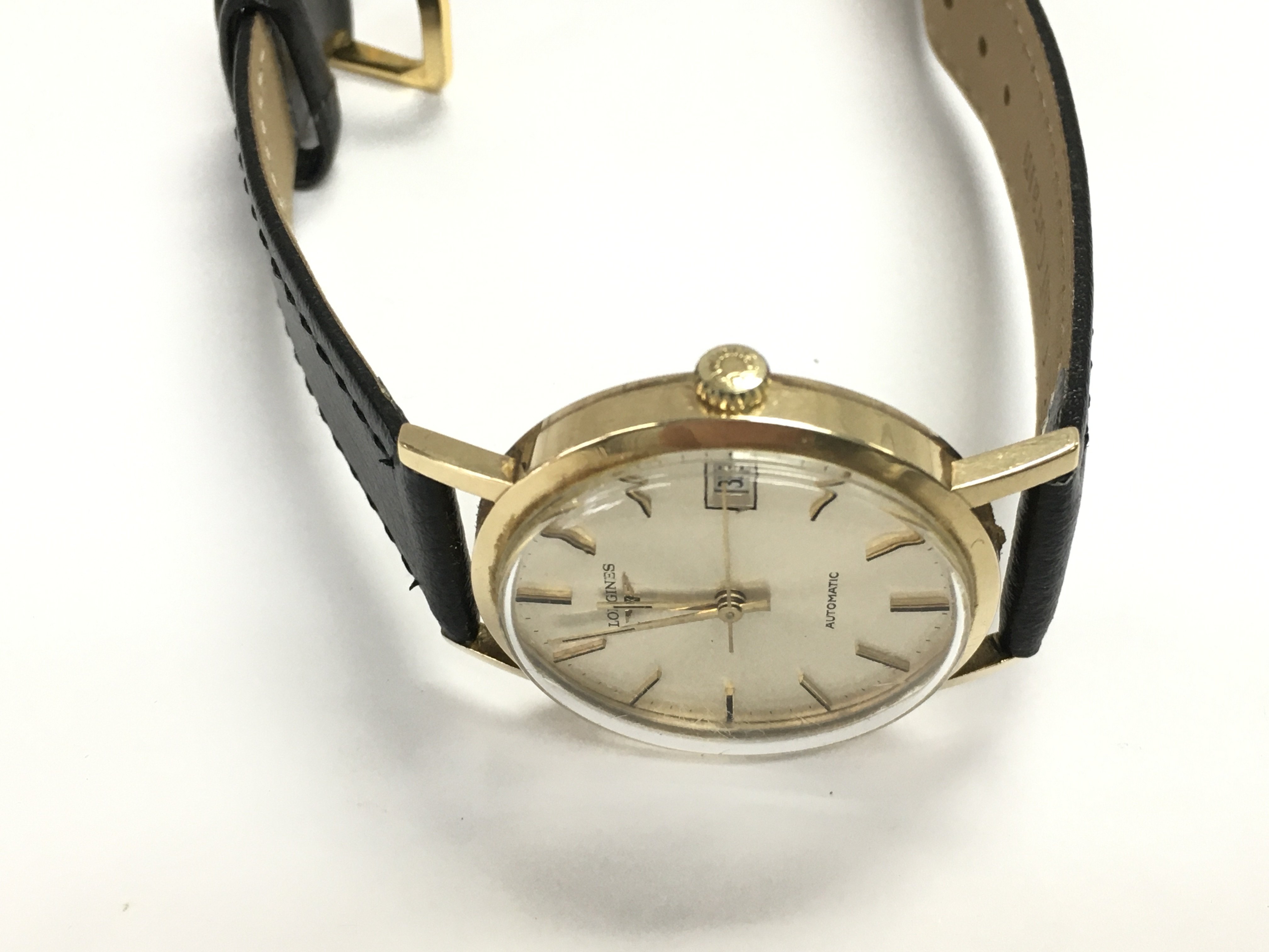 A 9ct gold cased gents Longines automatic wrist watch on black leather strap. Winds and runs. Postage B