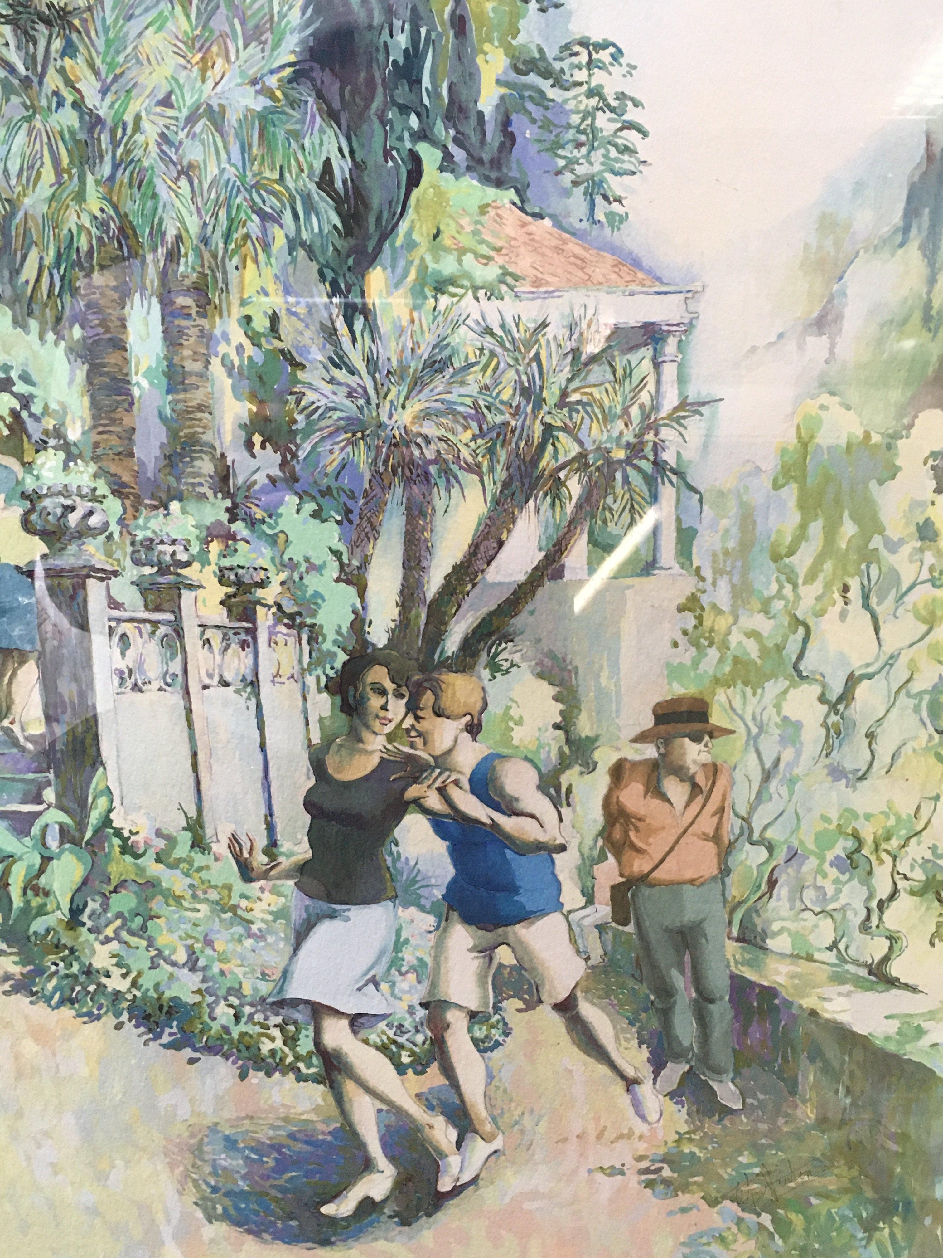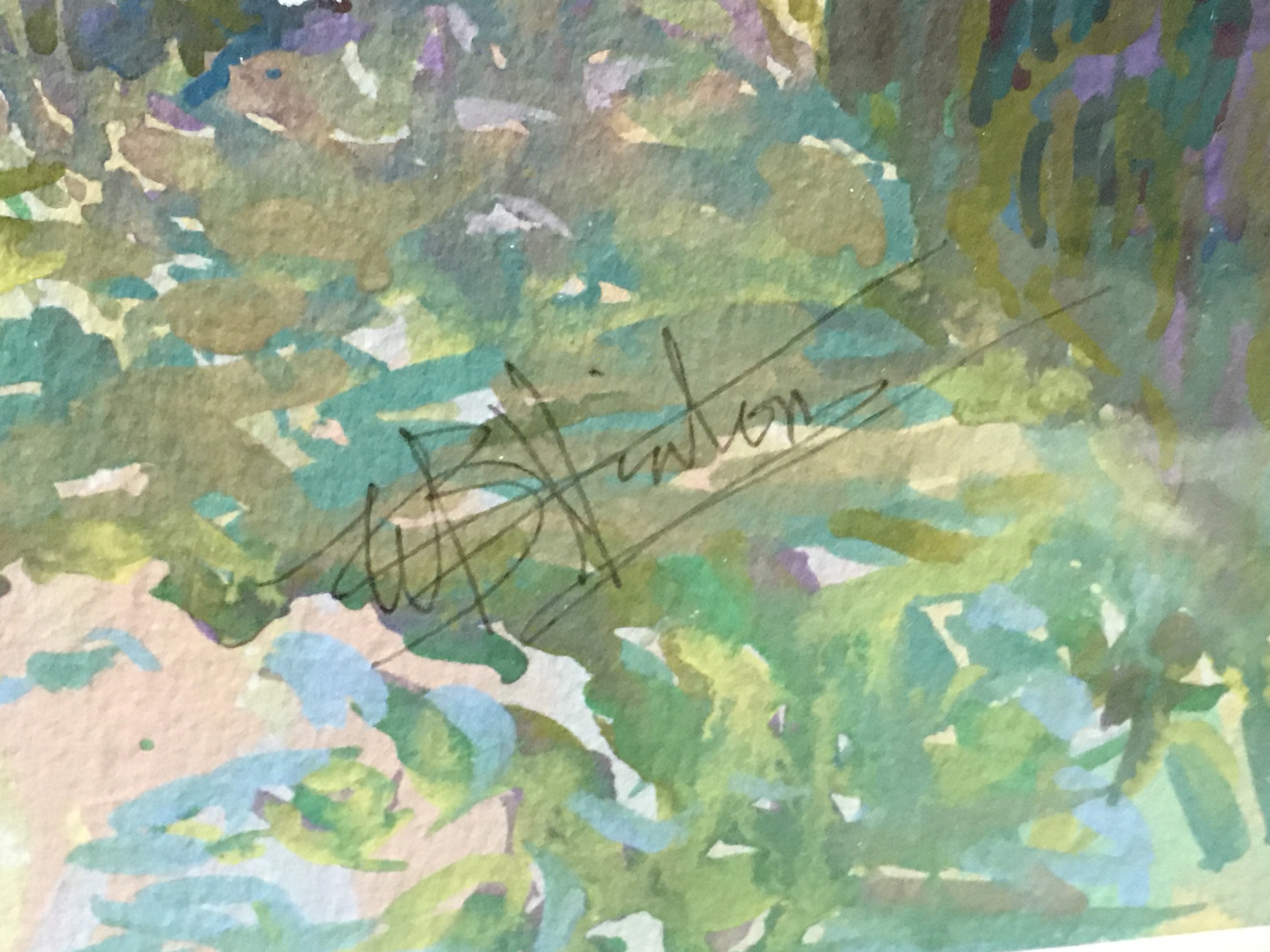 A framed Brian Hinton (1938-present) watercolour painting depicting people in a tropical environment. 76x90cm