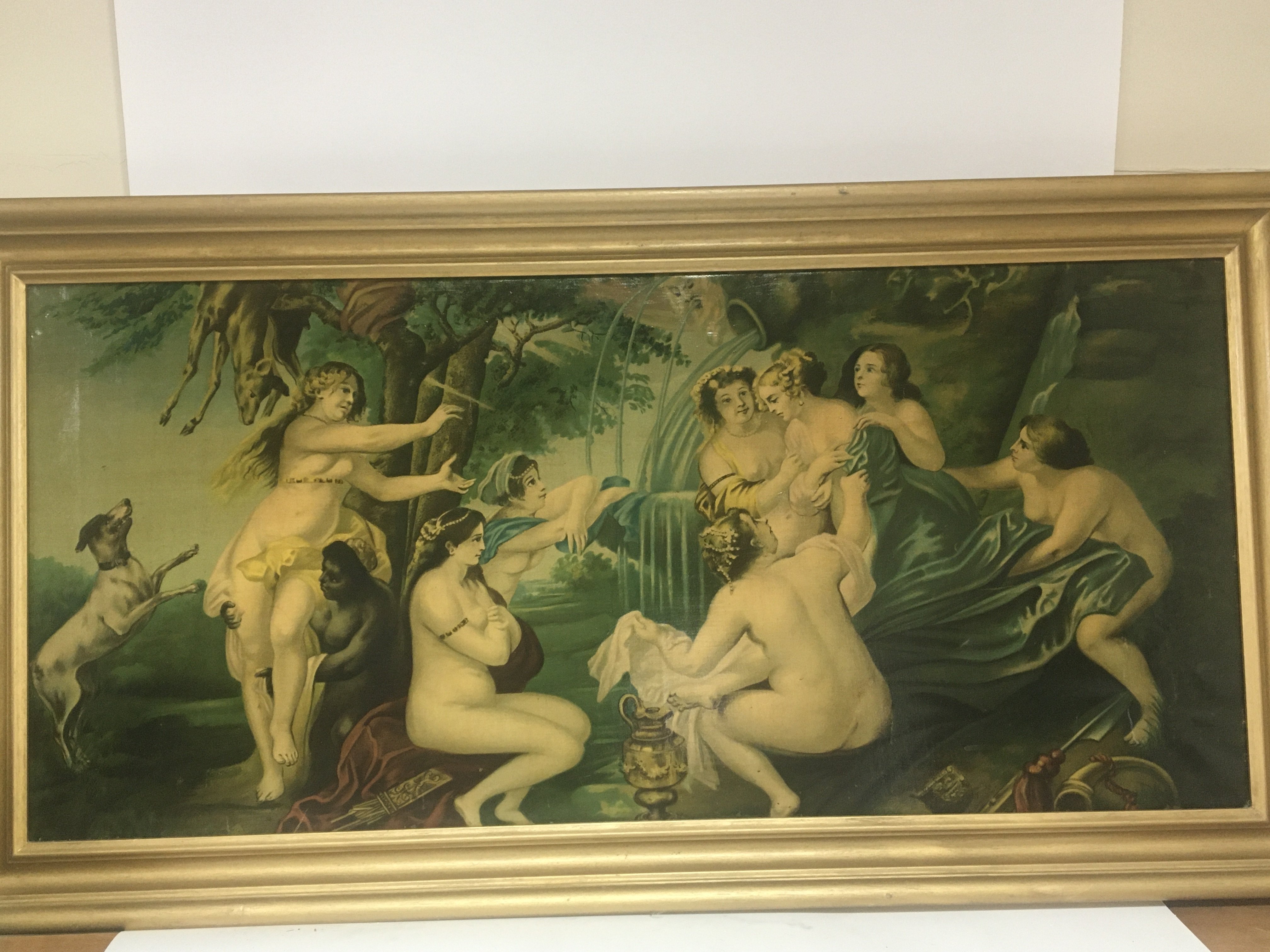 A framed picture on canvas depicting numerous bathing nymphs within a garden landscape with water fall. 121x64cm