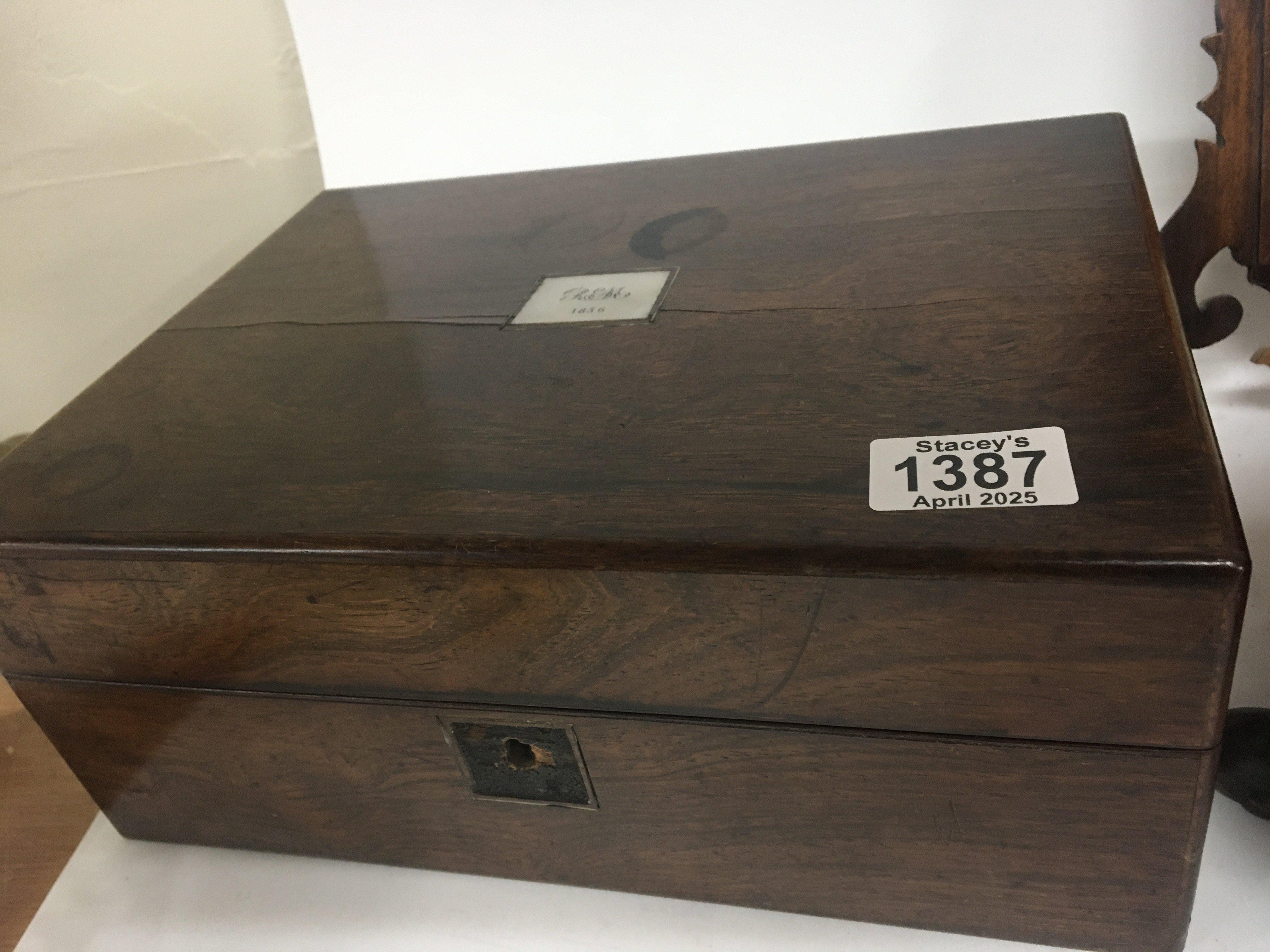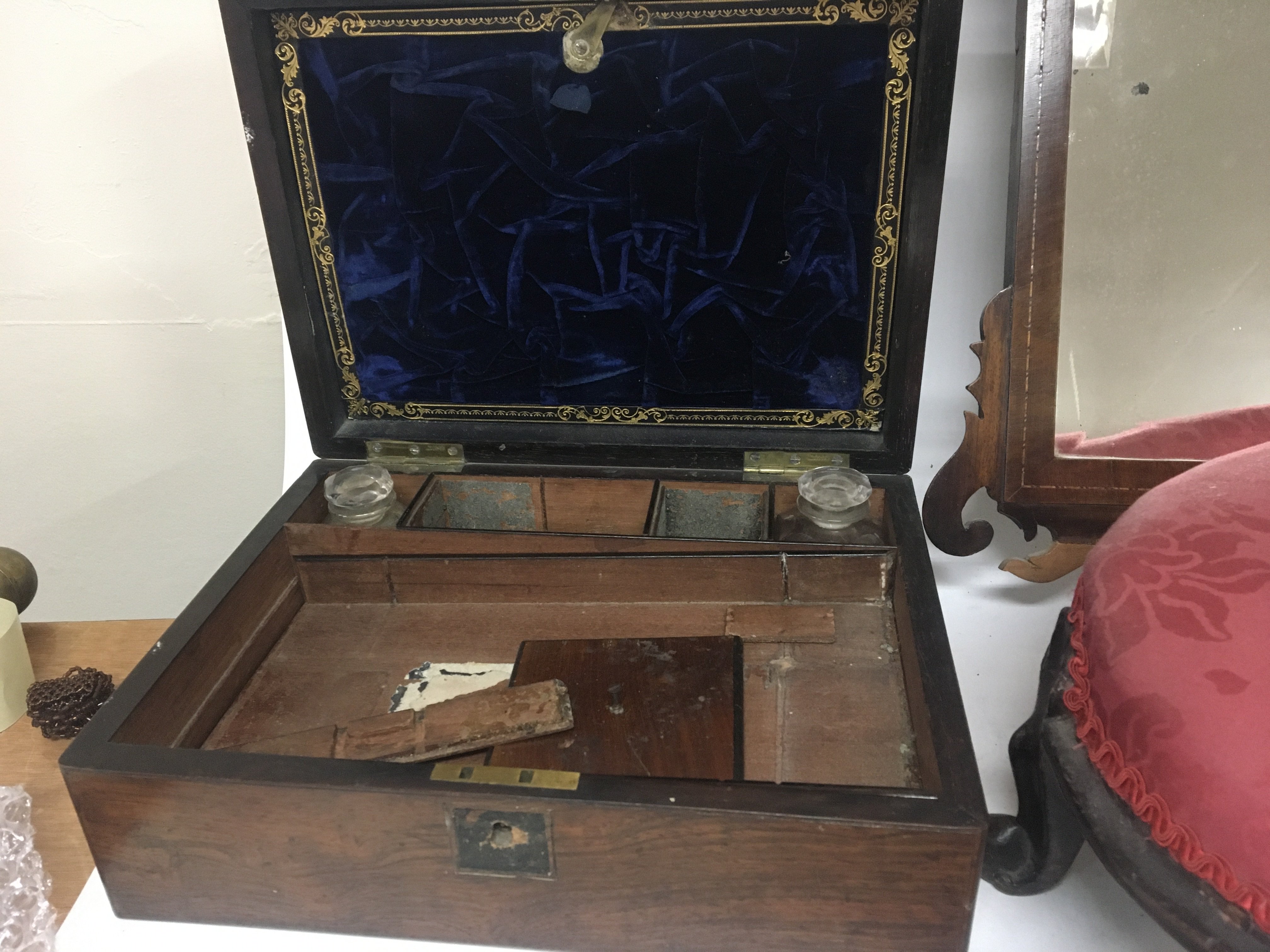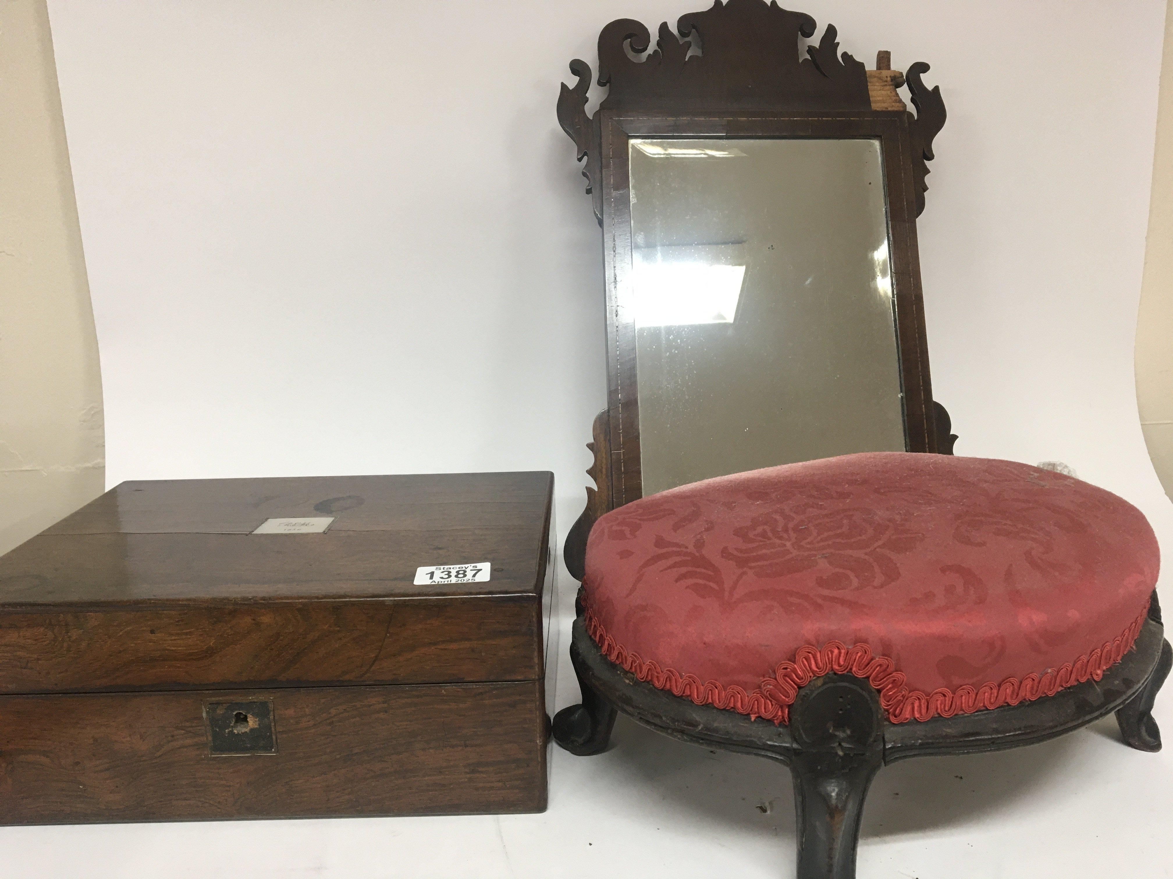 A Victorian rosewood traveling box with a fitted interior a Victorian stool and a George III wall mirror (3)