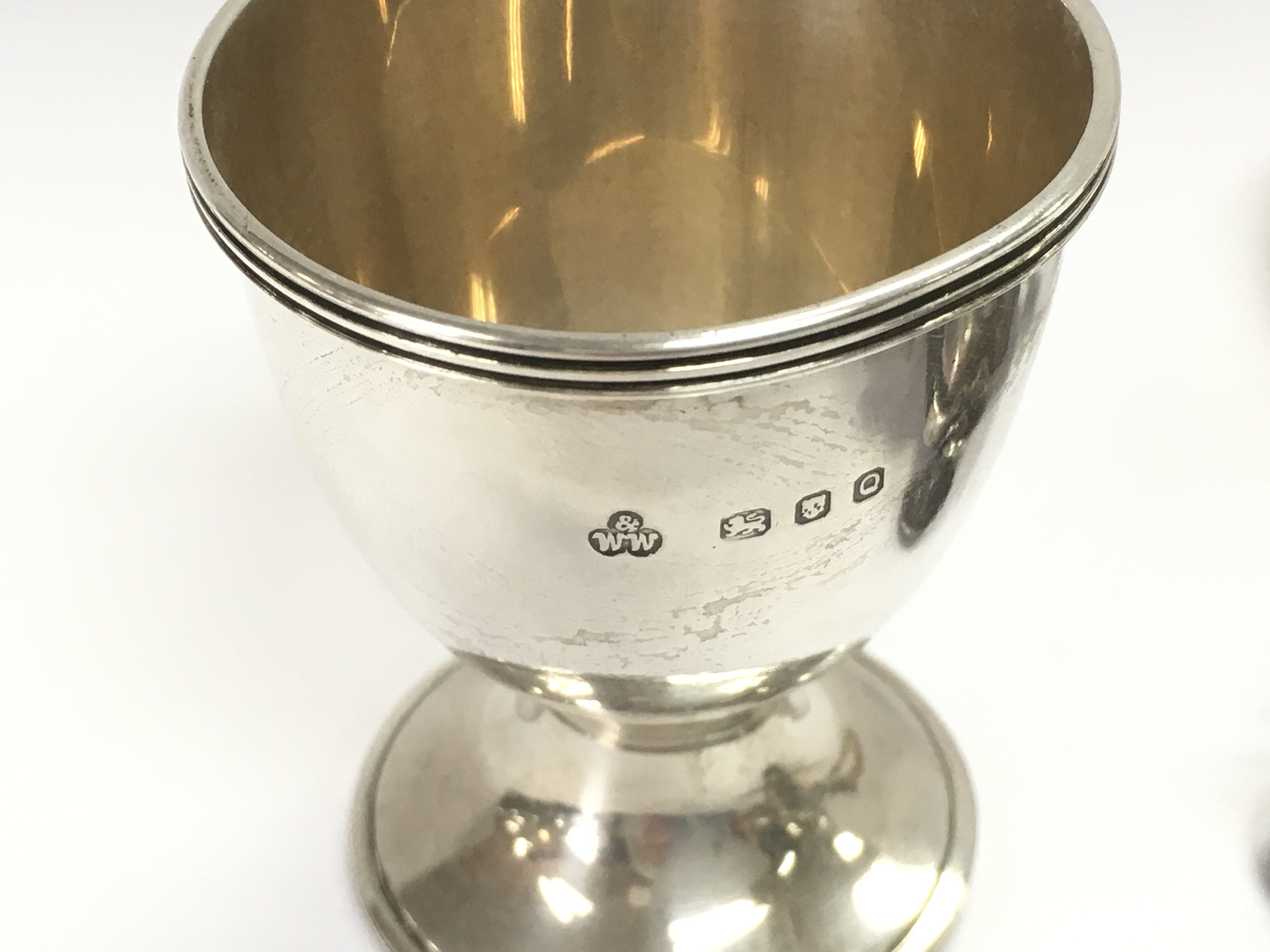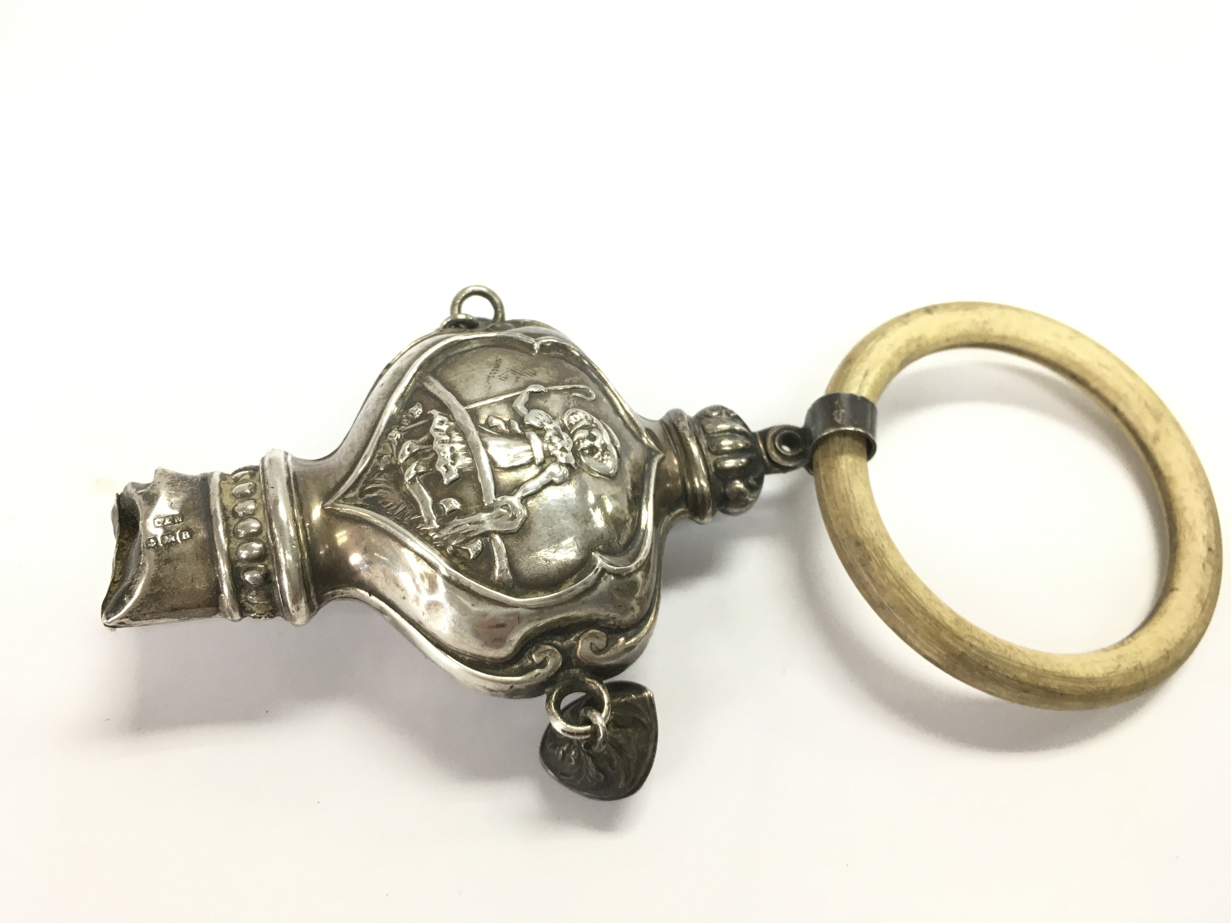 A London hallmarked silver egg cup from circa 1950 weighing 28.81g and a Birmingham hallmarked silver 1926 Rattle 44.25g