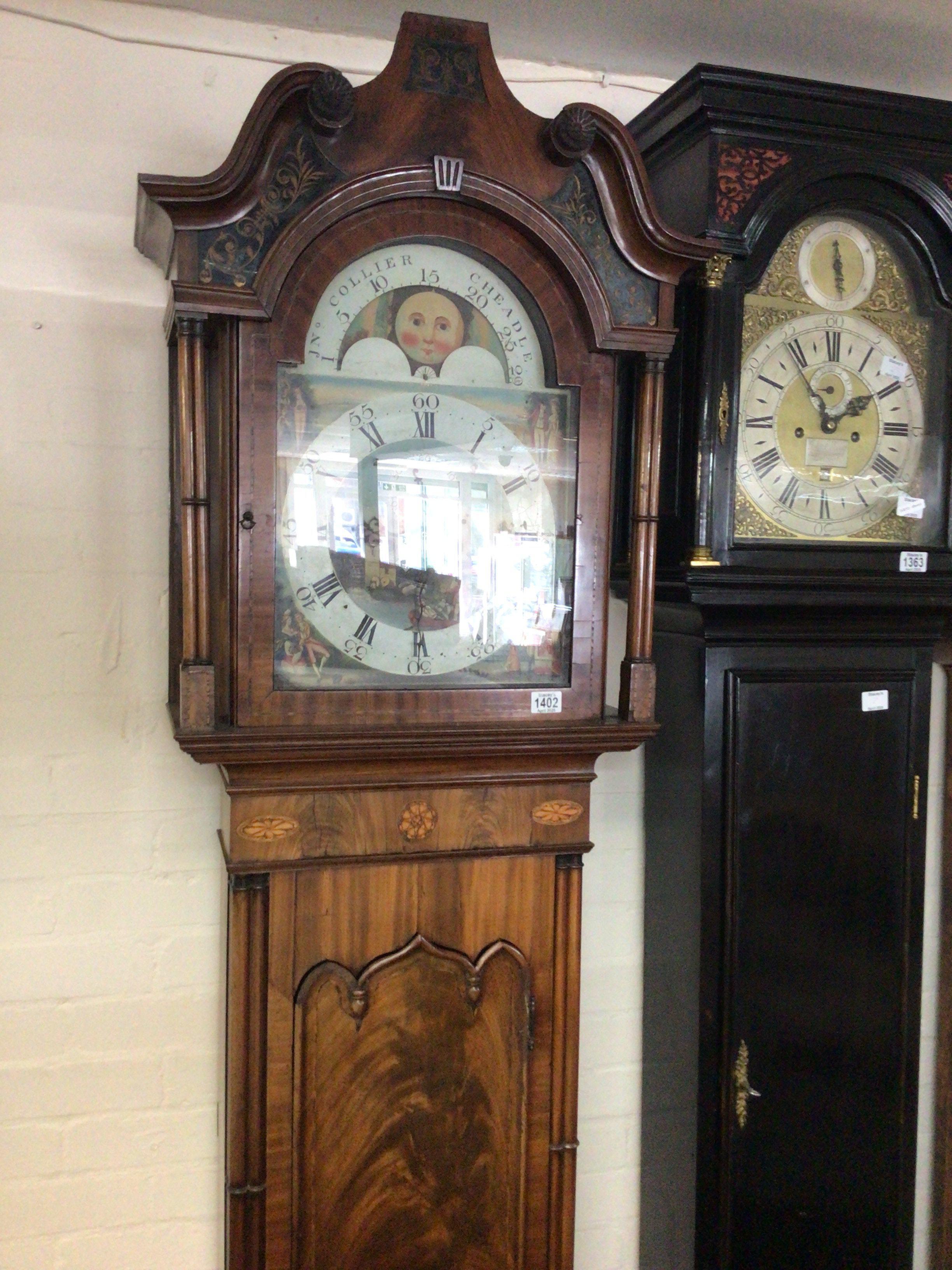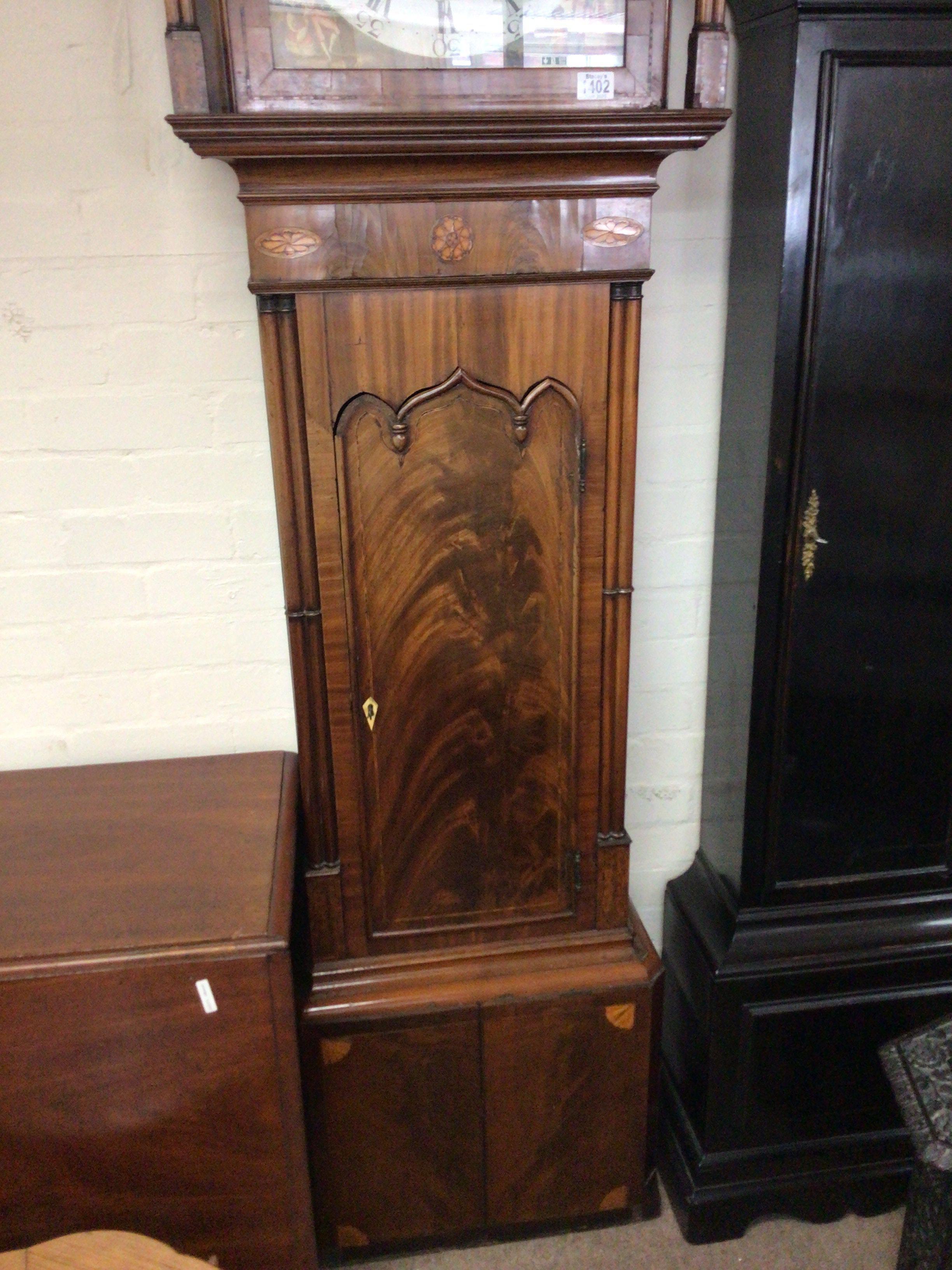 An elaborate Mahogany George III long case clock the inlaid case with fluted pilasters with an arches swan neck pediment with a painted dial and moon roller eight day going with weights and pendulum.