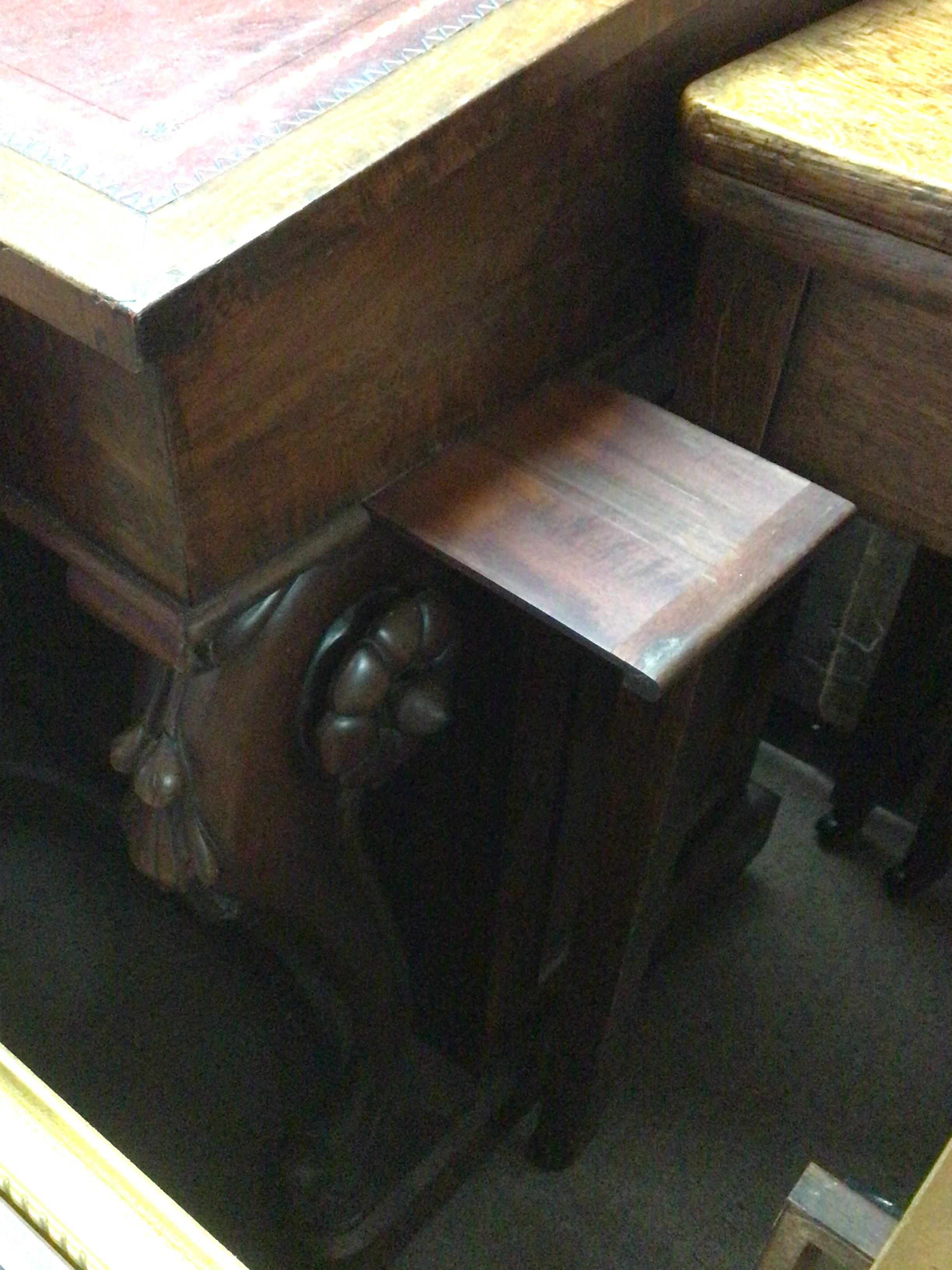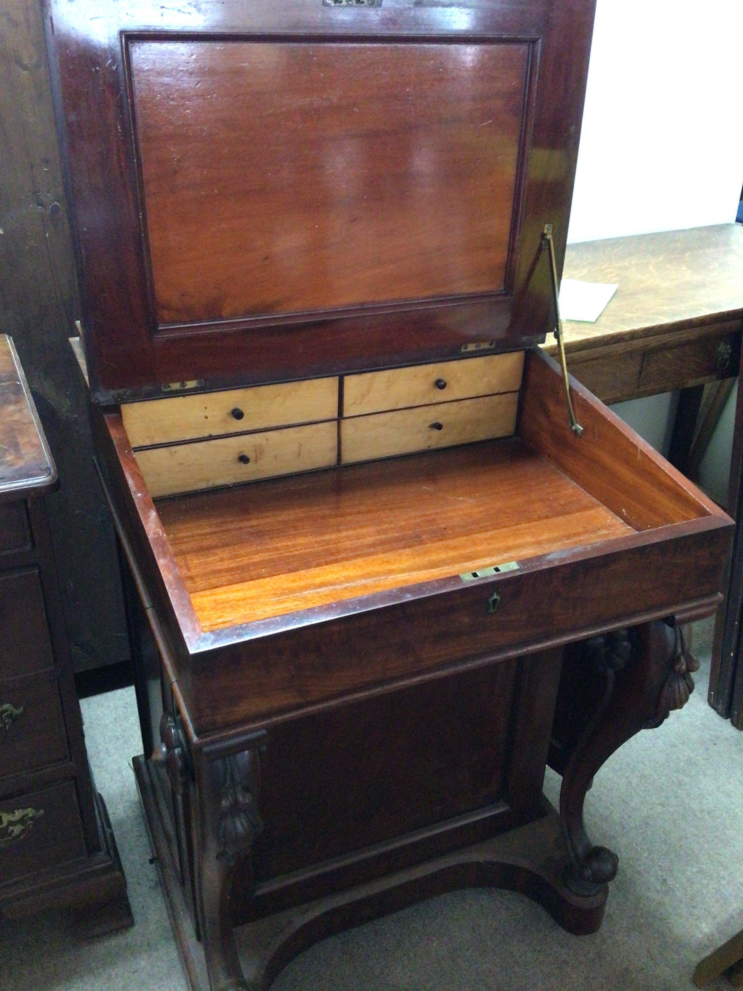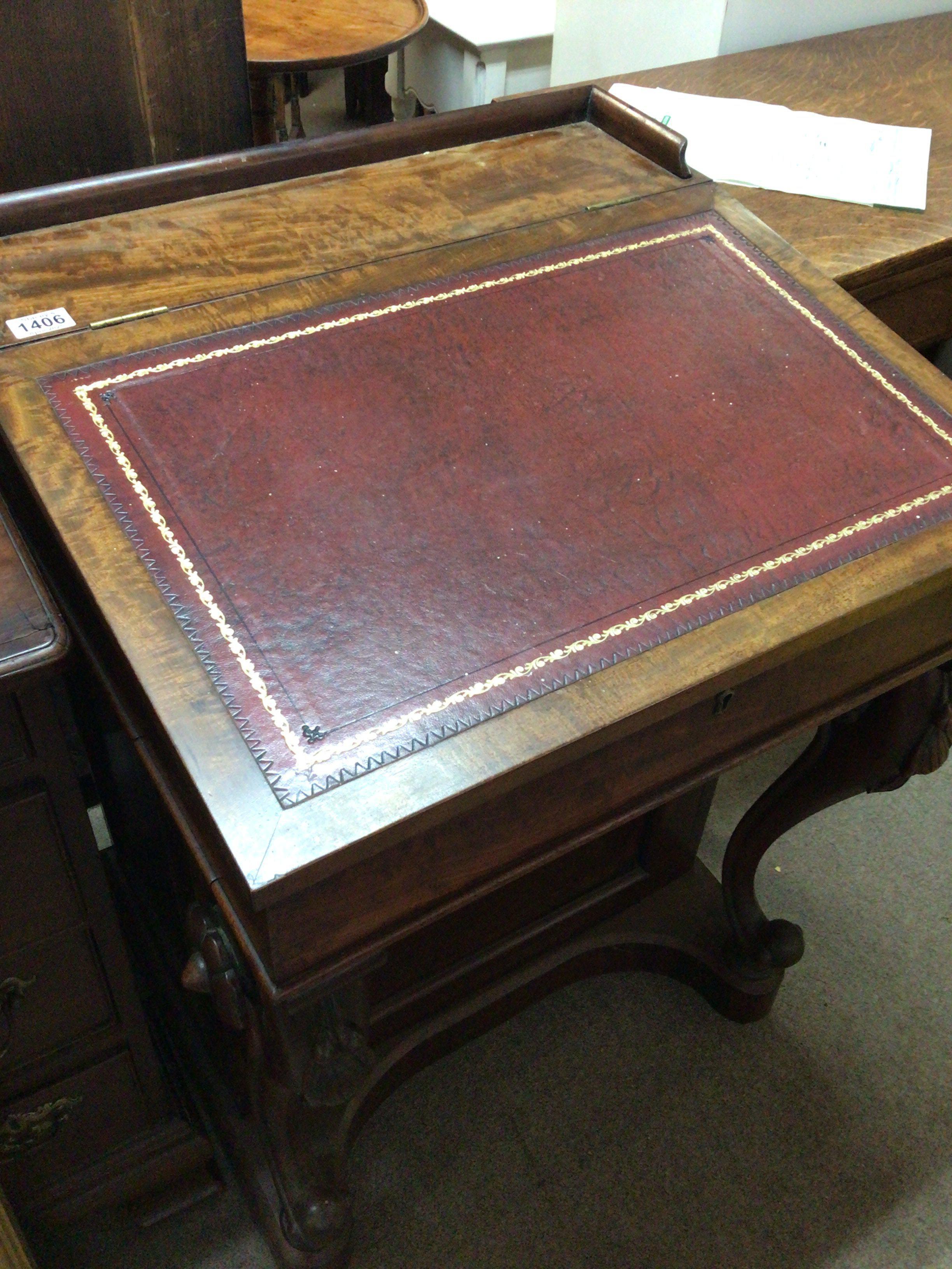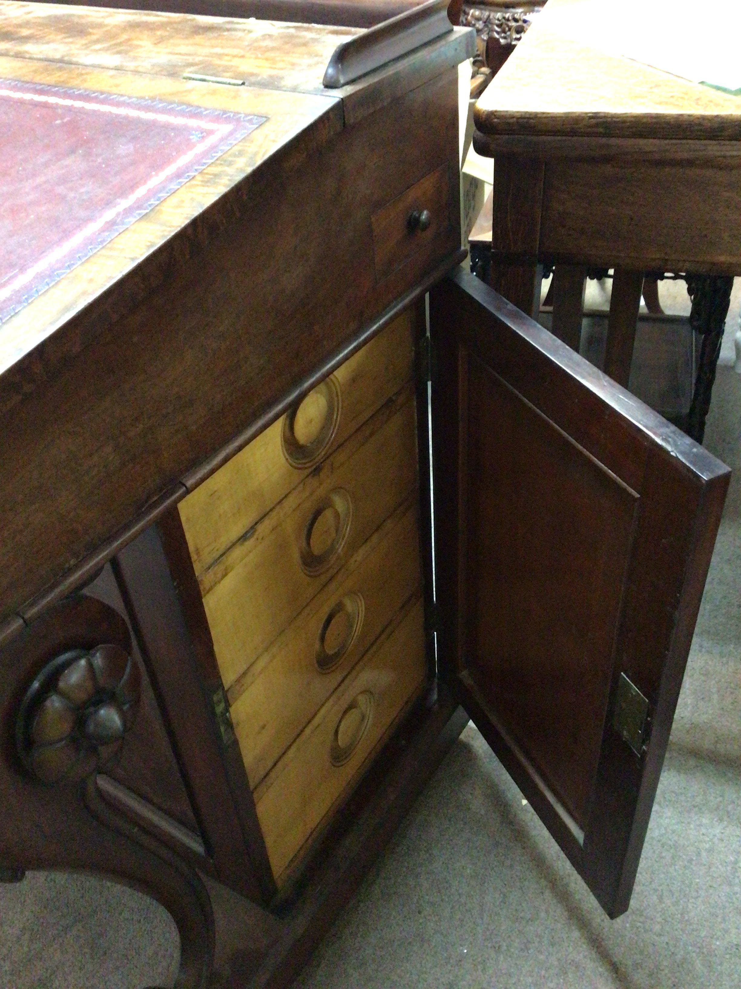 A William IV figured mahogany Davenport the hinged top enclosing a well fitted interior with satinwood drawers the scroll supports with raised floral roundels the side cupboard with a flight of four satinwood drawers.
