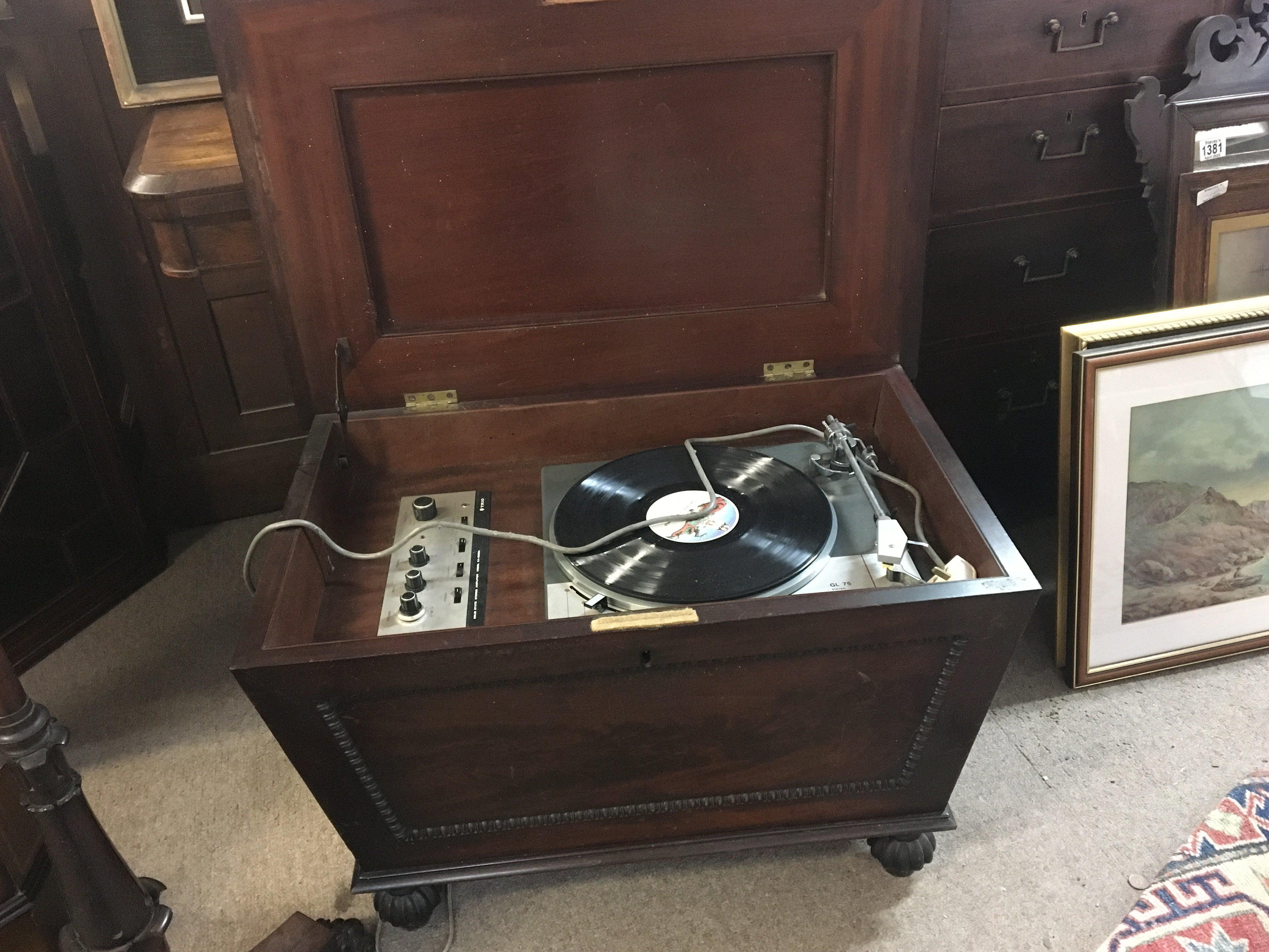 A William IV mahogany wine cooler with a stepped rectangular top the interior later fitted with a vintage Trio solid state Stereo amplifier KA 2000A and a Swiss made Goldring Lenco GL 75 record deck.