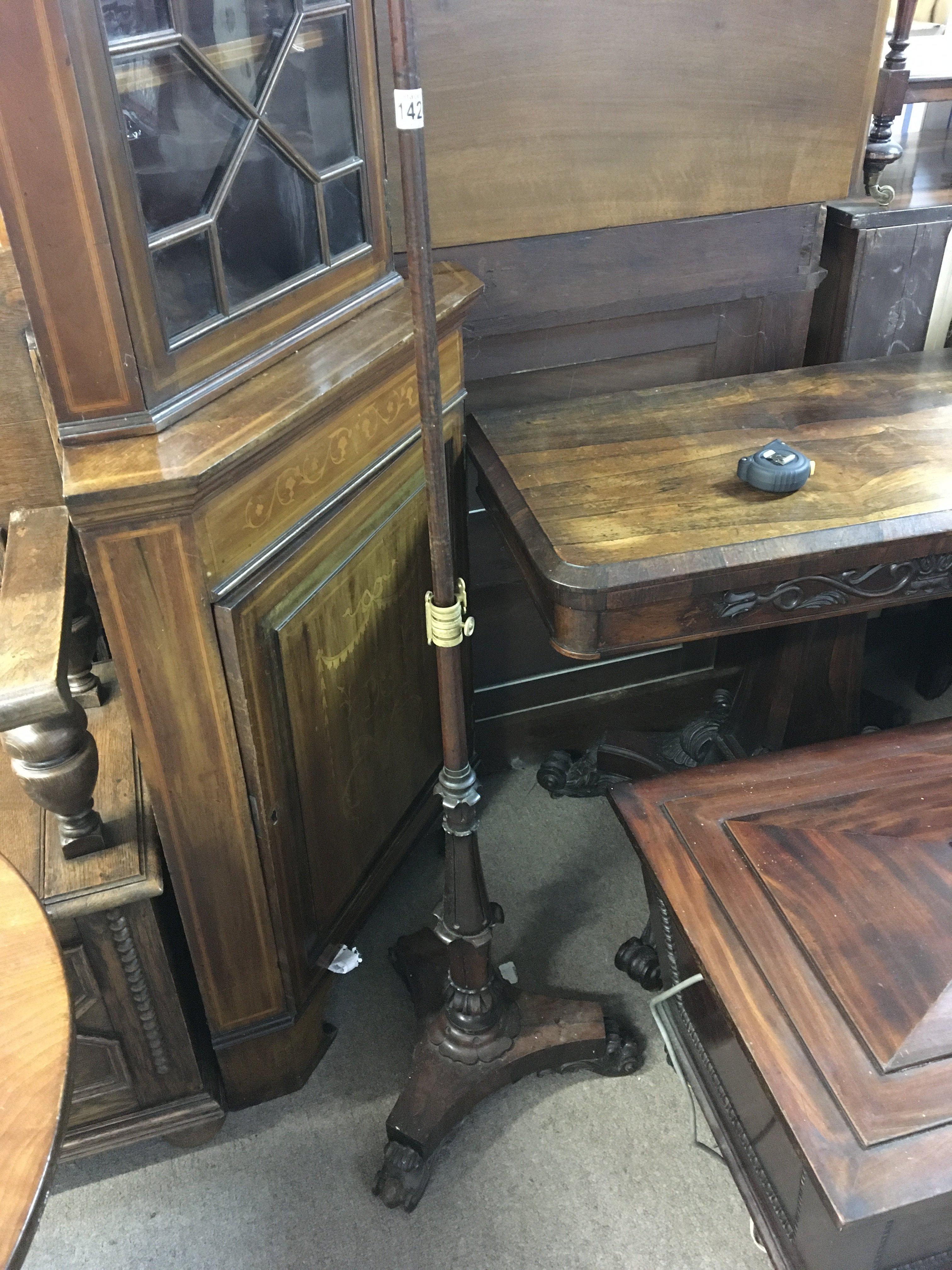 A William IV Rosewood pole screen with an elaborate support and scroll feet.