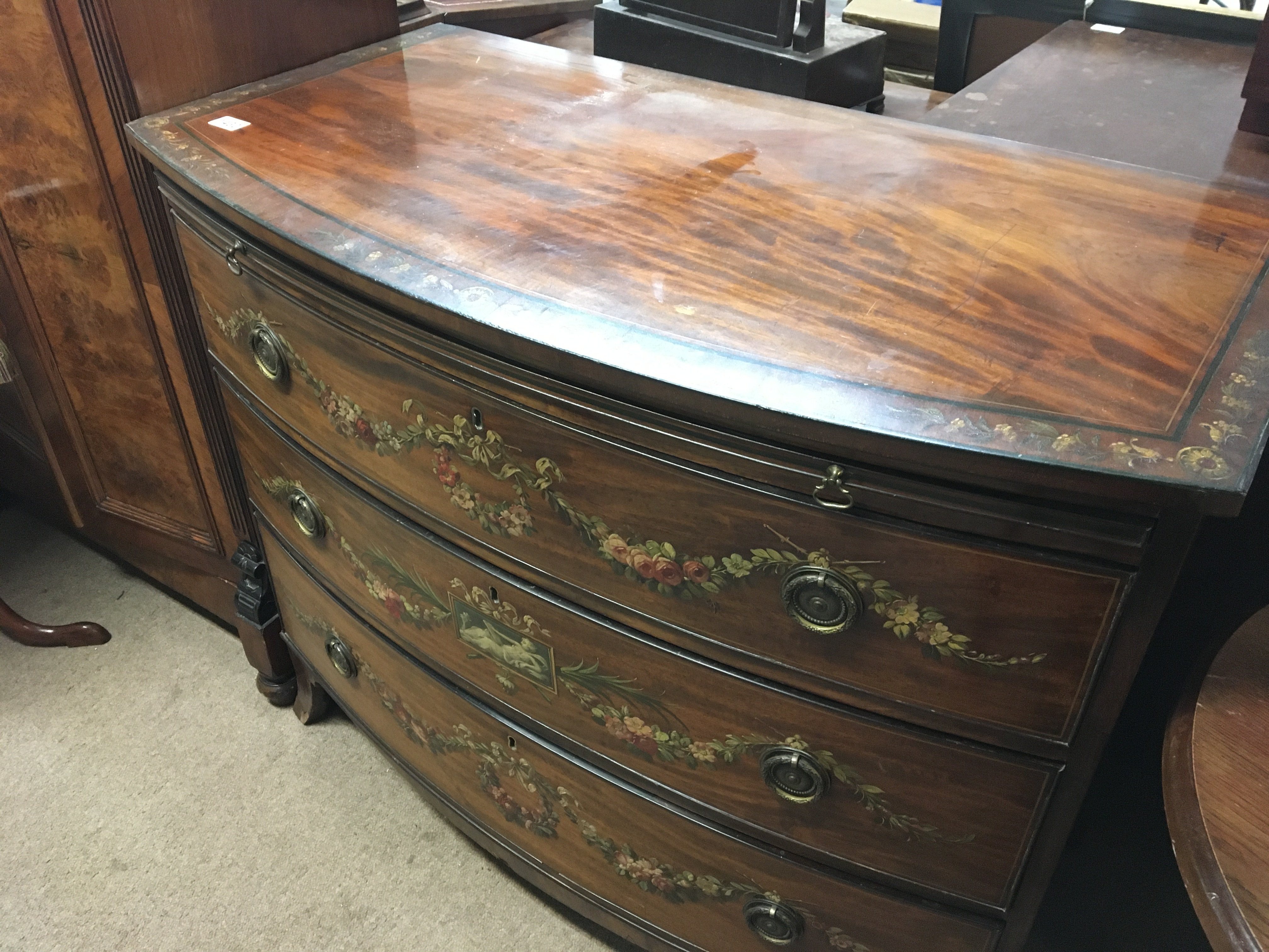 A Quality late George III hand painted bow fronted chest of drawers with a brushing slide on swept bracket feet. Length 42cm