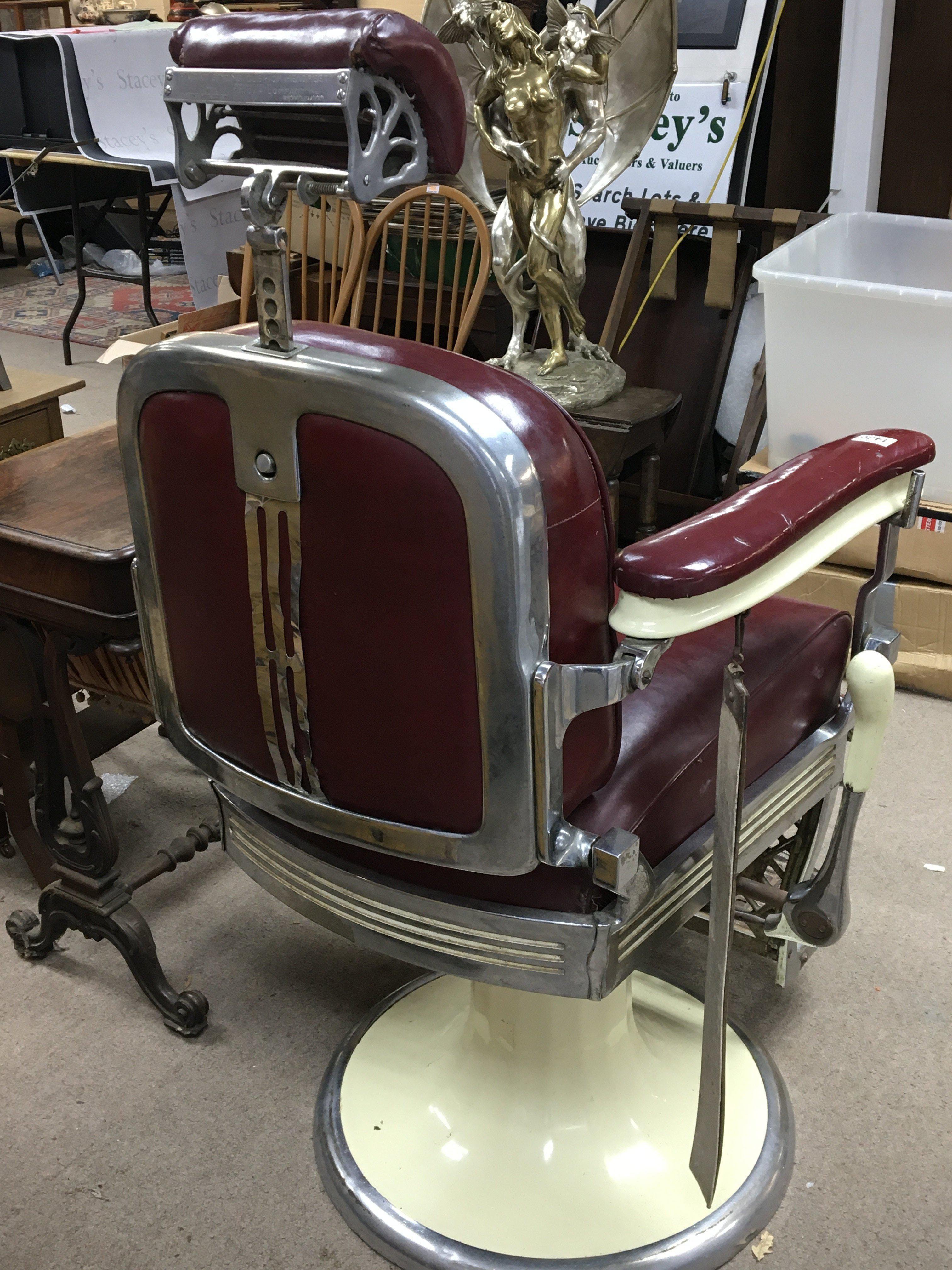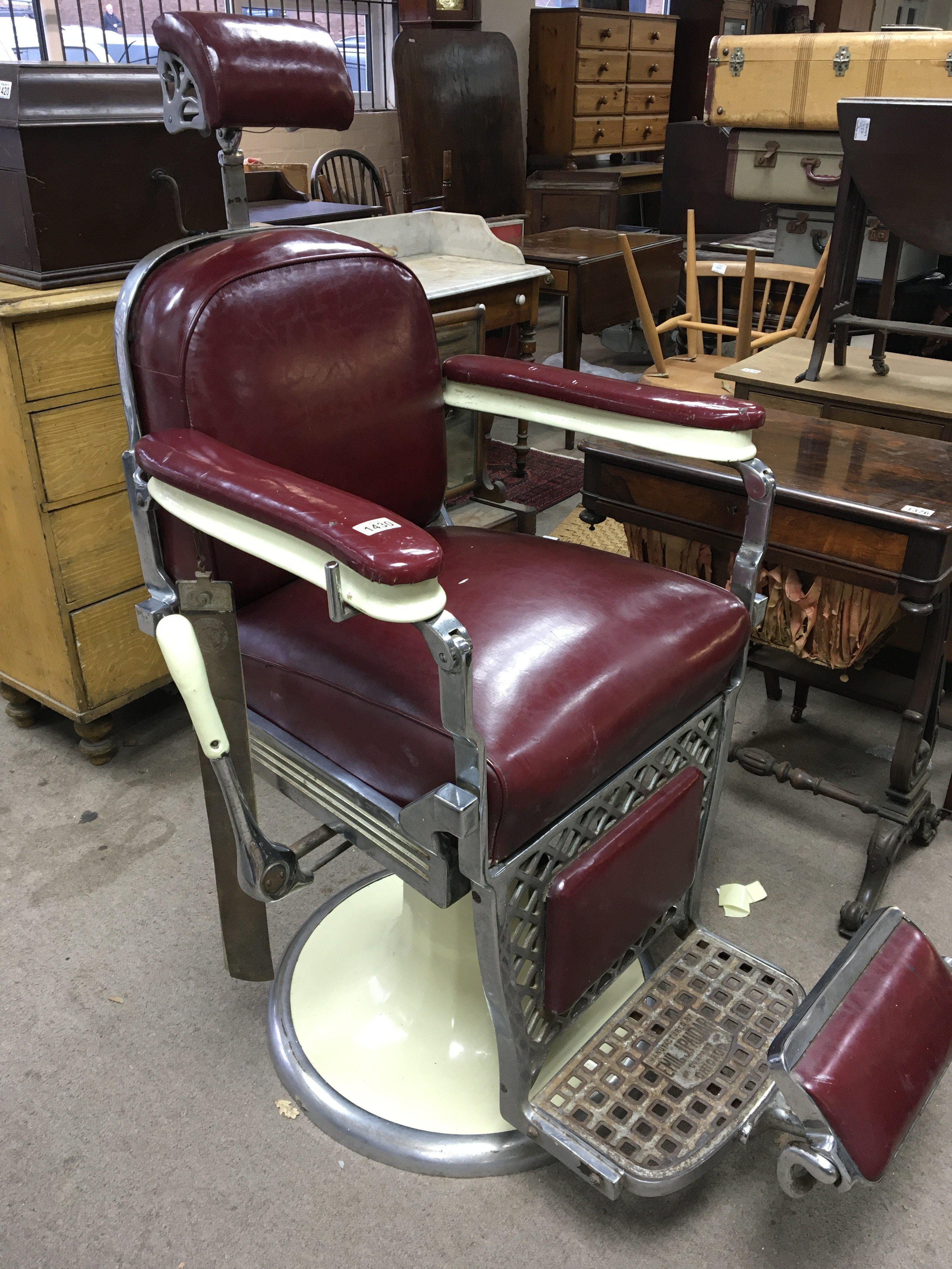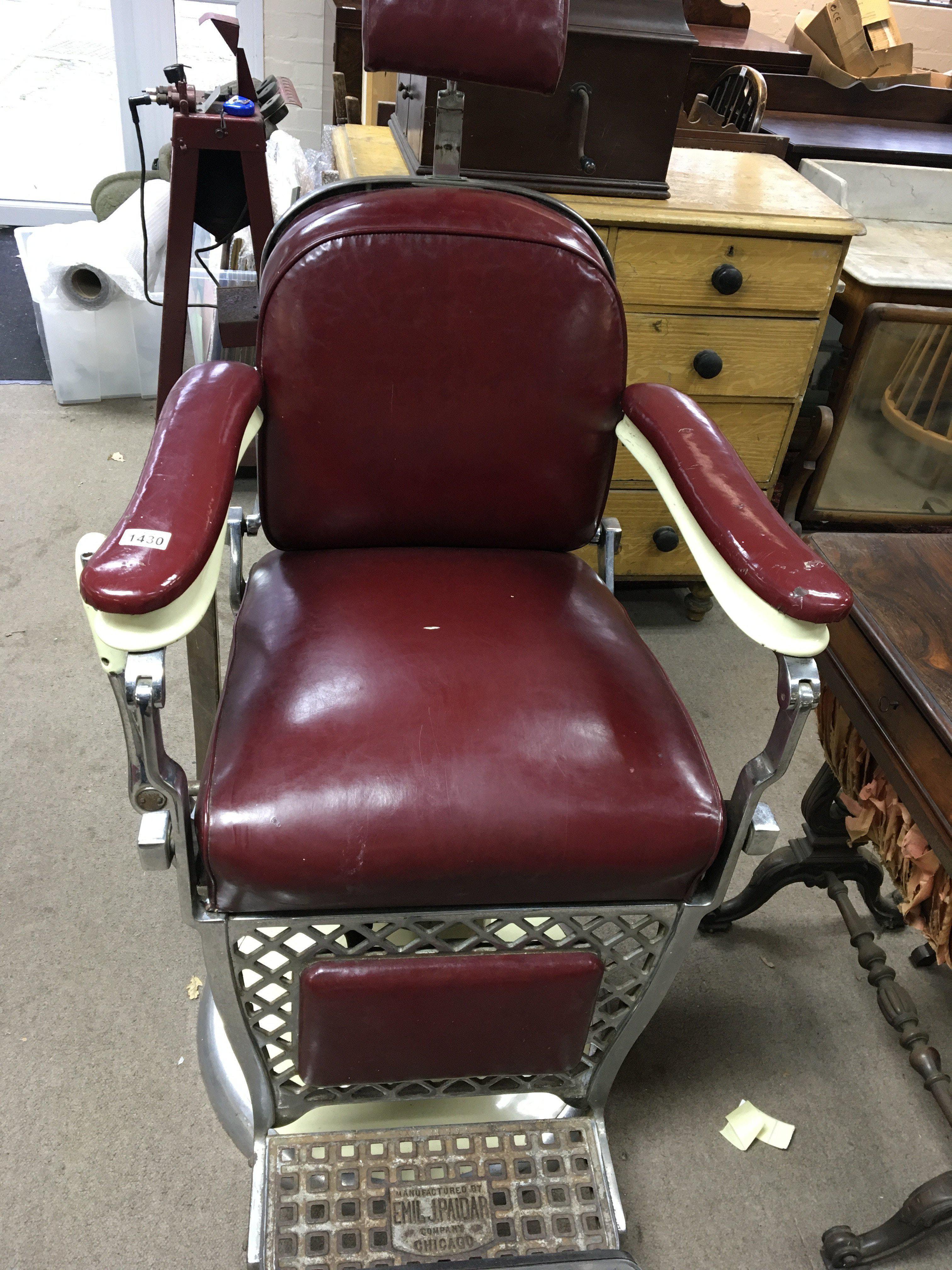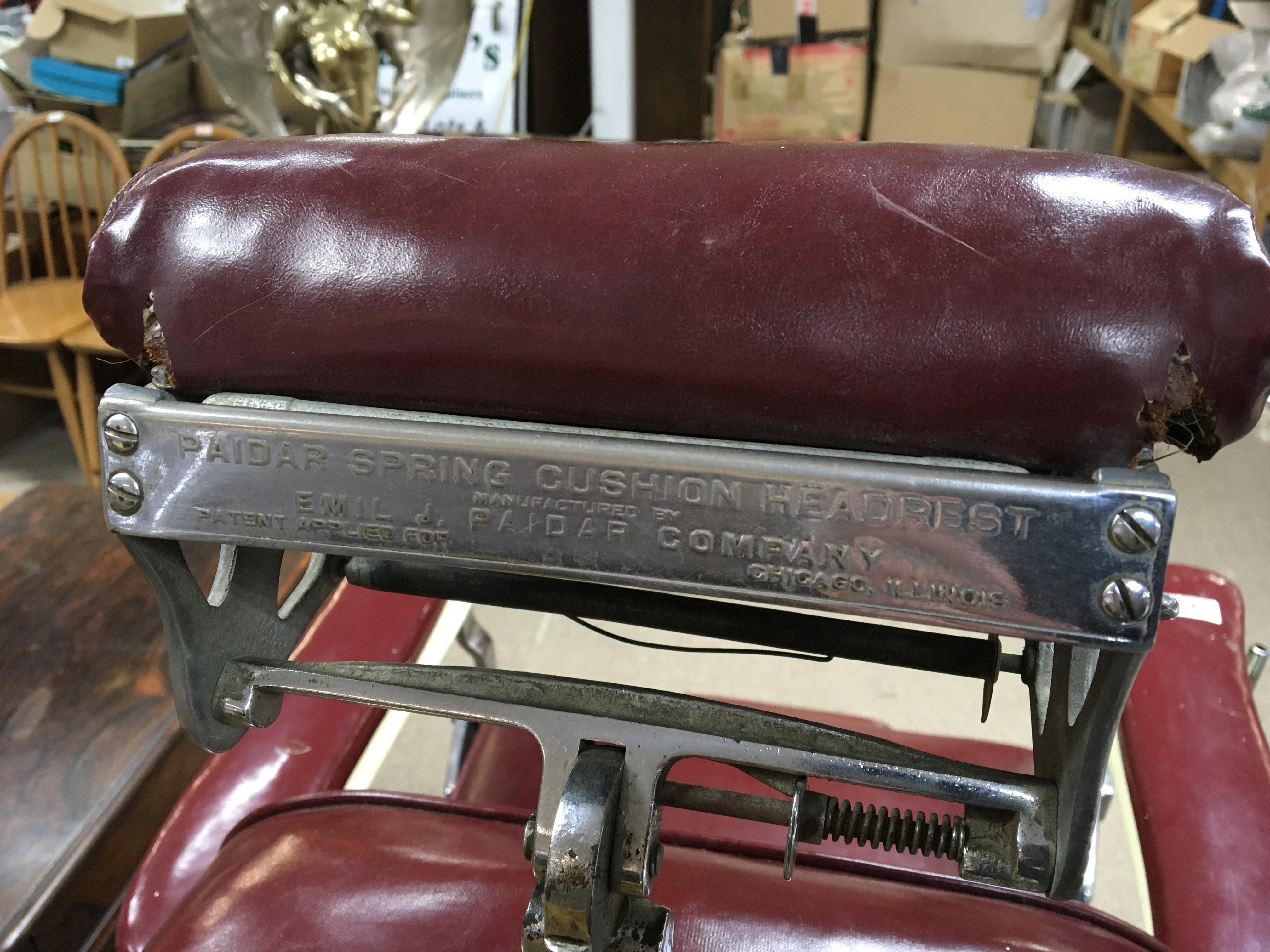 A Quality and rare Vintage 1930s Professional American barbers chair with a deep red upholstery and chrome frame fully adjustable. maker Emile J.Paidar Company Chicago