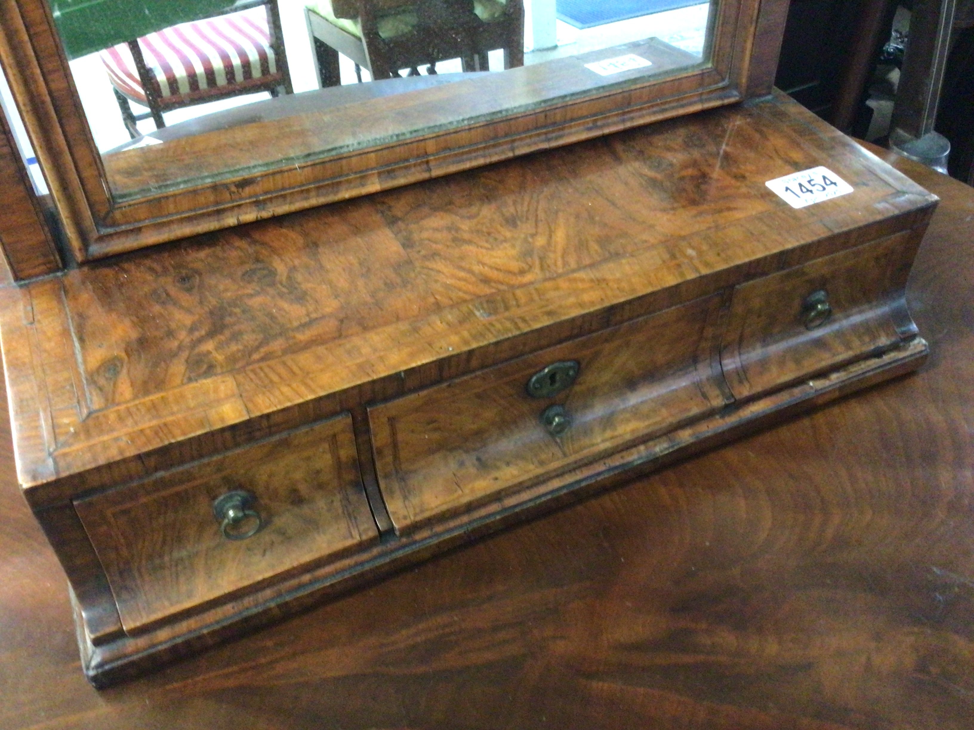 A fine George II figured walnut with fine feather banding table top dressing mirror with three drawers. Height 67cm