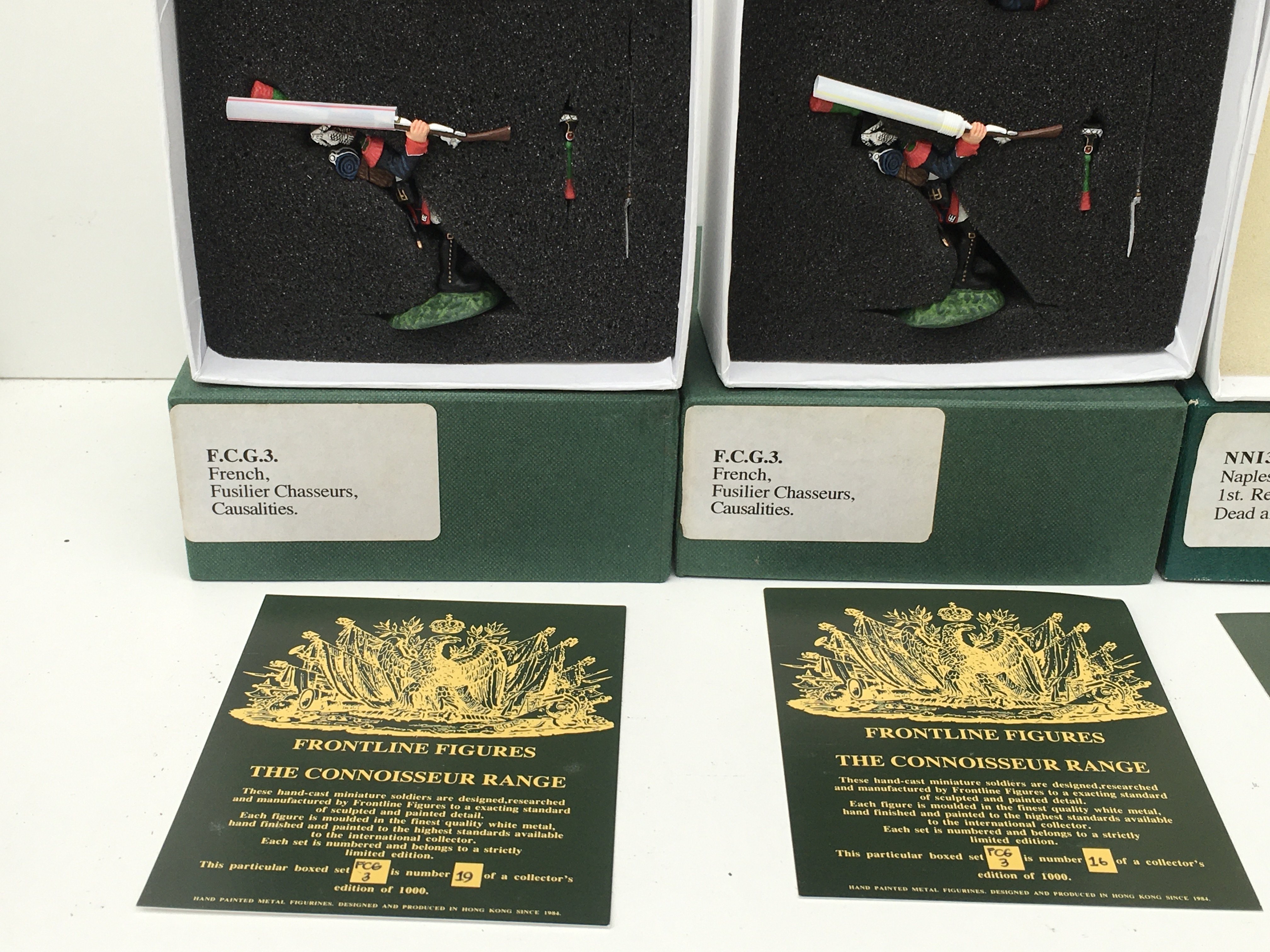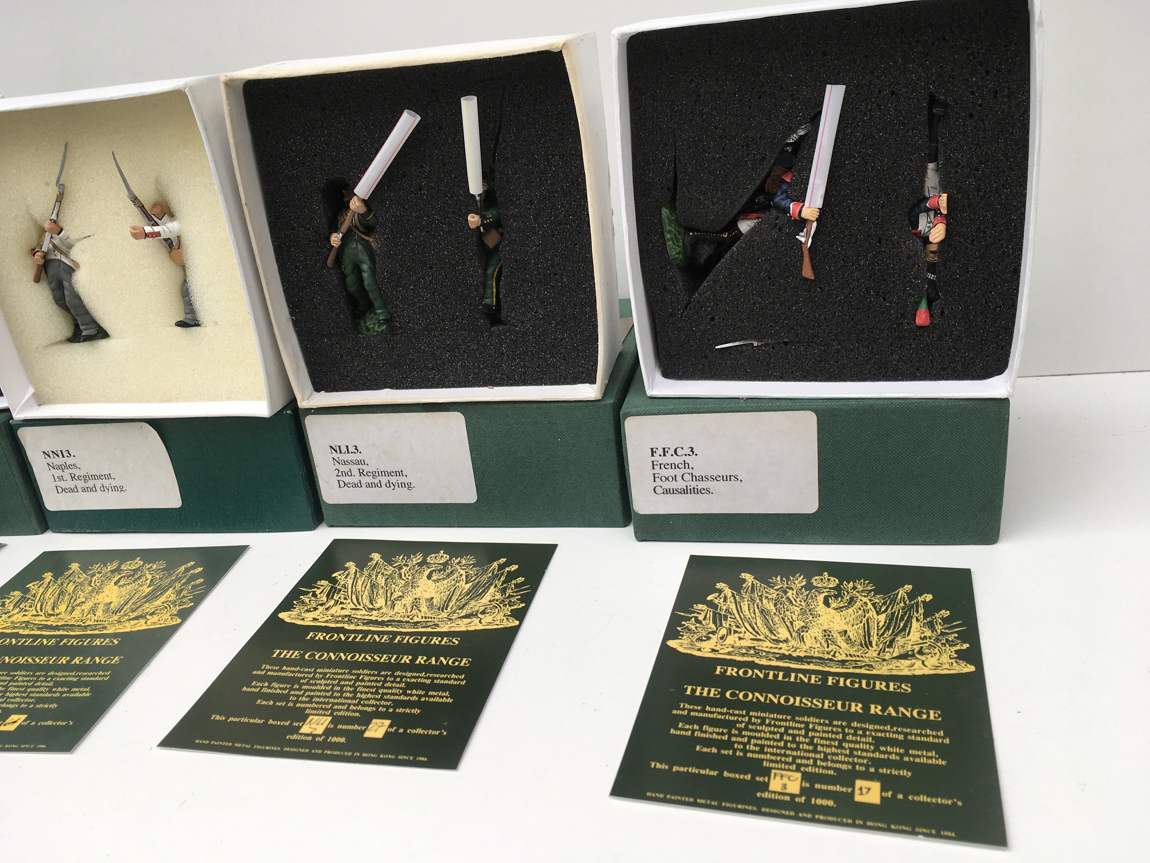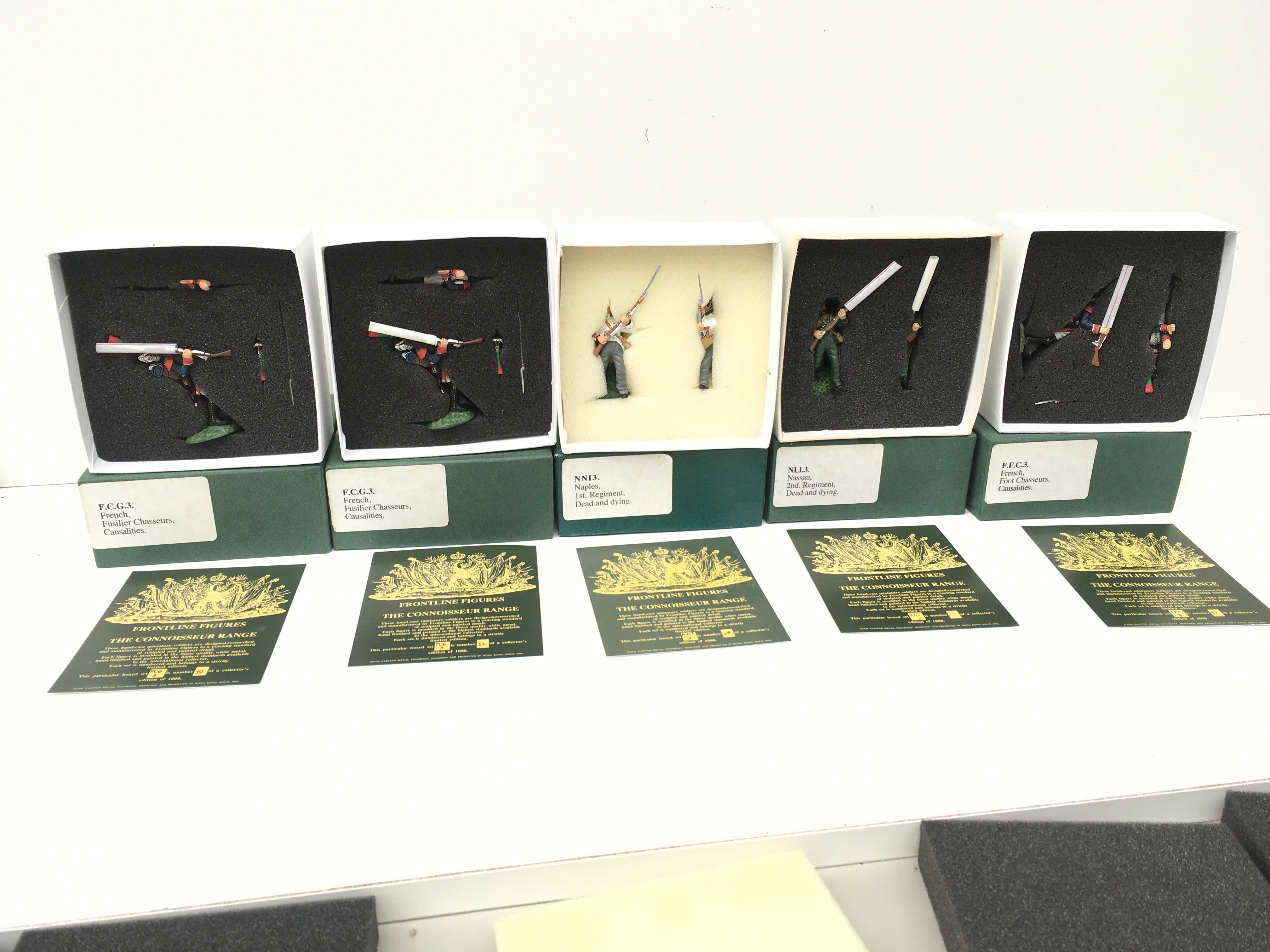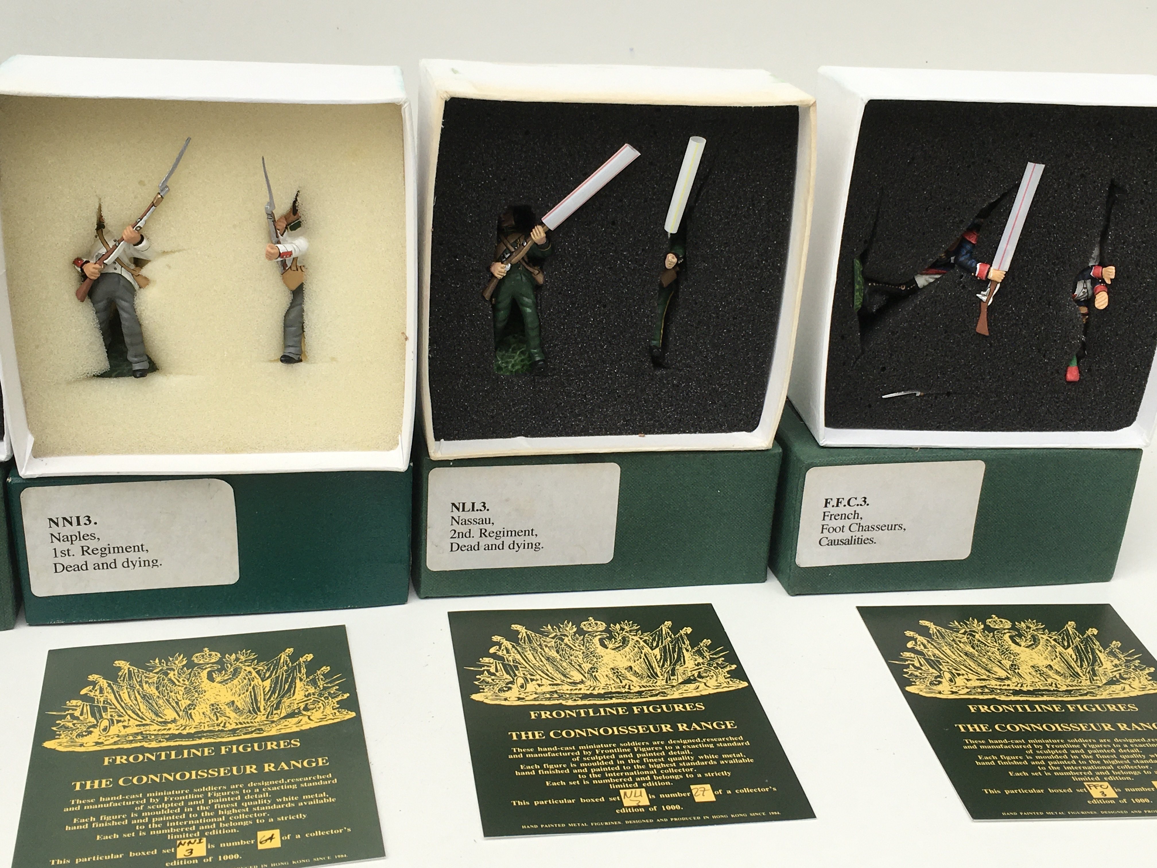 5x boxed Minature military models by Frontline Figures featuring FGC3 x3. NLI3 and NNI3. All are casualties.