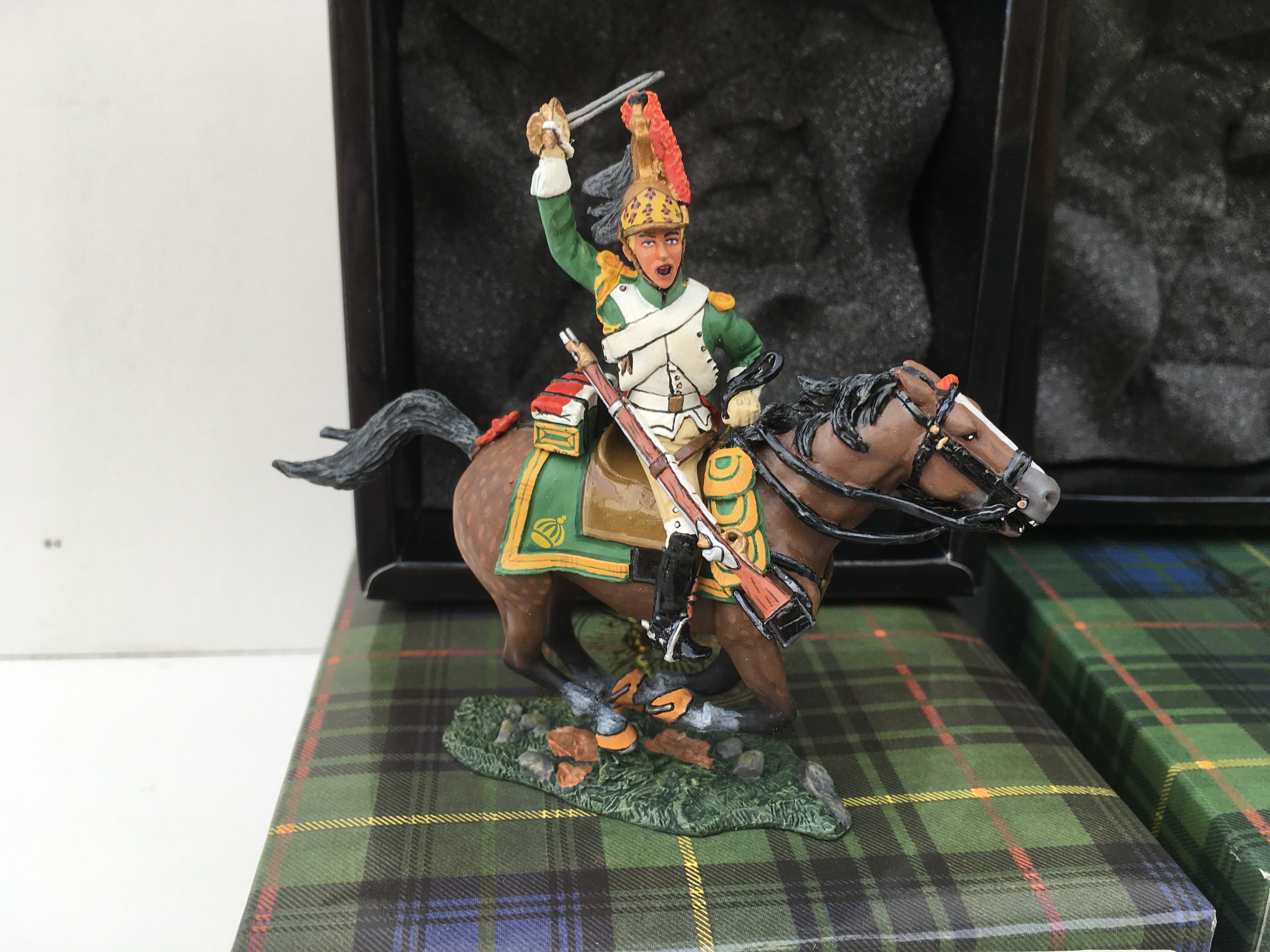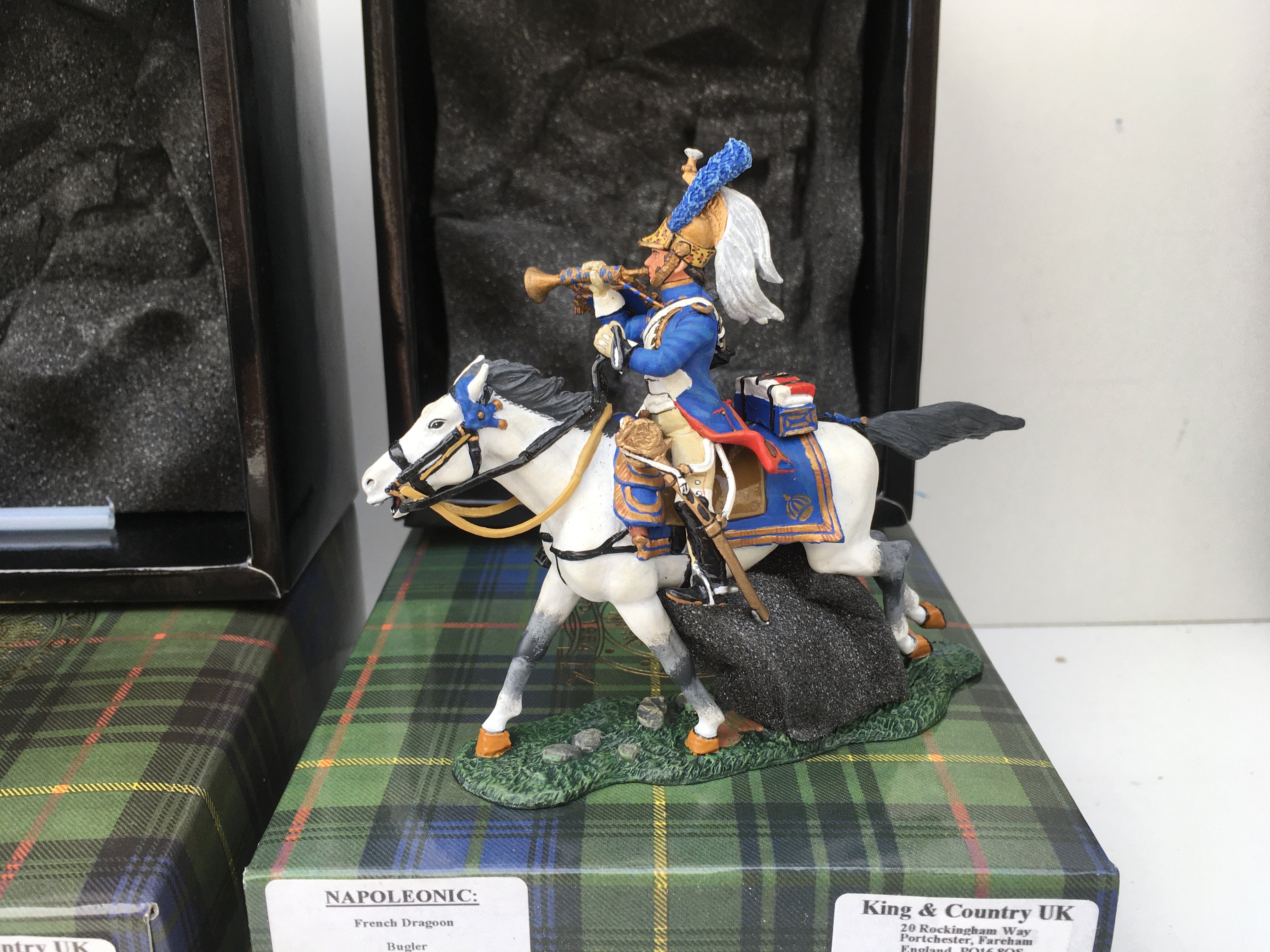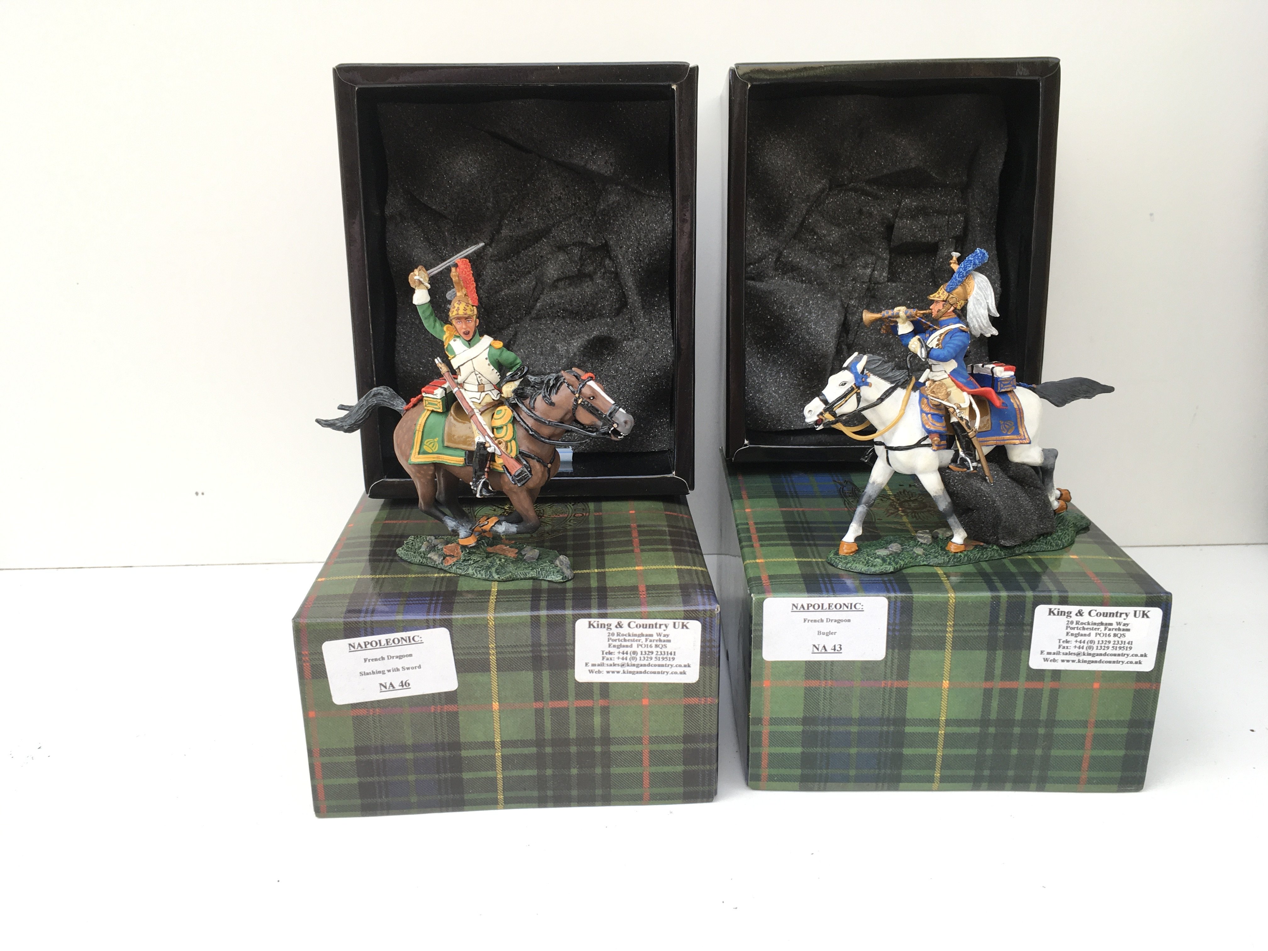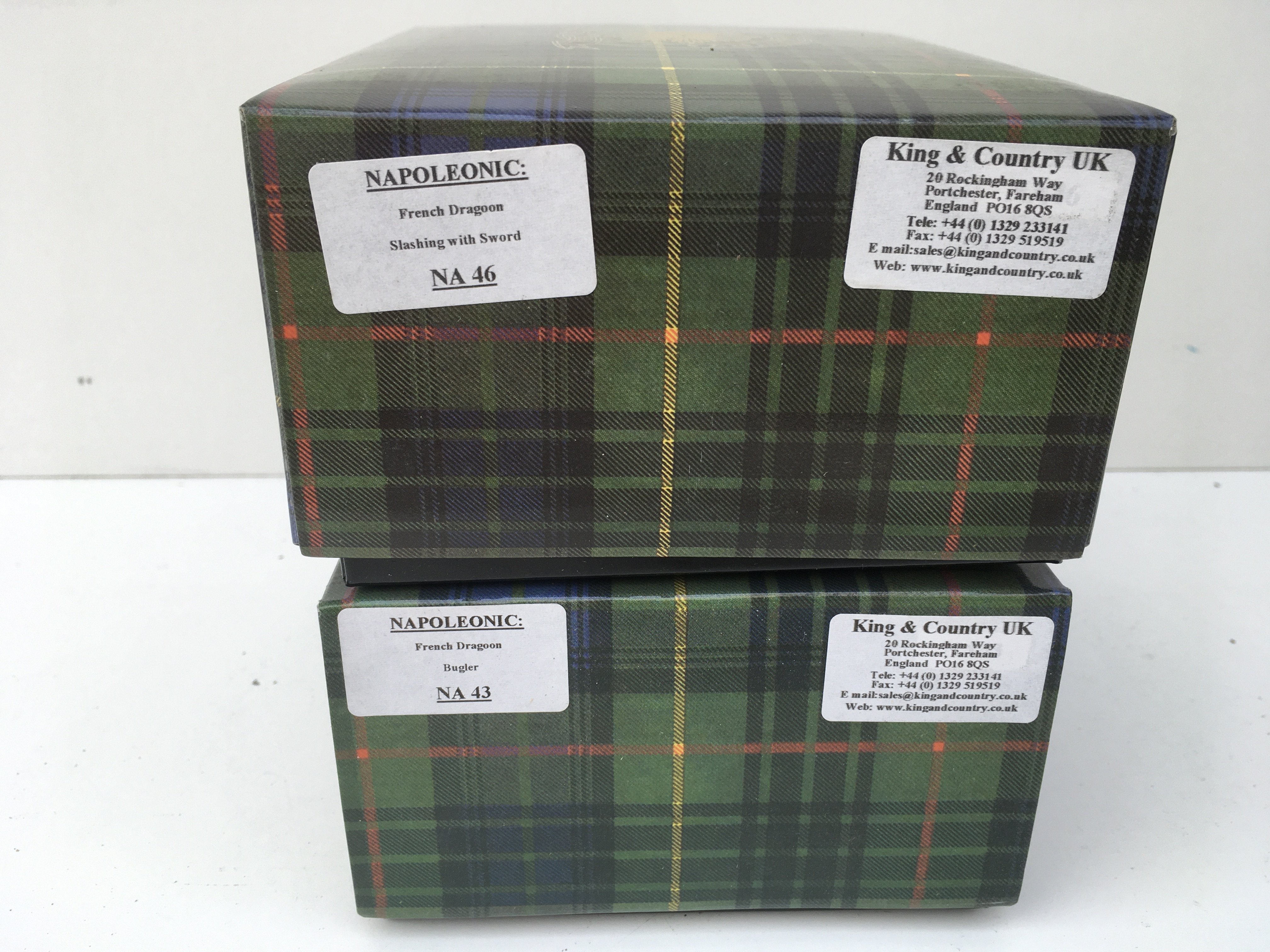 2x boxed King and Country Napoleonic Minature military models featuring NA46 French Dragoon slashing with sword and NA43 French Dragoon Bugler. No reserve.