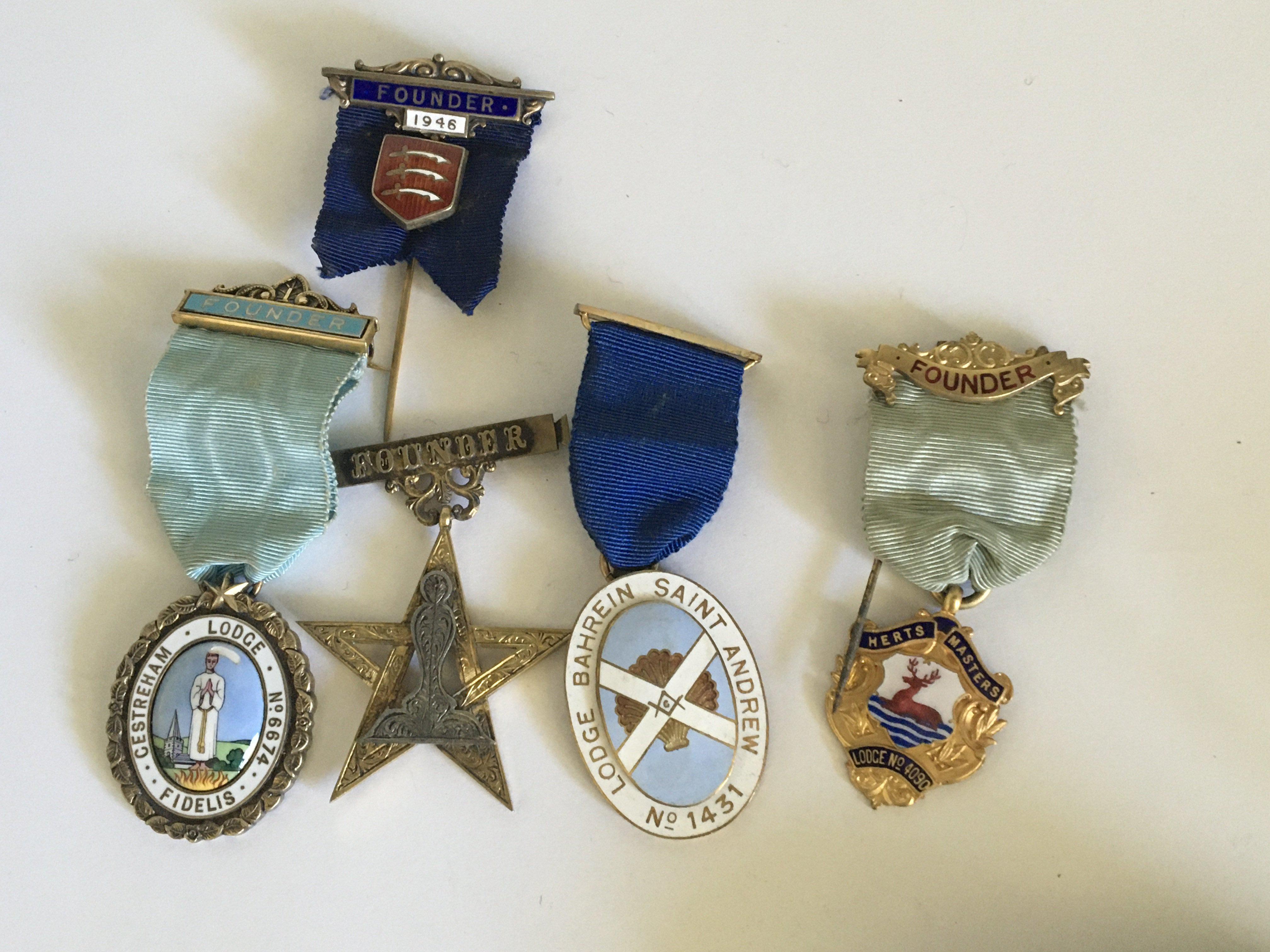 Four enamel and gilt metal Masonic Founders Jewels Bahrain Saint Andrew Herts Masters Cestreham and others some silver. (5)