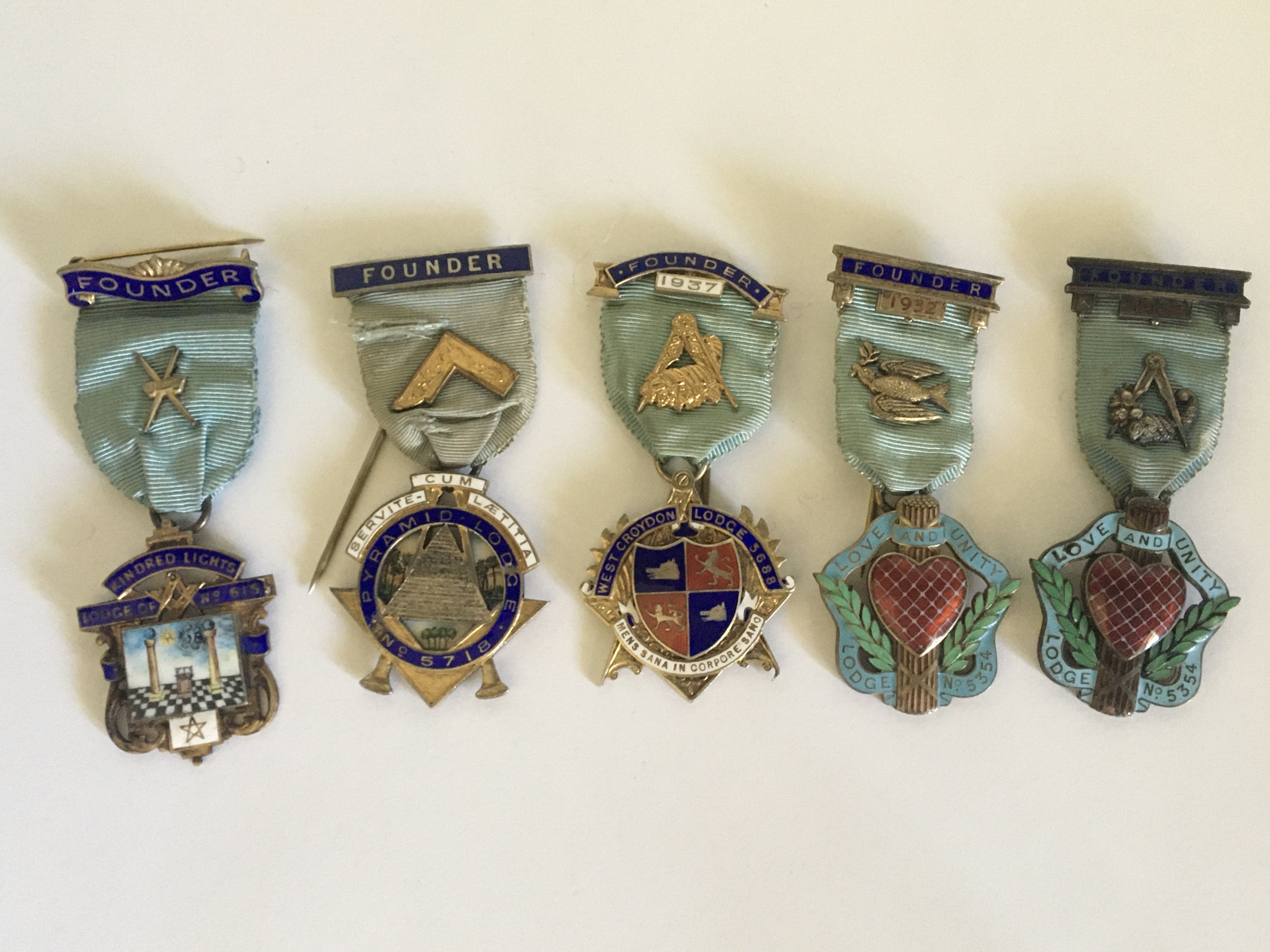 Five Masonic Regalia Founder Jewels 1932 Love and unity Lodge 1937 west Croydon kinder lights pyramid lodge all with elaborate enamel decoration (5)