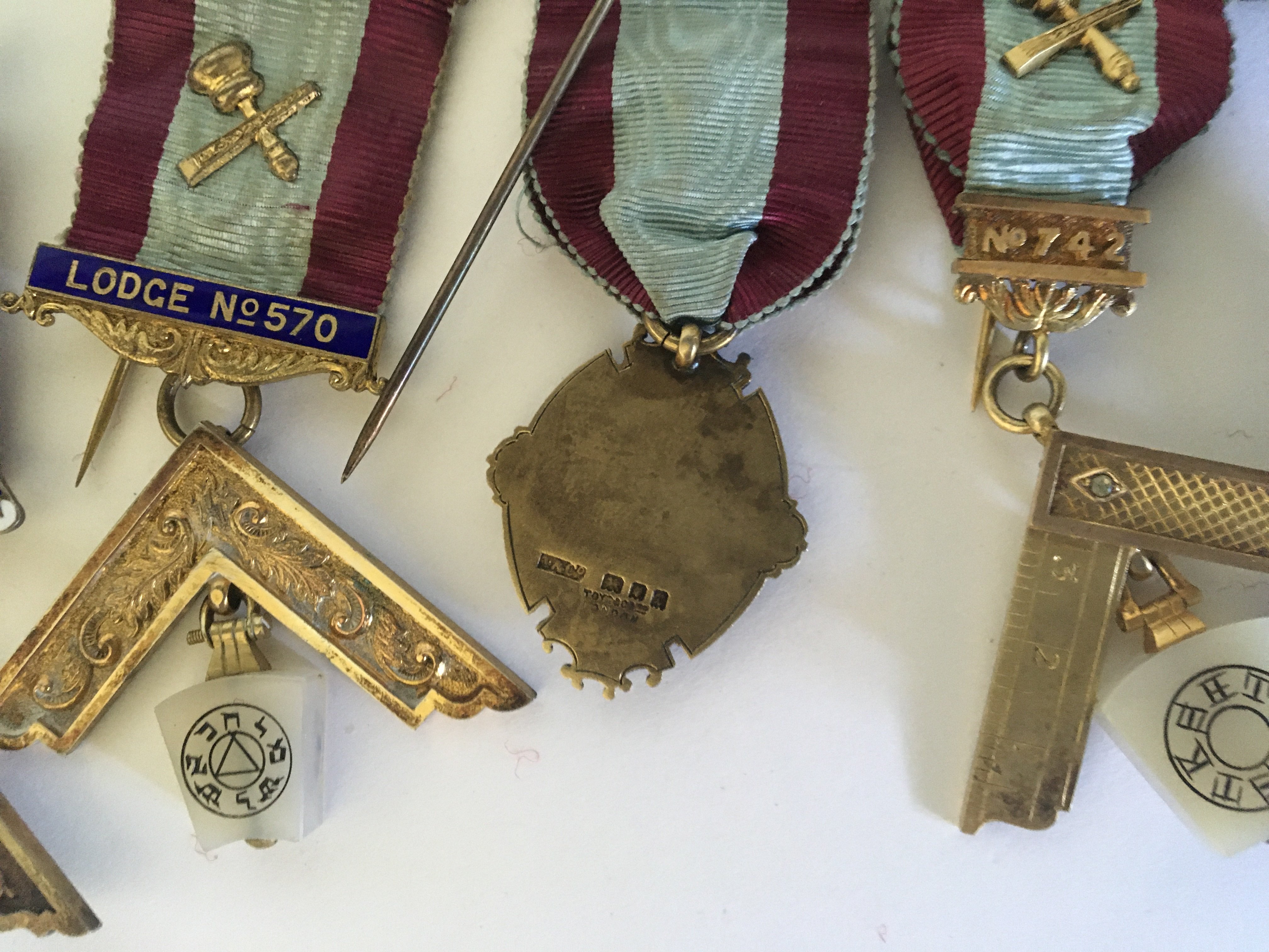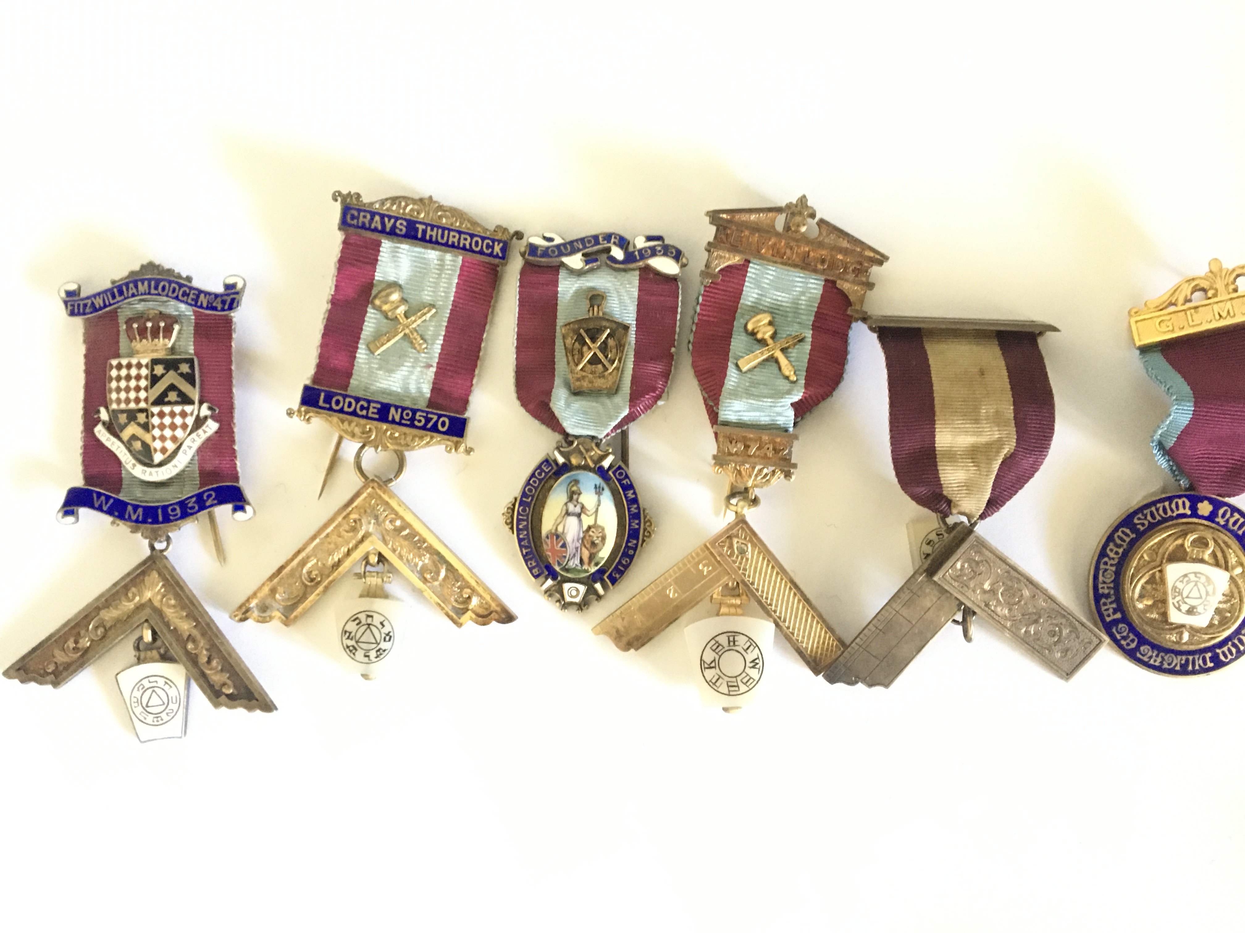 A collection of six Masonic Regalia silver gilt Jewels past master Jewels some with elaborate enamel decoration. (6)