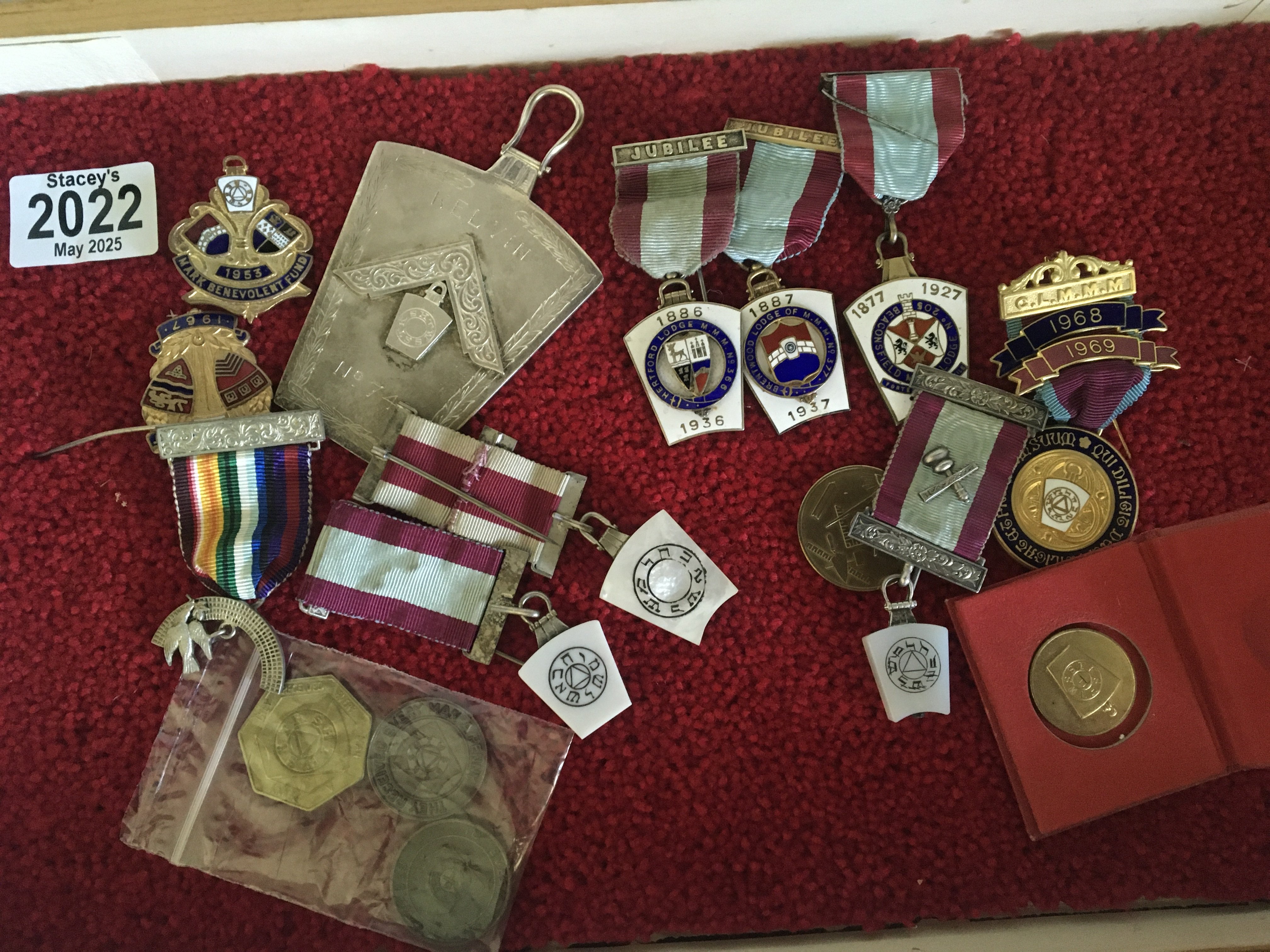 Three Masonic Regalia Jubilee recognition Jewels with elaborate decoration other Masonic badges coins and oddments.