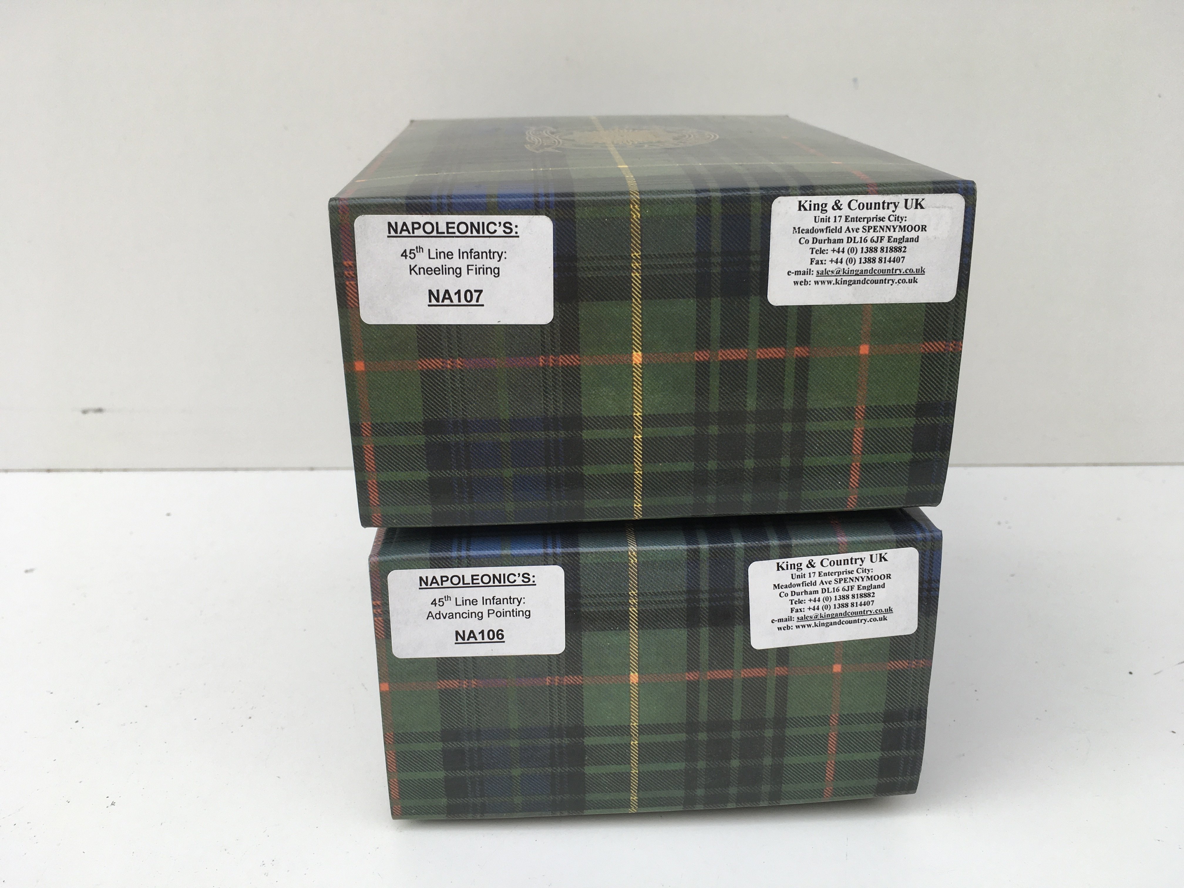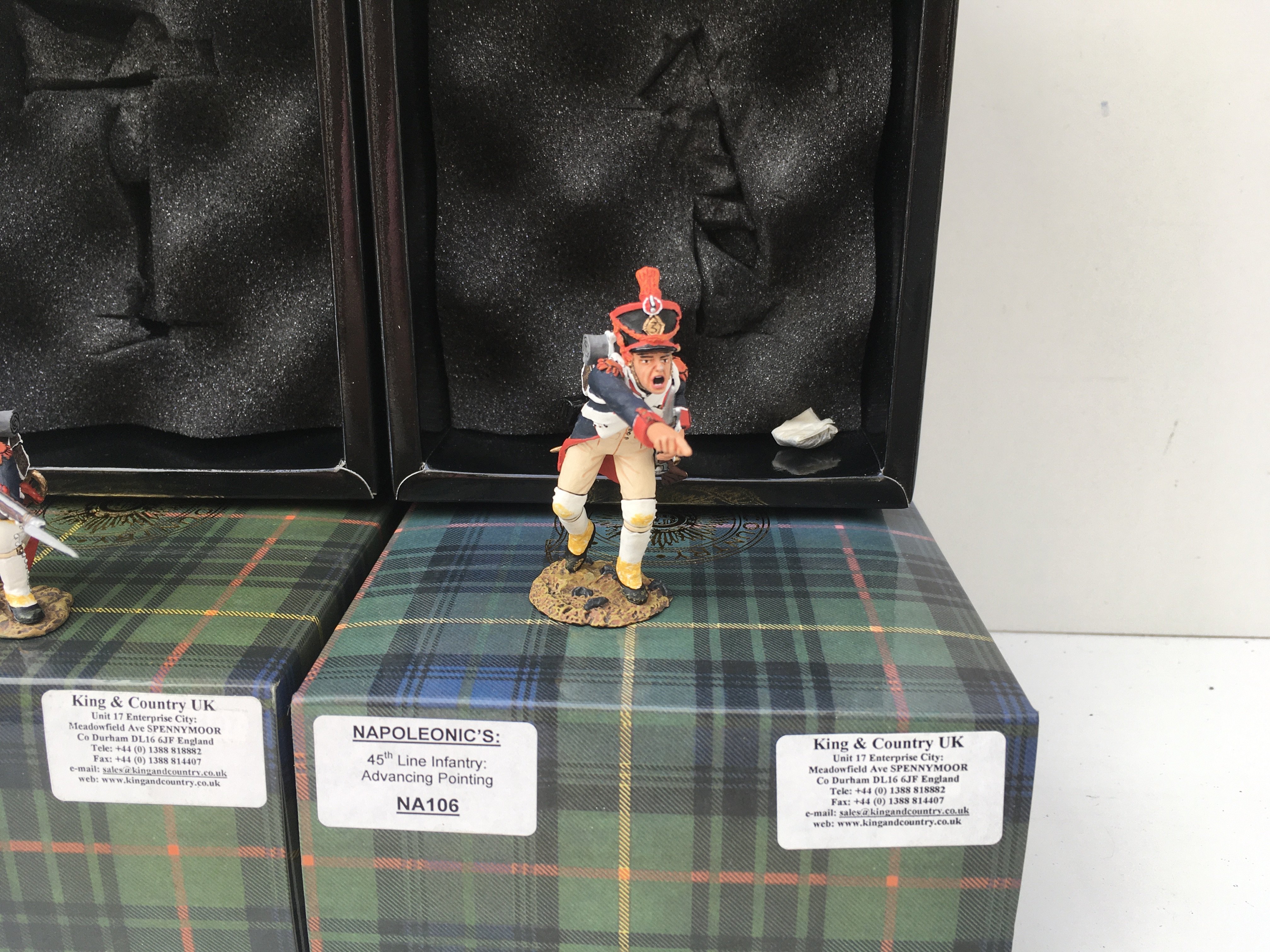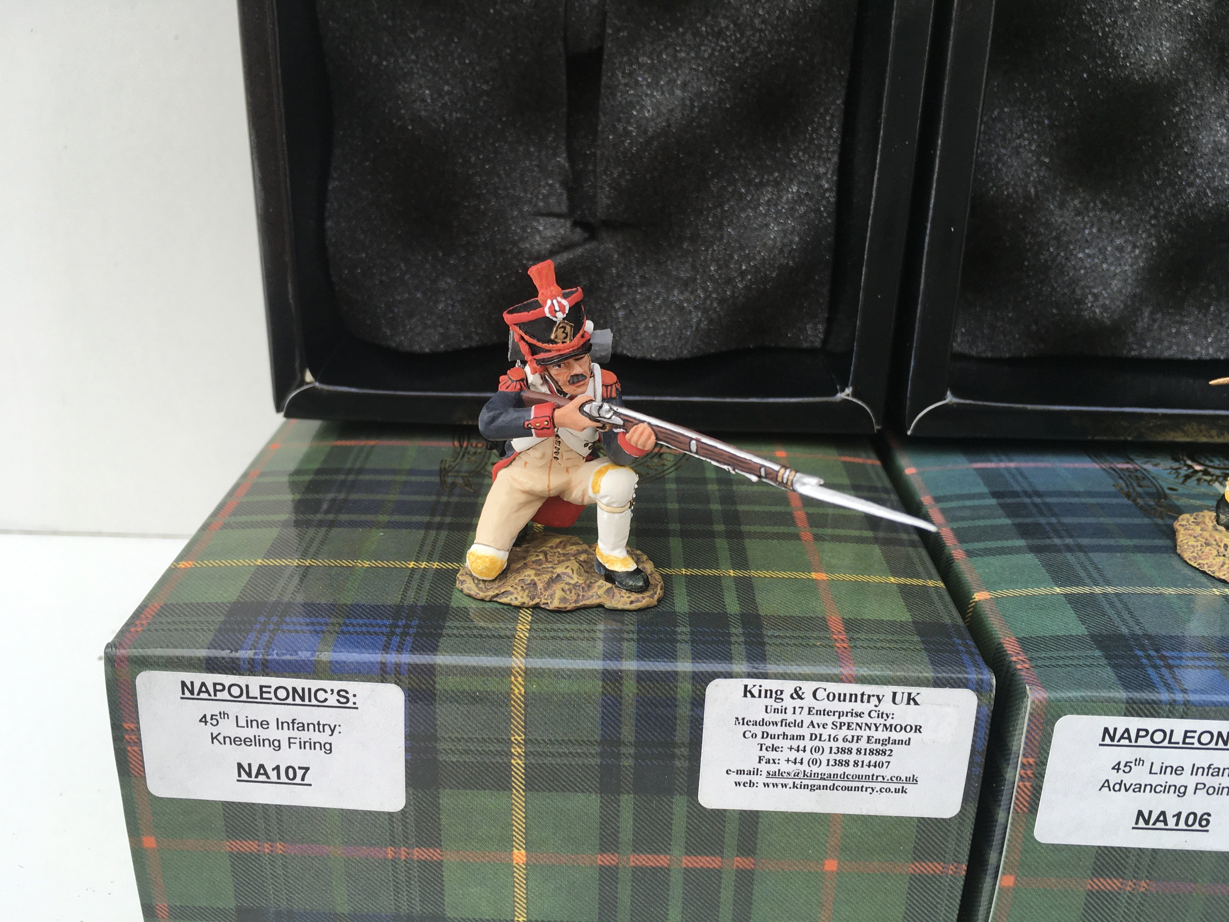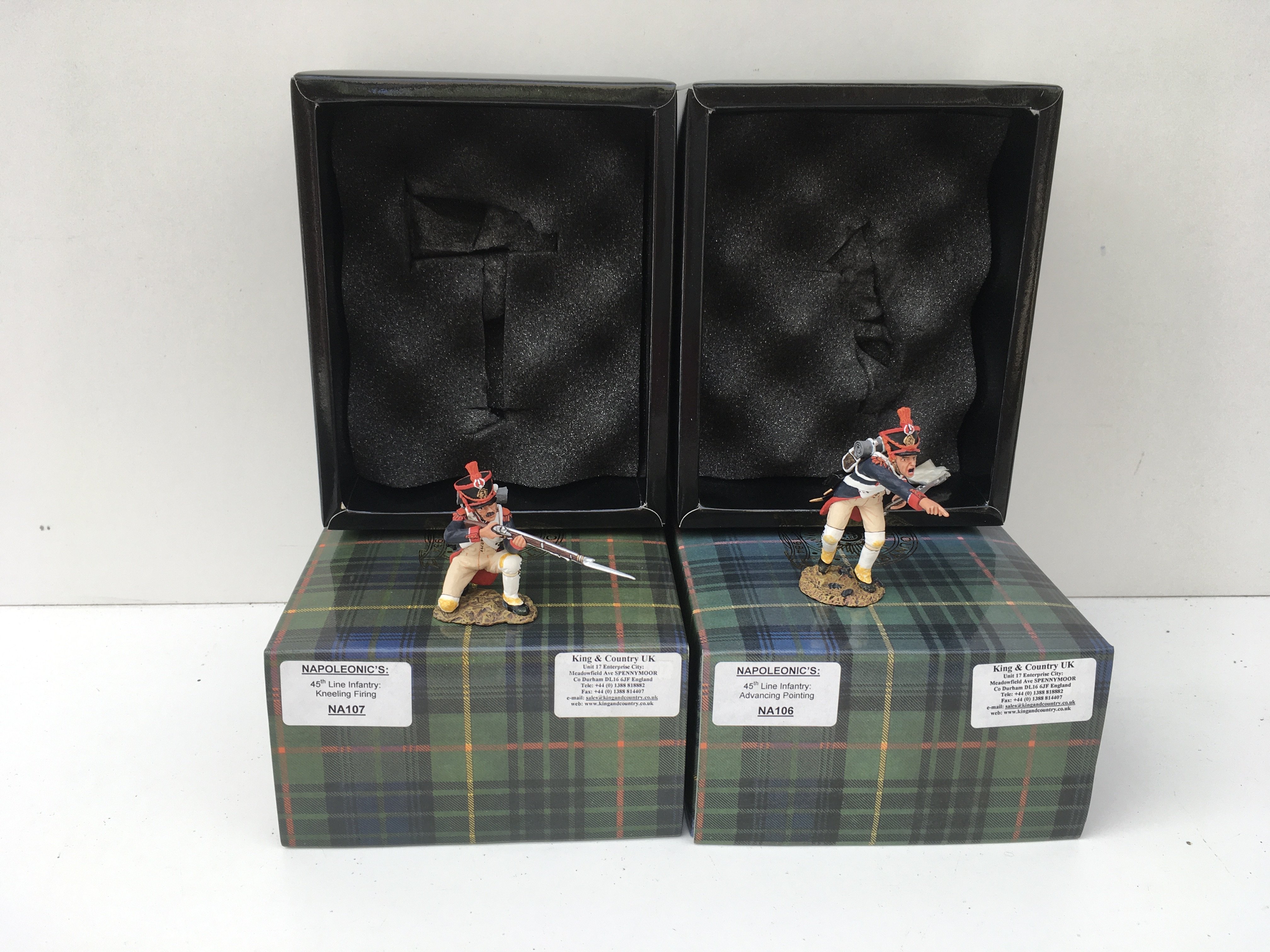 2x boxed King and Country Napoleonic Minature Military models featuring 45th Line infantry NA107 Kneeling Firing and NA106 Advance Pointing. No reserve