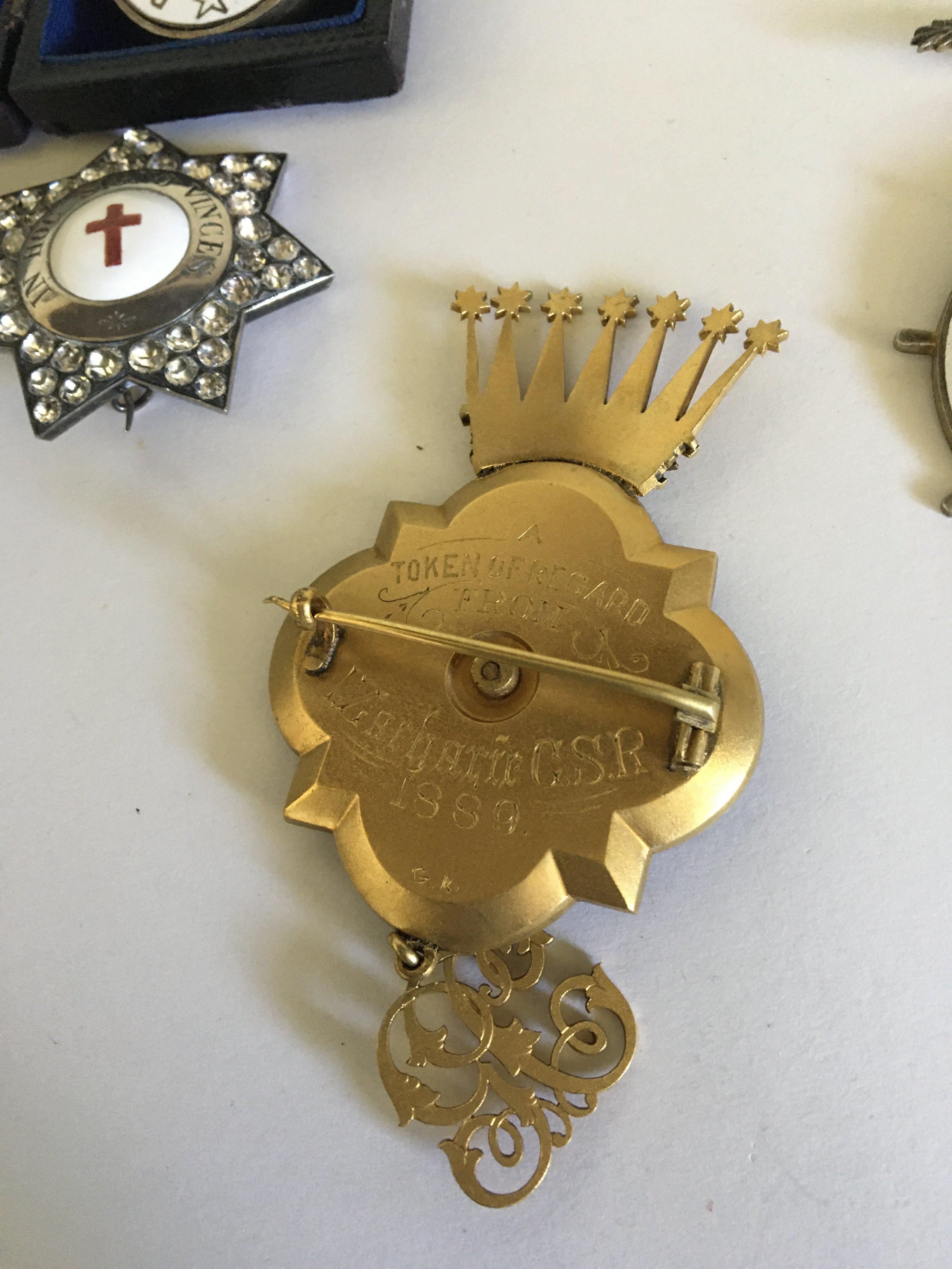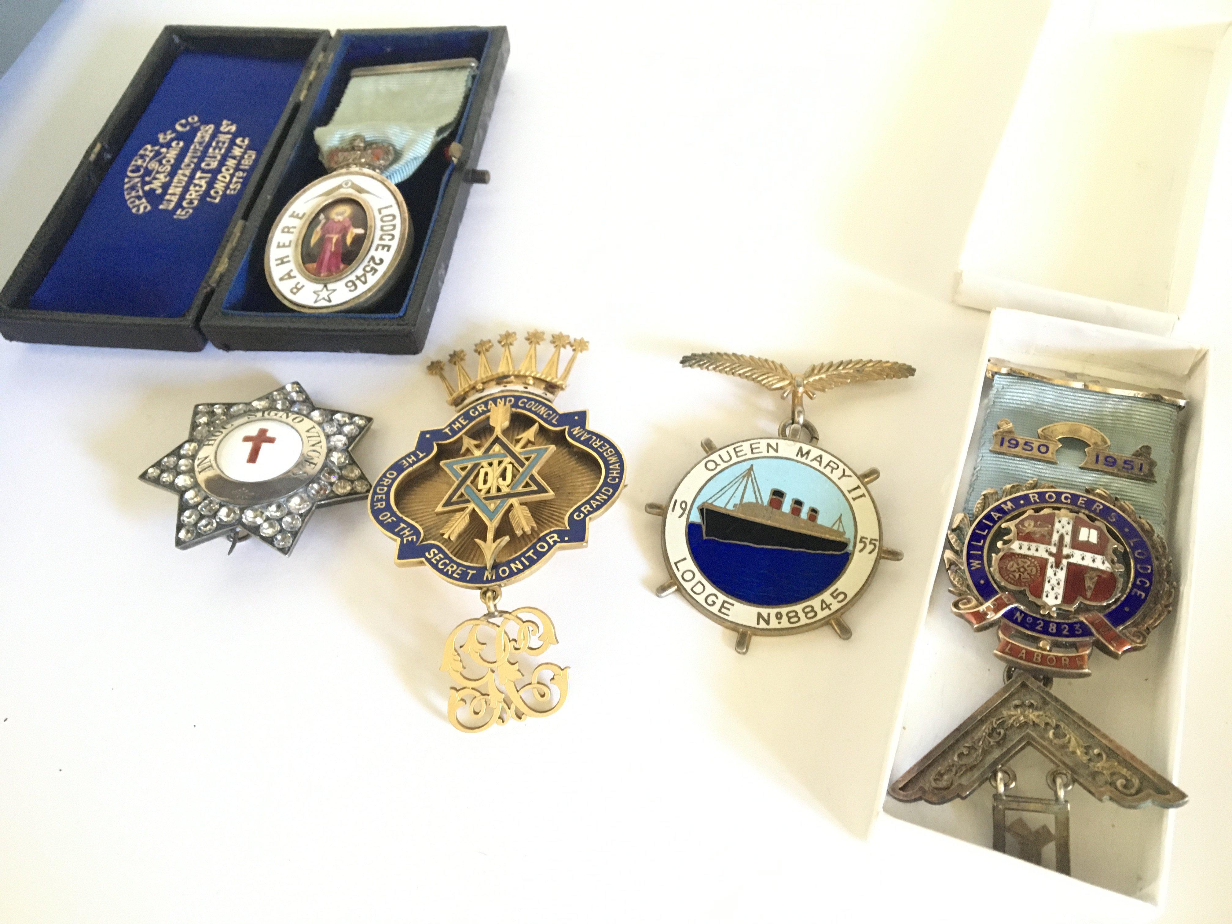 A Victorian silver gilt Masonic jewel Grand Chamberlain Order of the secret Monitor a white metal badge set with simulated diamonds 1955 Queen Mary Lodge and two others (5)