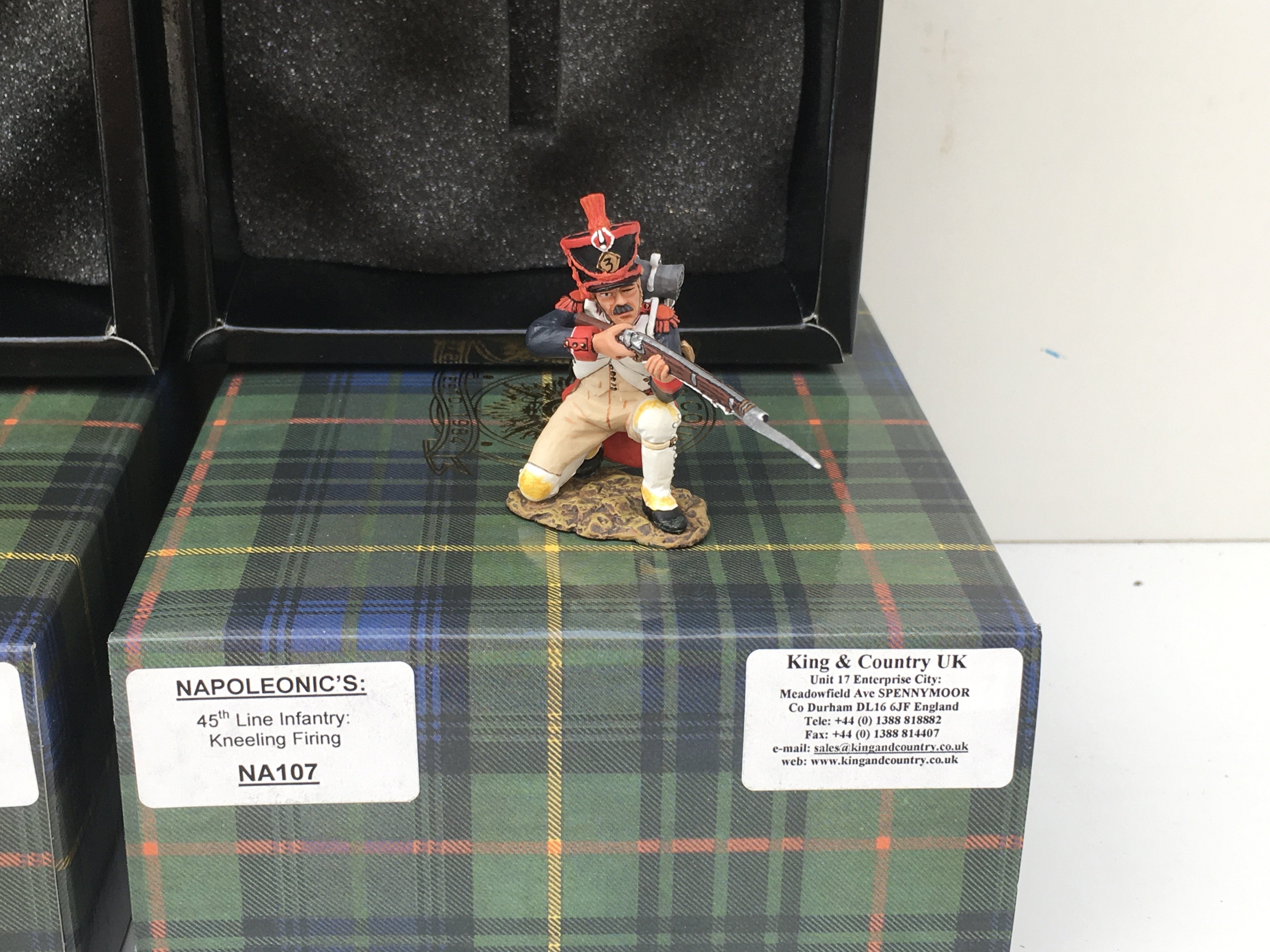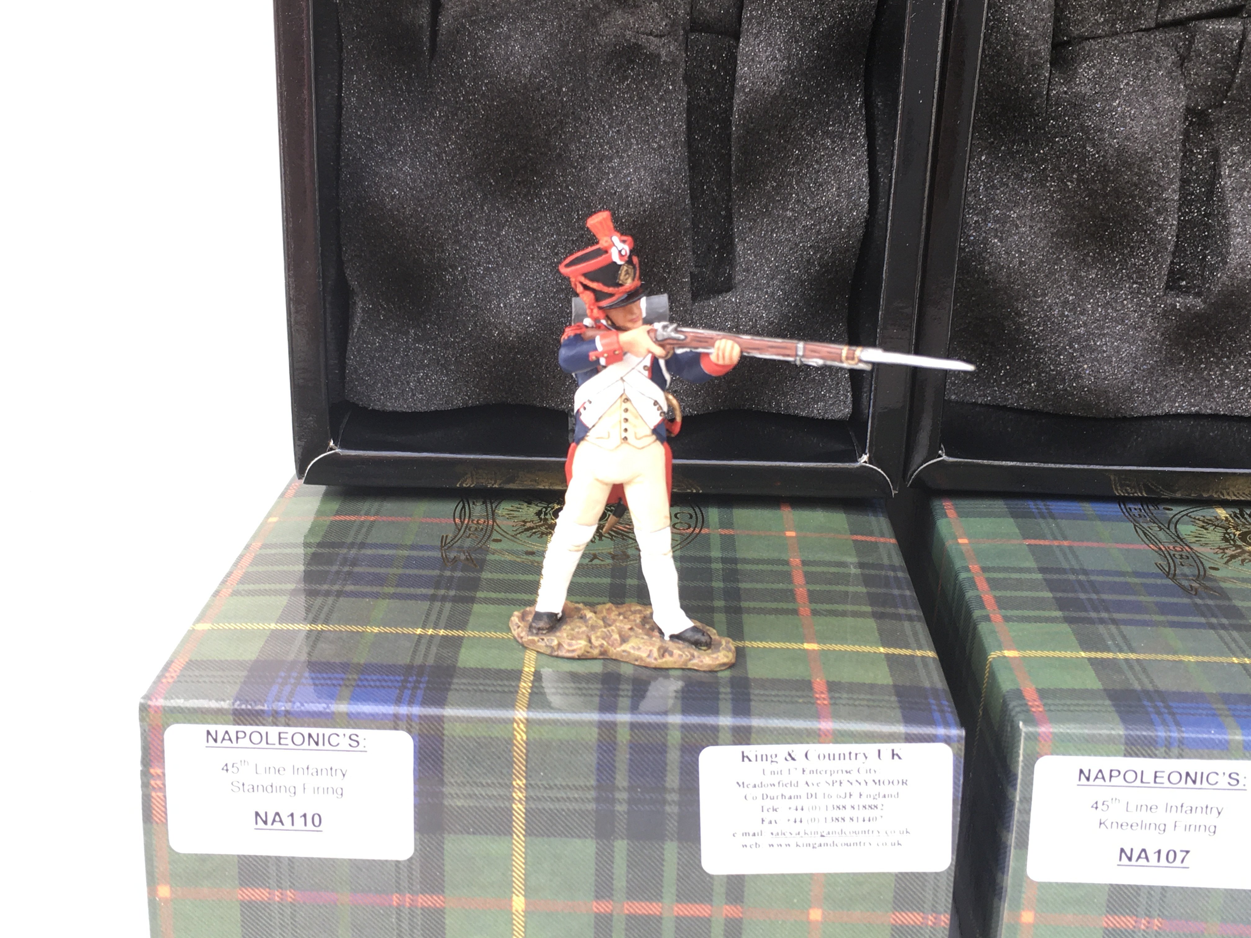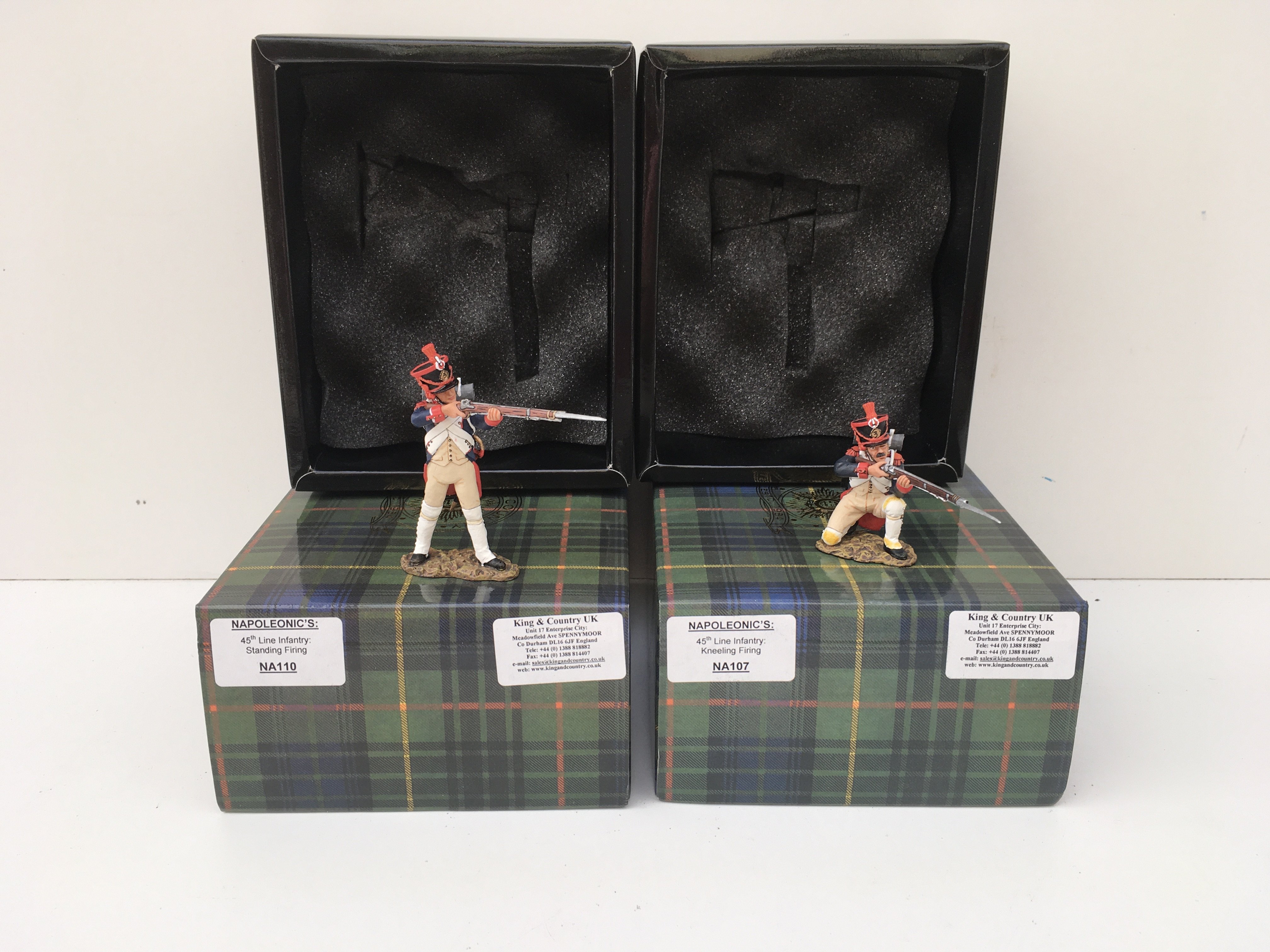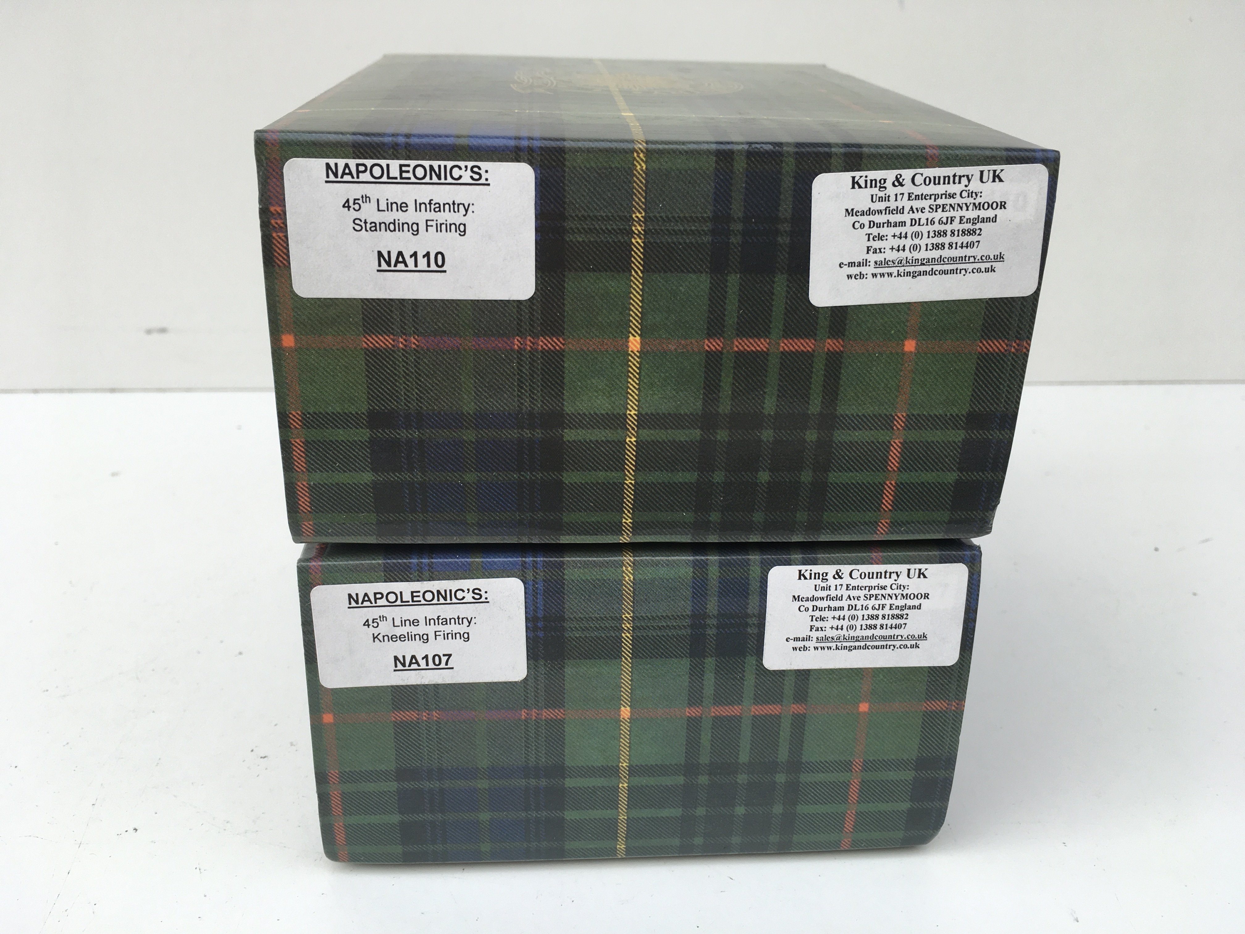 2x boxed King and Country Napoleonic Minature Military models featuring 45th line infantry including NA107 Kneeling Firing and NA110 Standing Firing. No reserve
