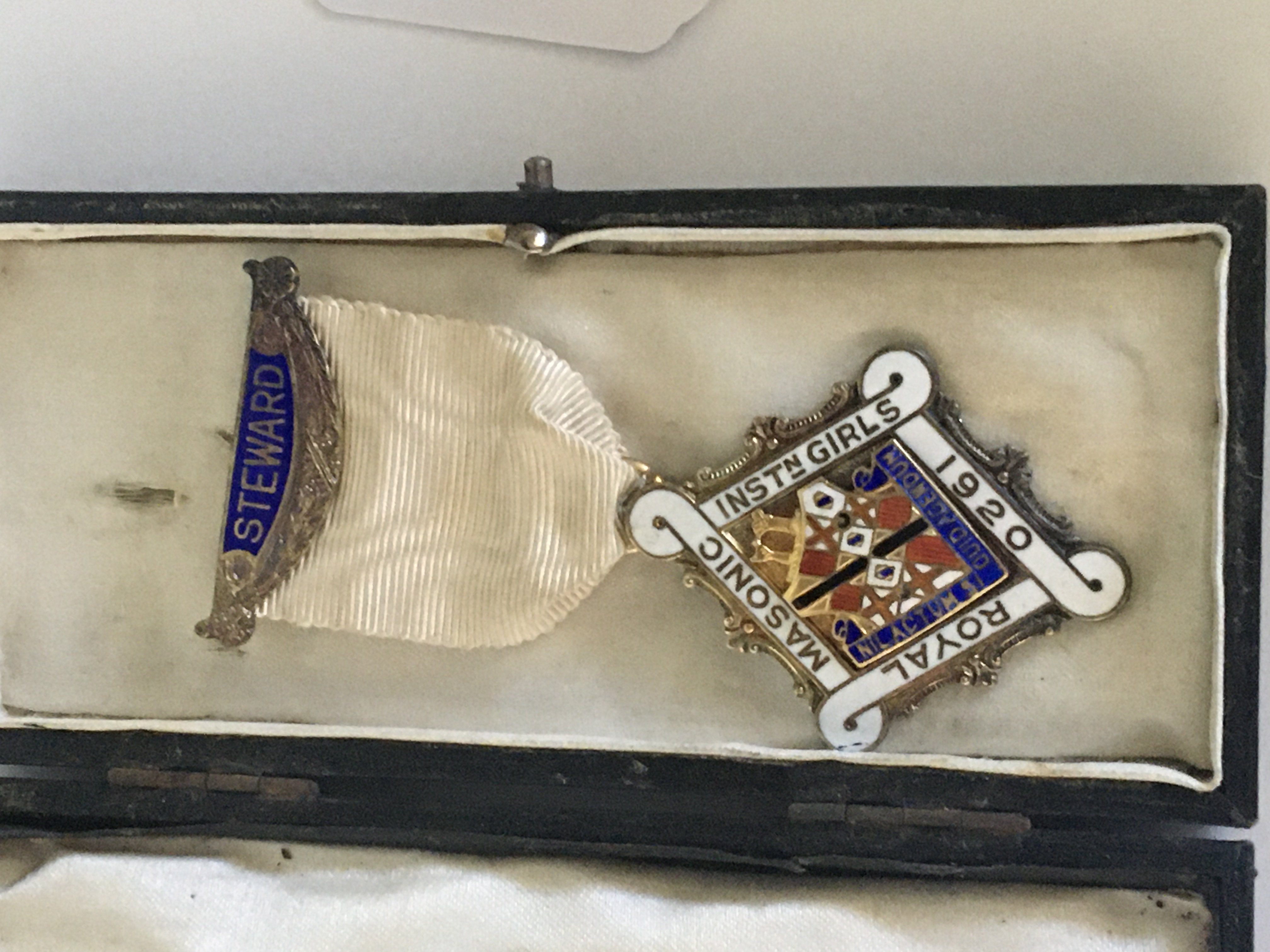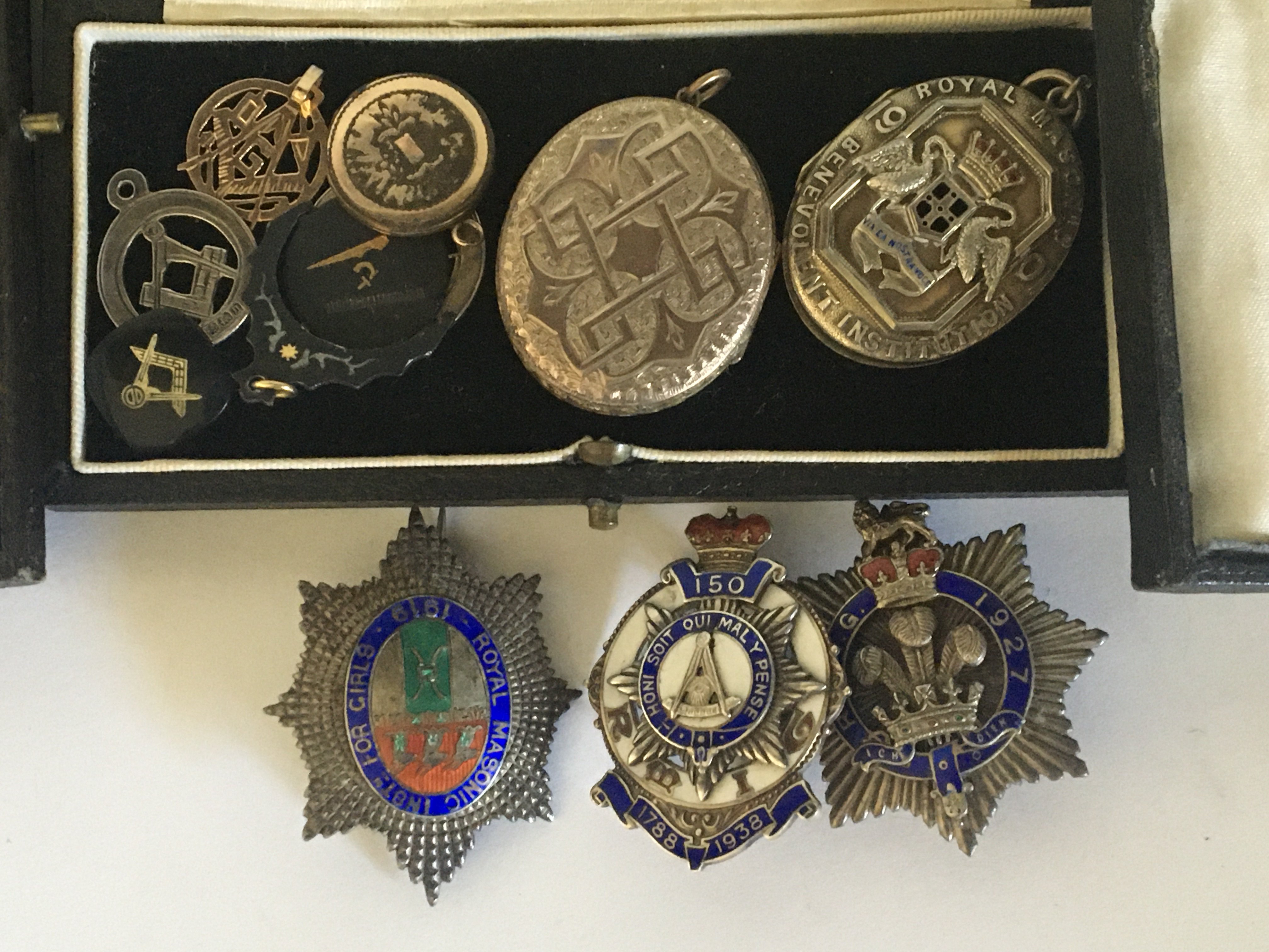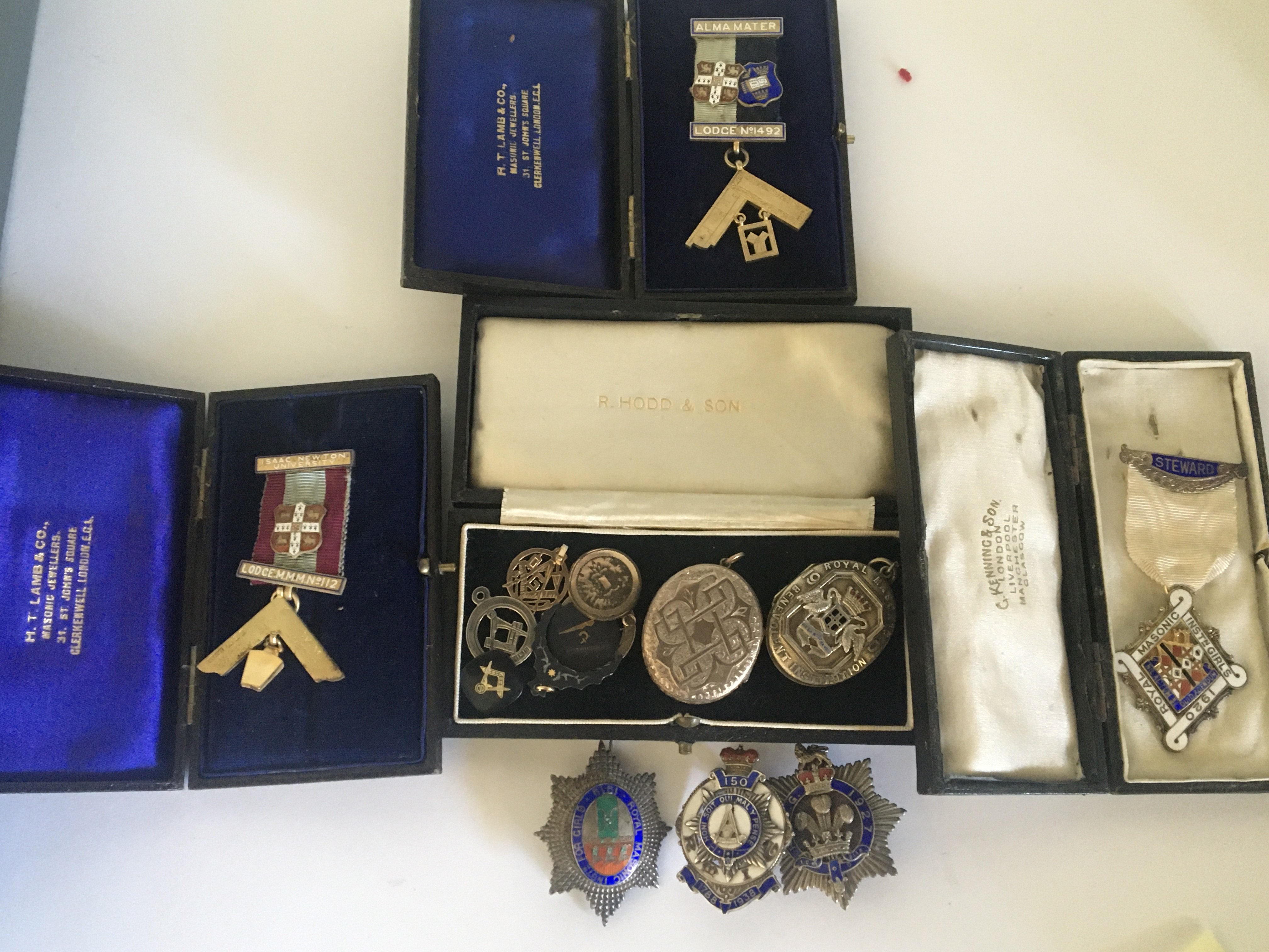 A collection of silver and enamel Masonic badges lockets and pendents and three Masonic silver gilt metal and enamel Jewels