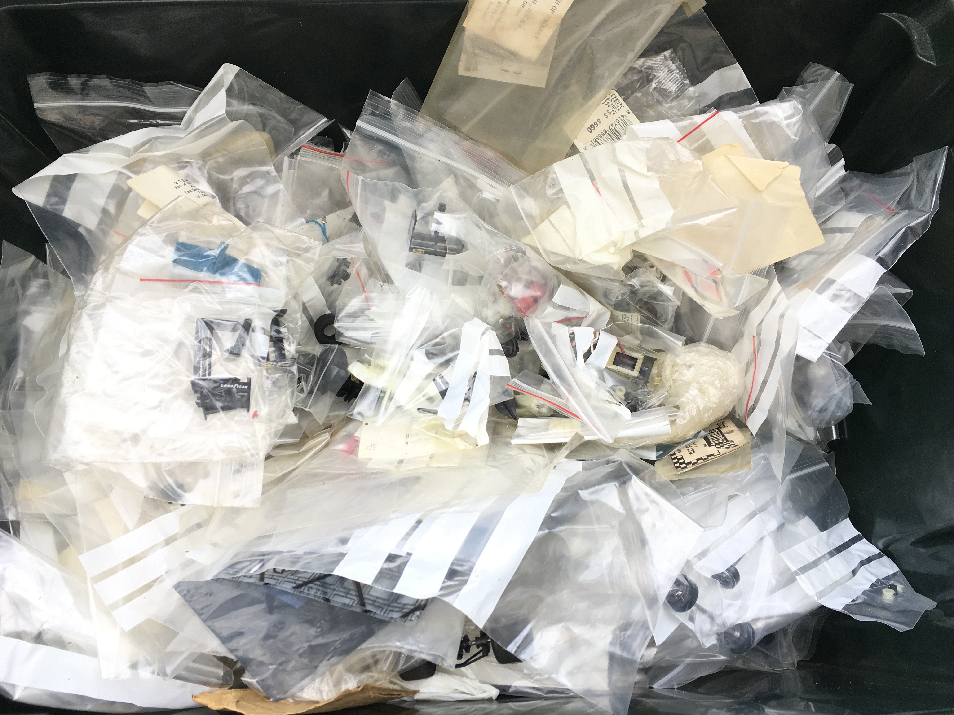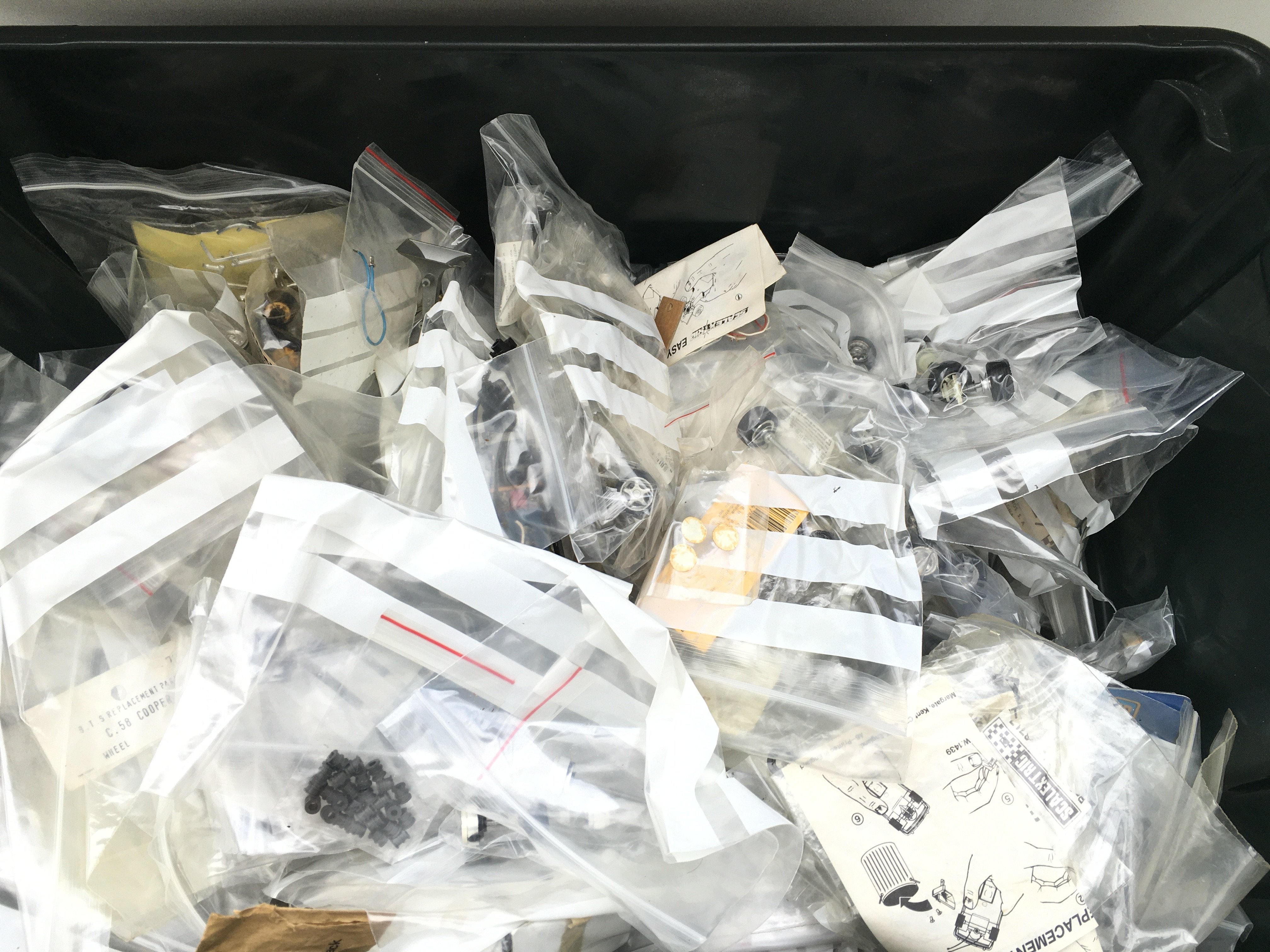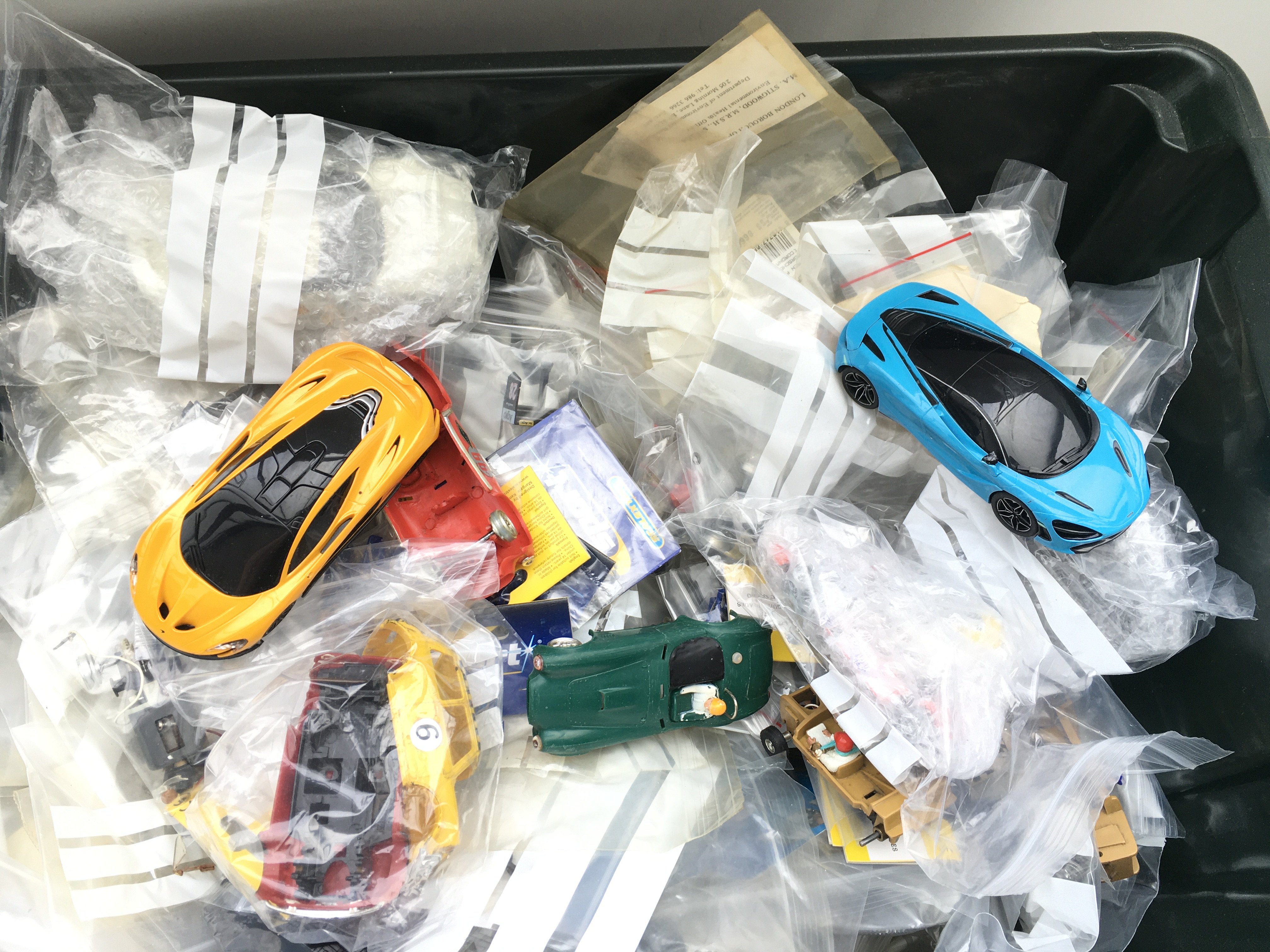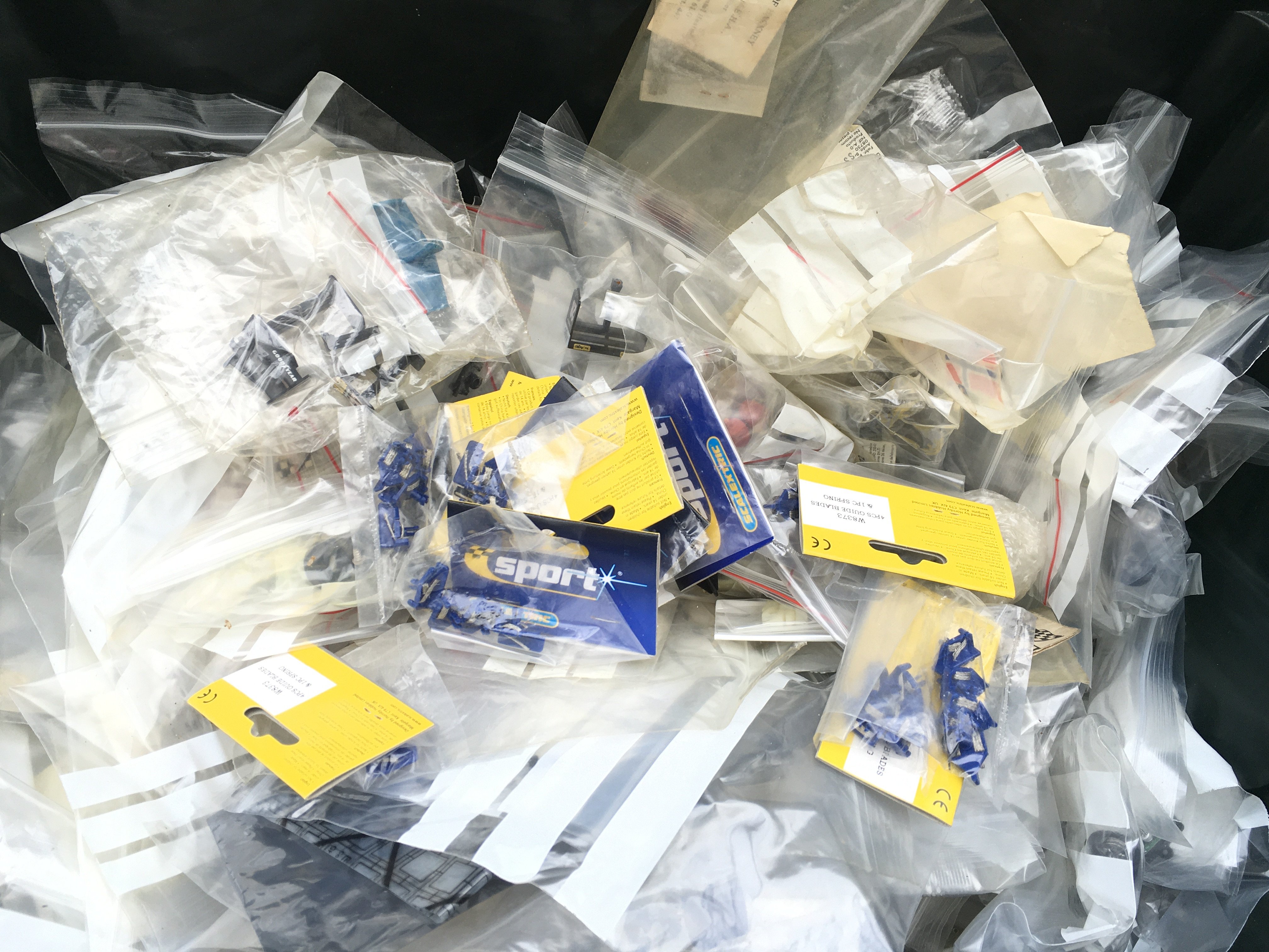A Box Containing Many Scalextric Spate Parts.