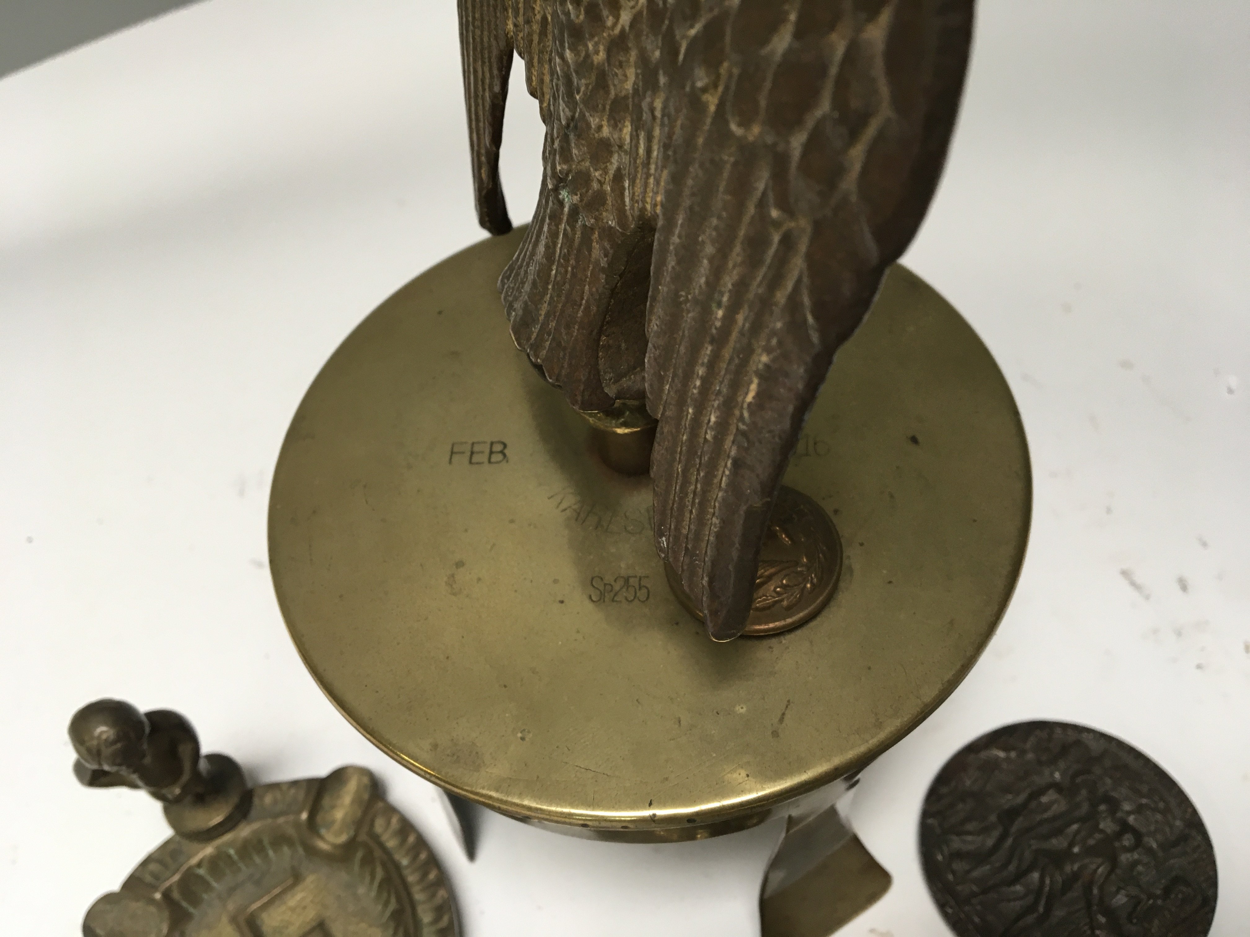A I world war trench art brass shell top dated 1916 surmounted with an eagle and buttons a Lusitania medallion and Third Reich ash tray and nut cracks. (4)