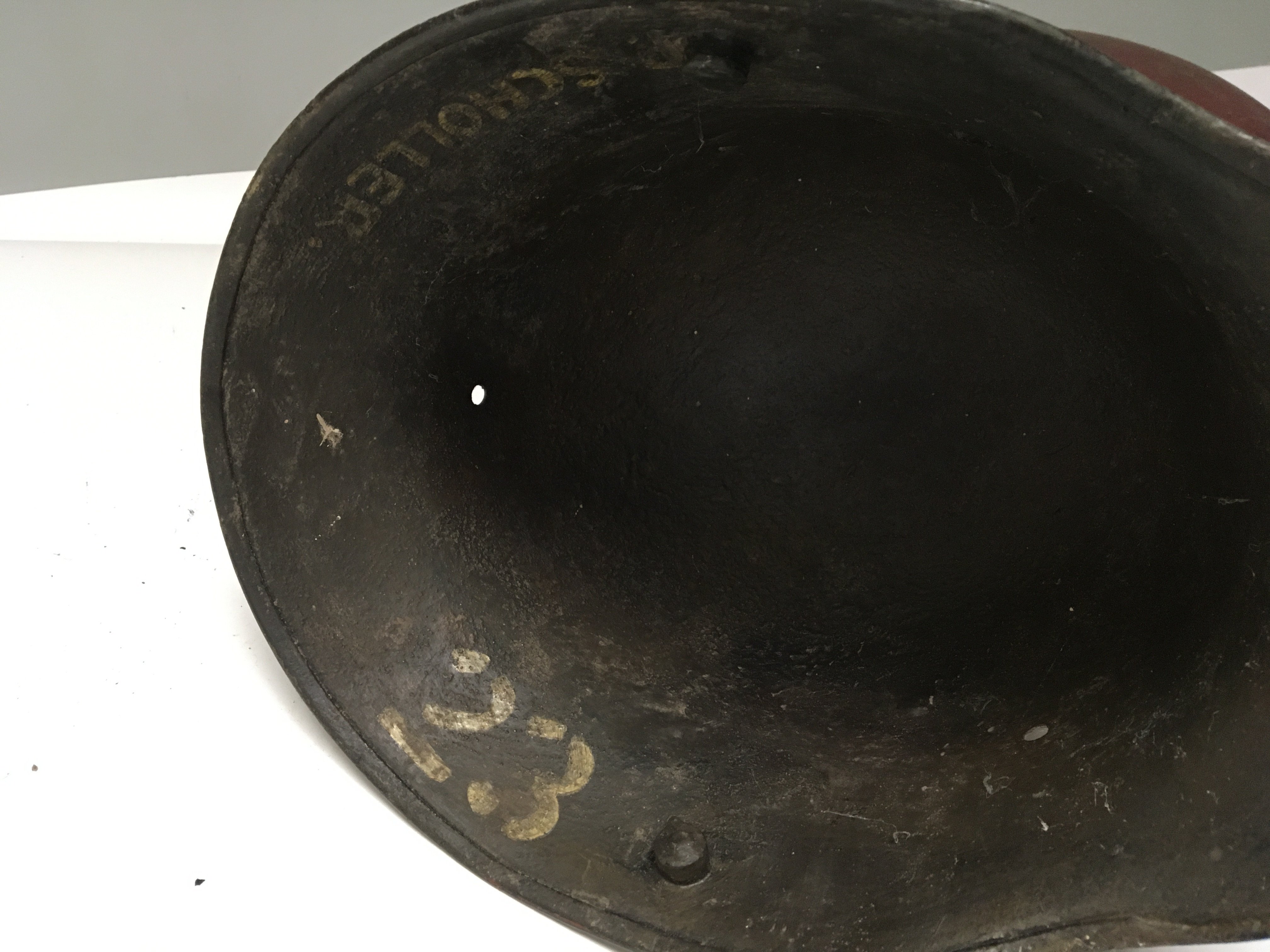 A Genuine I world war German Imperial Army steel combat helmet M-16 with painted internal name and number and a Post Second World War German red firefighter helmet (2)