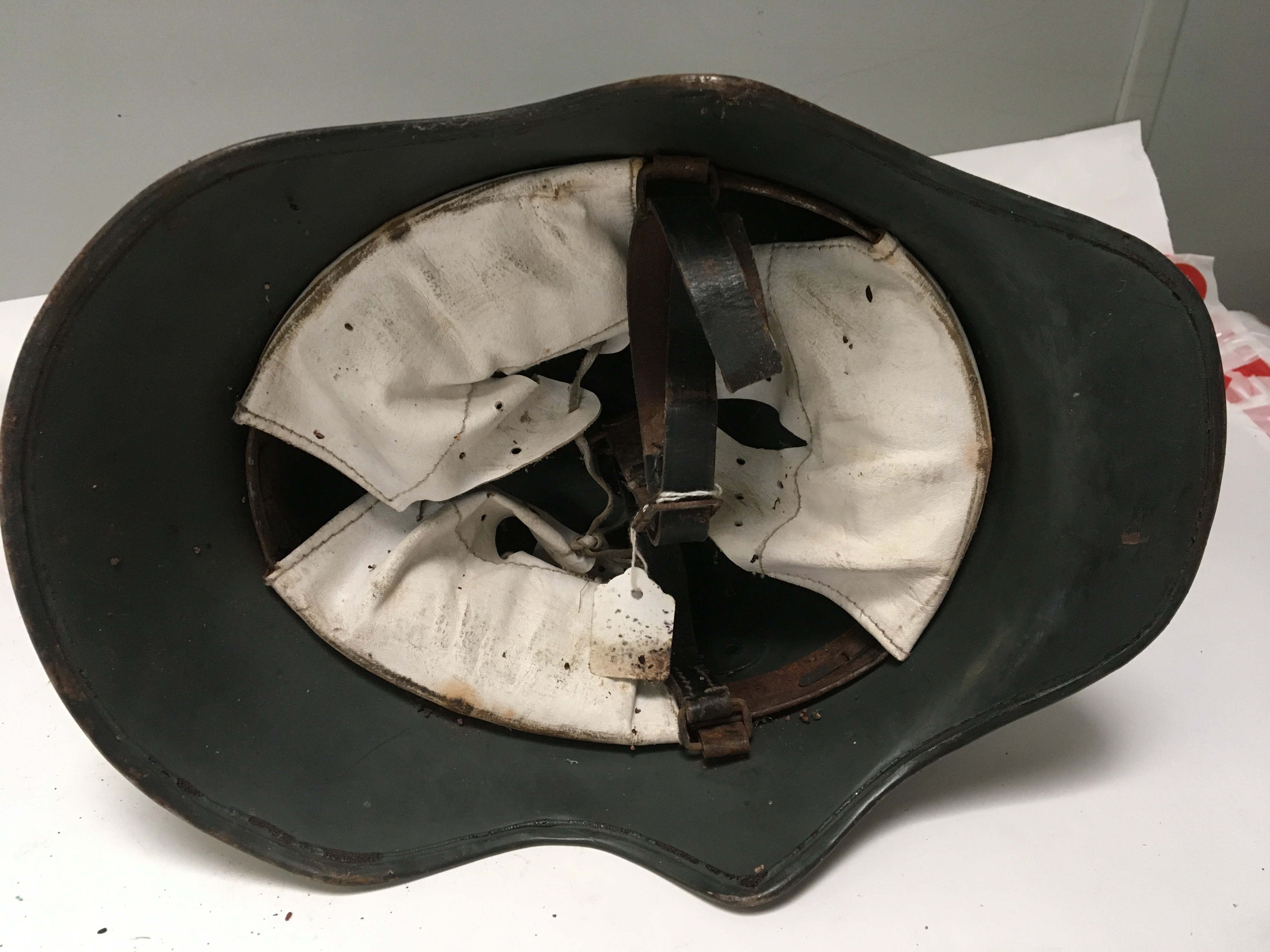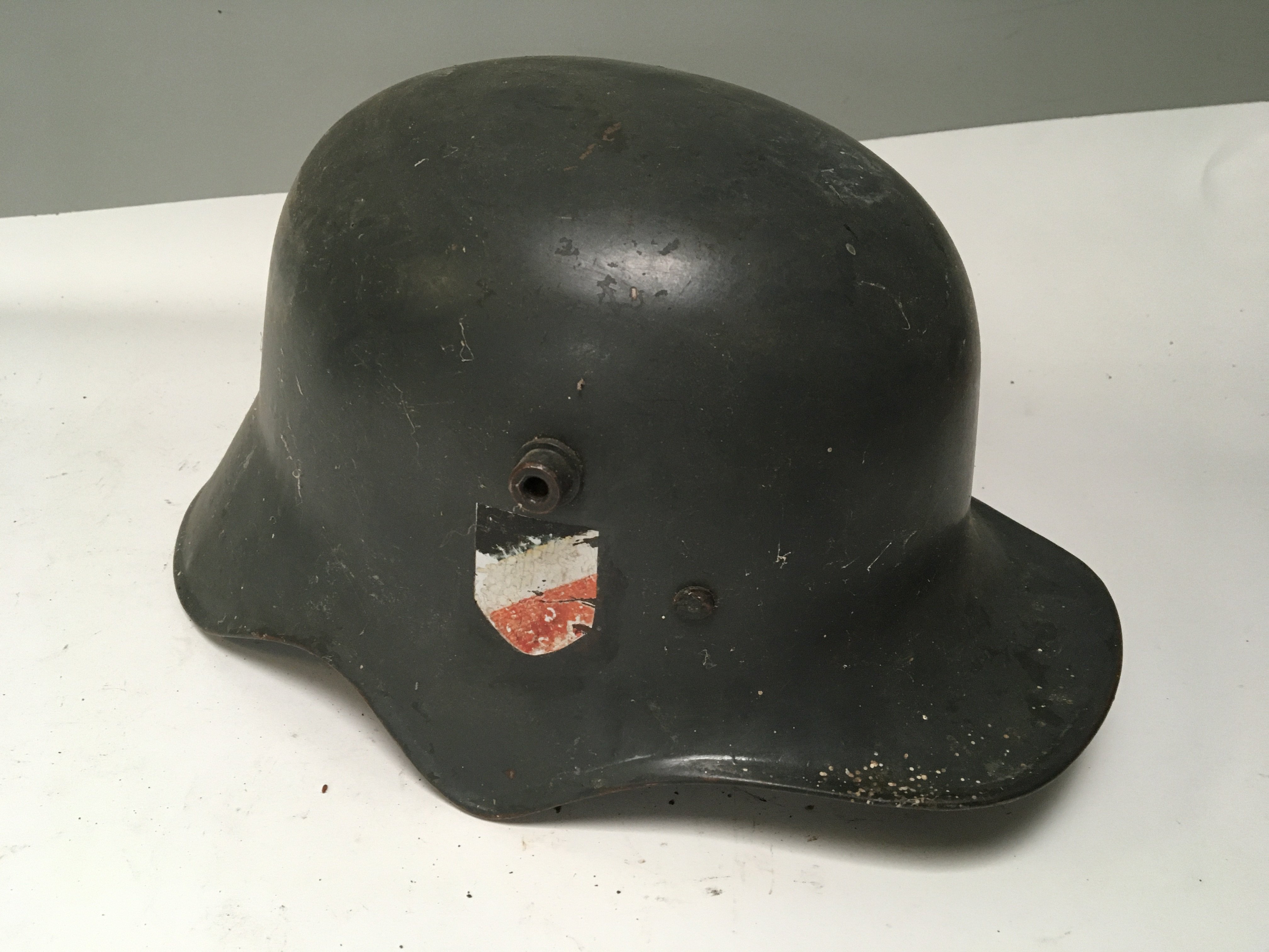 A rare German Transitional Cavalry or Telegraphists helmet. The M-18 helmet has a shaped edge to allow the cavalry soldiers to hear orders whilst in a battle charge. This is a rare genuine example of a transitional helmet used in both I and II world war the helmet with German Third Reich decals folded edge and unusual white liner.